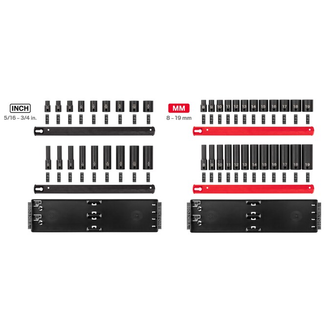 - 24-pc 3/8 inch drive standard and deep 12-point metric impact sockets: 8, 9, 10, 11, 12, 13, 14, 15, 16, 17, 18, 19 mm