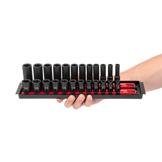 - 24-pc 3/8 inch drive standard and deep 6-point metric impact sockets: 8, 9, 10, 11, 12, 13, 14, 15, 16, 17, 18, 19 mm