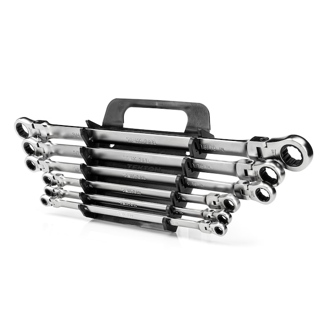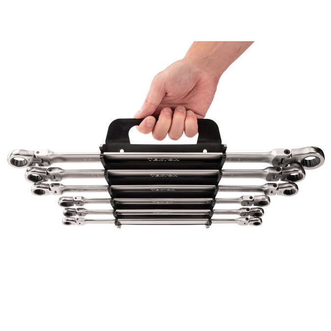 Each Tekton long ratcheting flex head wrench is permanently marked with both a high-visibility laser marking and a stamped marking for easy size identification. The 12-point box end fits multiple types of fasteners including 6-point, 12-point, and square. The flex head sweeps smoothly through 180-degrees without any set positions. This allows the wrench to operate at any angle and navigate around obstructions in its swing path, and the longer length offers added reach and increased leverage. The wrench is abrasive-blasted to create a finely textured finish and then plated with a trivalent chrome process, ensuring that the finish won’t flake off or corrode over time. This set includes a portable low profile wrench holder with space-saving folding handles and nonslip grippers to lock in wrenches.