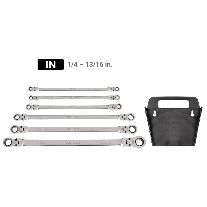 - 6-pc long flex head ratcheting box end wrenches: 1/4 x 5/16, 9/32 x 11/32, 3/8 x 7/16, 1/2 x 9/16, 5/8 x 11/16, 3/4 x 13/16 in