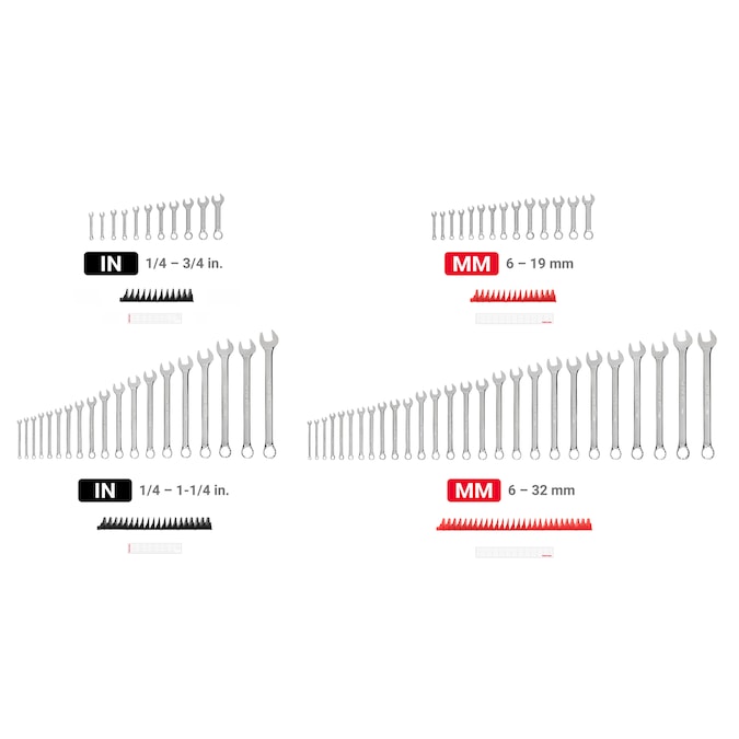 • 19-pc inch combination wrenches: 1/4, 9/32, 5/16, 11/32, 3/8, 7/16, 1/2, 9/16, 5/8, 11/16, 3/4, 13/16, 7/8, 15/16, 1, 1-1/16, 1-1/8, 1-3/16, 1-1/4 in