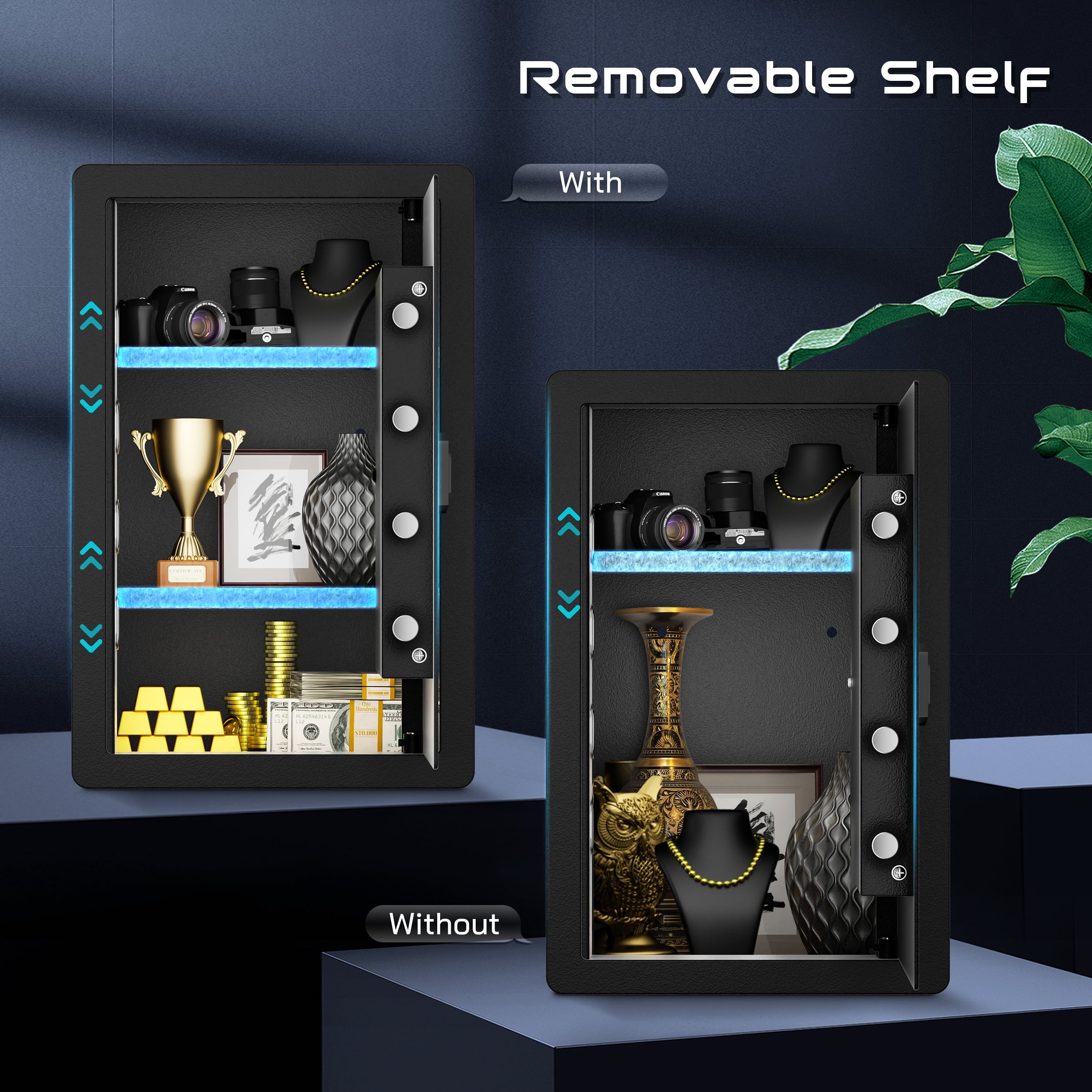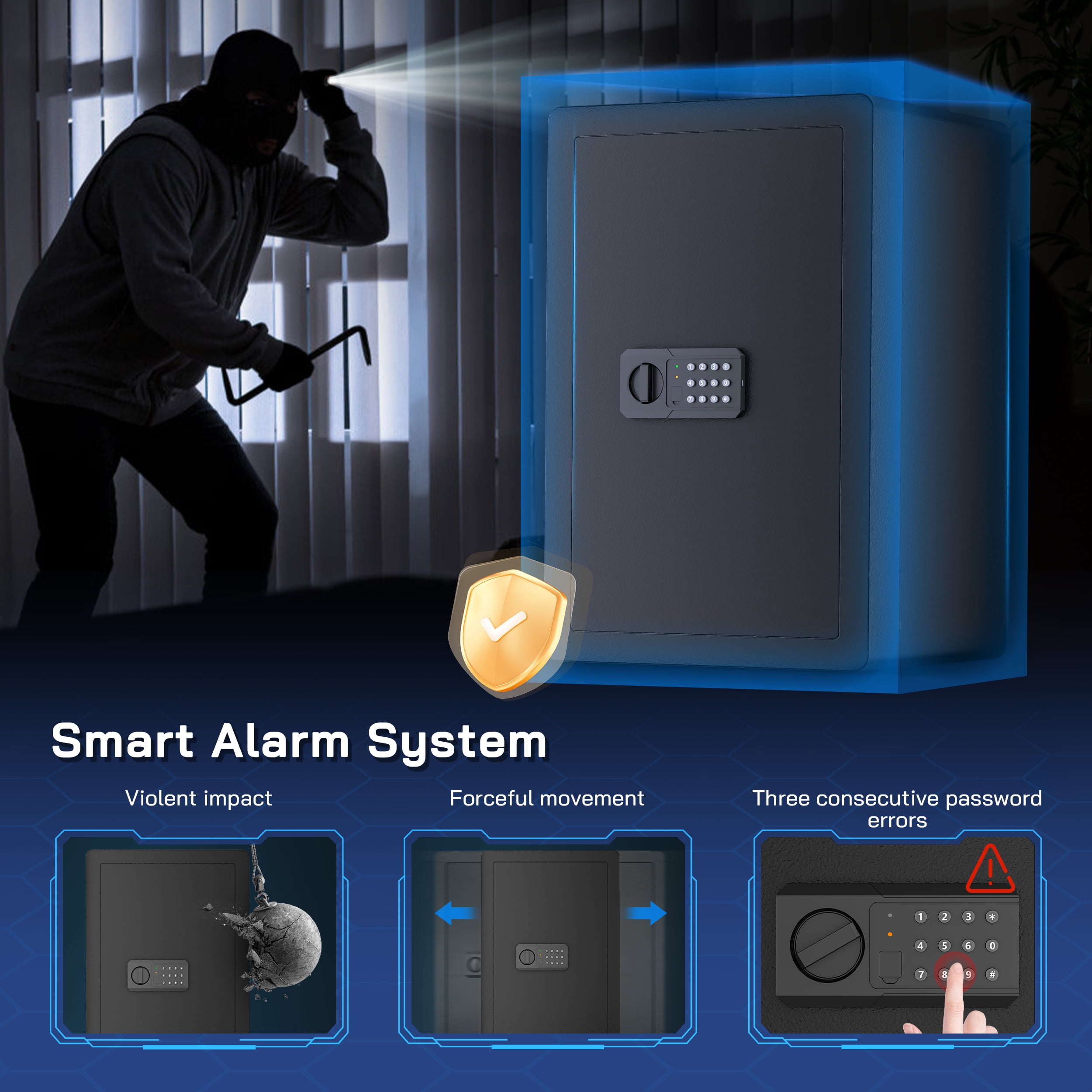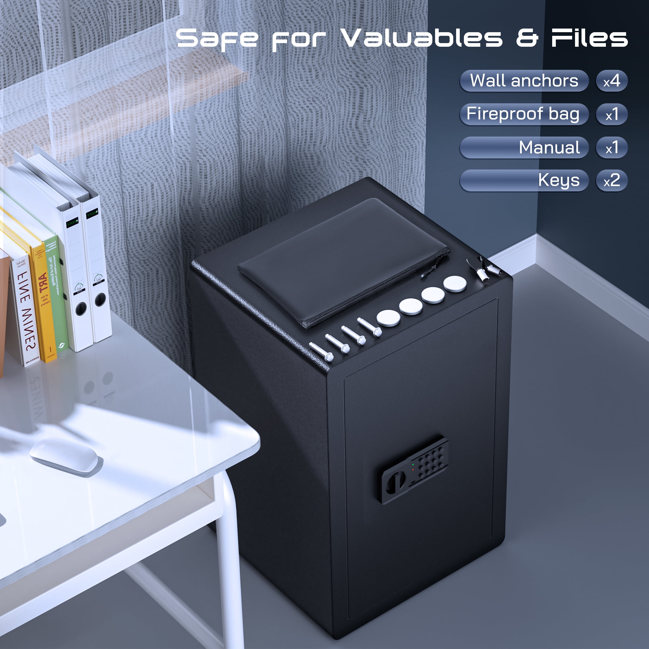 ▶ KEY FEATURES: ????【Spacious 4.0 cu.ft Capacity】: The TELAM safe features a generous capacity with removable shelves, providing ample storage for your valuable documents and belongings. ????【Dual Locking Options】: Enjoy the convenience of two unlocking methods: customizable keypad entry with 3-8 digit password options, or traditional key access. Plus, receive a complimentary external emergency battery box for continued access even if the main batteries fail. ????【Advanced Security Alerts】: Stay protected with our comprehensive security features 1.Automatic lockout for 5 minutes after three consecutive incorrect password attempts, accompanied by a 5-minute alarm. 2.Activate vibration alerts by long-pressing “#” or “*” for immediate notification of any unauthorized movement or impact on the safe. ????【Durable Construction and Anti-Theft Design】: Built from solid steel with a 25mm locking bolt and a 50mm thick door, our safe is engineered to resist theft, tampering, and drilling. ????【Additional Accessories】: Customize your security setup with our optional accessories, including a $20 fireproof and waterproof document bag, perfectly sized for A4 documents. ????【Secure Installation】: Our comprehensive installation kit includes all necessary hardware for secure mounting in concealed spaces such as walls or closets using expansion screws. ????【EASY TO INSTALLATION】: This personal safe box has pre-drilled mounting holes in the back and expansion screws are included in the accessory box. You can fix it with the wall or cabinet. ??【365 Day Free Key Replacement】: If you lose your key, we can send you a new one. We have a 24-hour online customer service. If you have any questions or have any questions, please contact me at the first time. ▶ SPECIFICATIONS: Brand: TELAM Color: Black Material: Alloy Steel Battery Type: 4 x AAA Batteries (Batteries Not Included) ▶ Package Include:: 1*Electronic Digital Safe Box 1 x Fireproof Bag 4*Expansion screw 2*Emergency key 1*Pad blanket 1*Fireproof waterproof bag 1*Gun rack 1*Manual