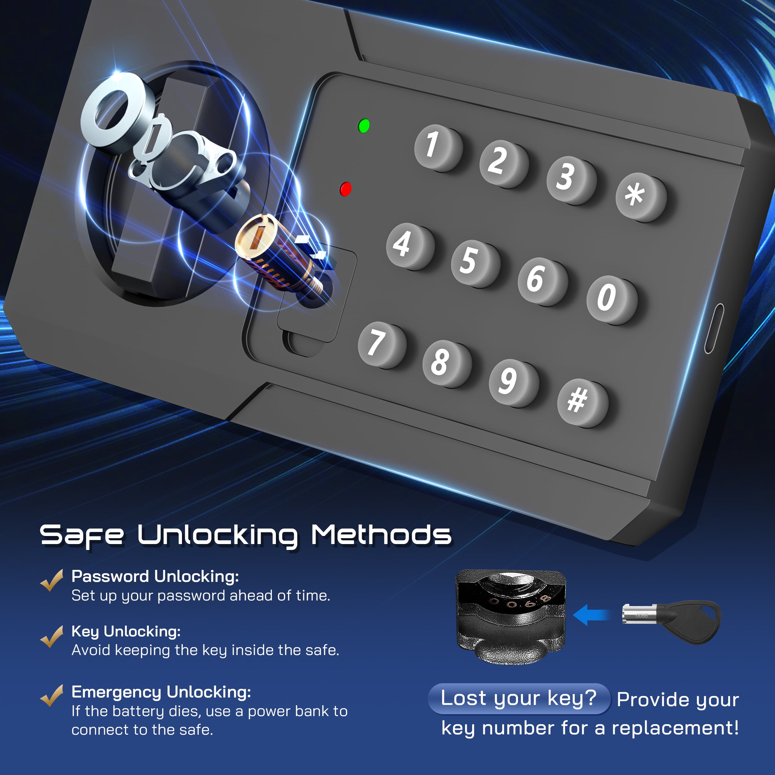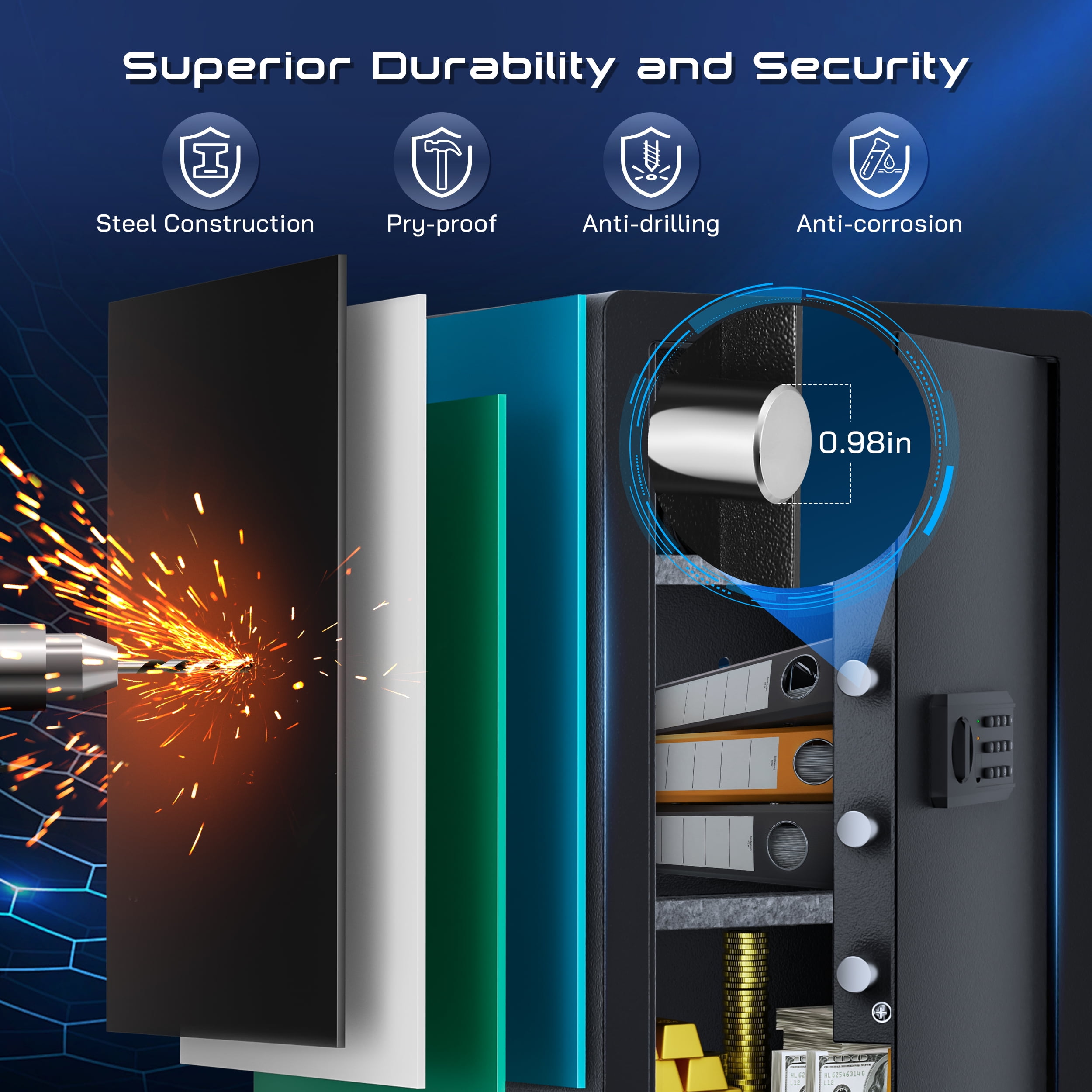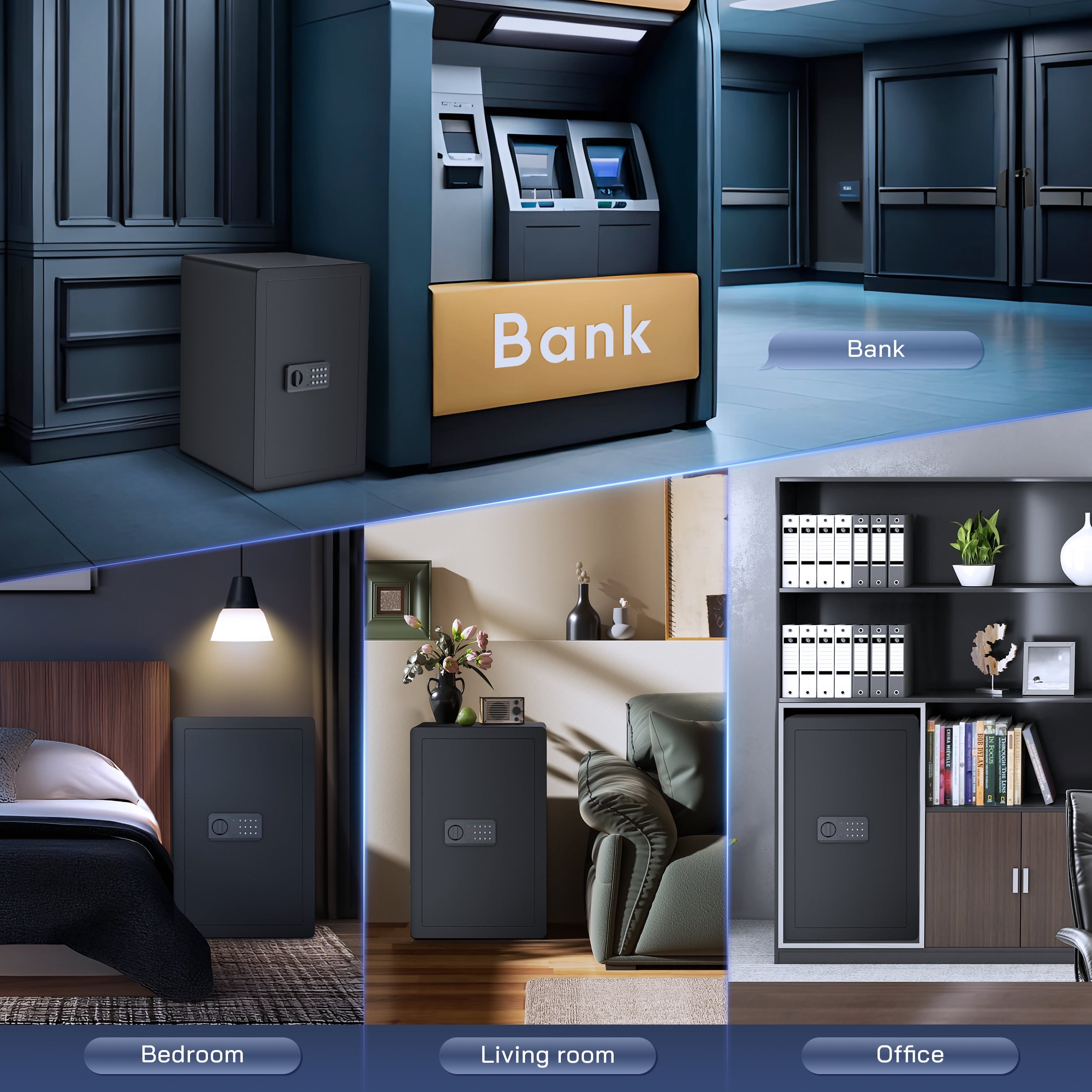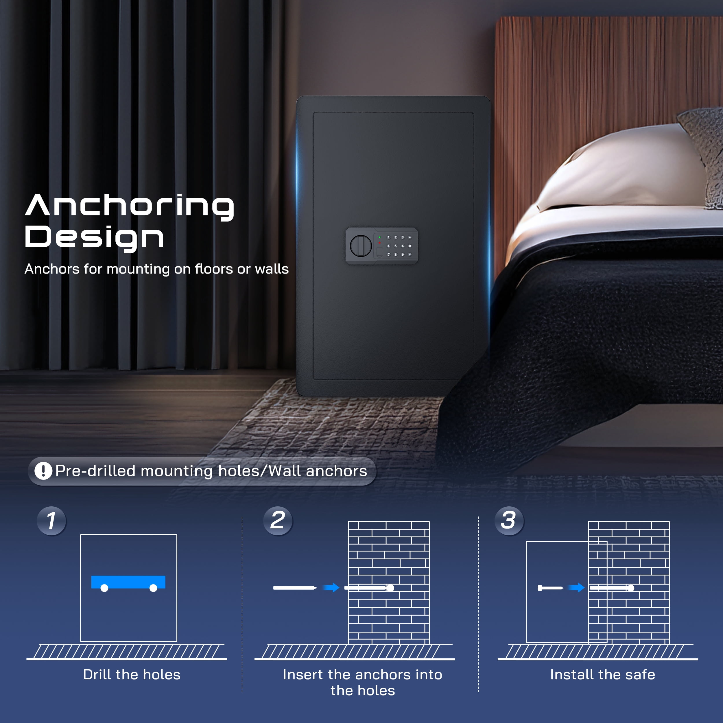 ▶ KEY FEATURES: ????【Spacious 4.0 cu.ft Capacity】: The TELAM safe features a generous capacity with removable shelves, providing ample storage for your valuable documents and belongings. ????【Dual Locking Options】: Enjoy the convenience of two unlocking methods: customizable keypad entry with 3-8 digit password options, or traditional key access. Plus, receive a complimentary external emergency battery box for continued access even if the main batteries fail. ????【Advanced Security Alerts】: Stay protected with our comprehensive security features 1.Automatic lockout for 5 minutes after three consecutive incorrect password attempts, accompanied by a 5-minute alarm. 2.Activate vibration alerts by long-pressing “#” or “*” for immediate notification of any unauthorized movement or impact on the safe. ????【Durable Construction and Anti-Theft Design】: Built from solid steel with a 25mm locking bolt and a 50mm thick door, our safe is engineered to resist theft, tampering, and drilling. ????【Additional Accessories】: Customize your security setup with our optional accessories, including a $20 fireproof and waterproof document bag, perfectly sized for A4 documents. ????【Secure Installation】: Our comprehensive installation kit includes all necessary hardware for secure mounting in concealed spaces such as walls or closets using expansion screws. ????【EASY TO INSTALLATION】: This personal safe box has pre-drilled mounting holes in the back and expansion screws are included in the accessory box. You can fix it with the wall or cabinet. ??【365 Day Free Key Replacement】: If you lose your key, we can send you a new one. We have a 24-hour online customer service. If you have any questions or have any questions, please contact me at the first time. ▶ SPECIFICATIONS: Brand: TELAM Color: Black Material: Alloy Steel Battery Type: 4 x AAA Batteries (Batteries Not Included) ▶ Package Include:: 1*Electronic Digital Safe Box 1 x Fireproof Bag 4*Expansion screw 2*Emergency key 1*Pad blanket 1*Fireproof waterproof bag 1*Gun rack 1*Manual