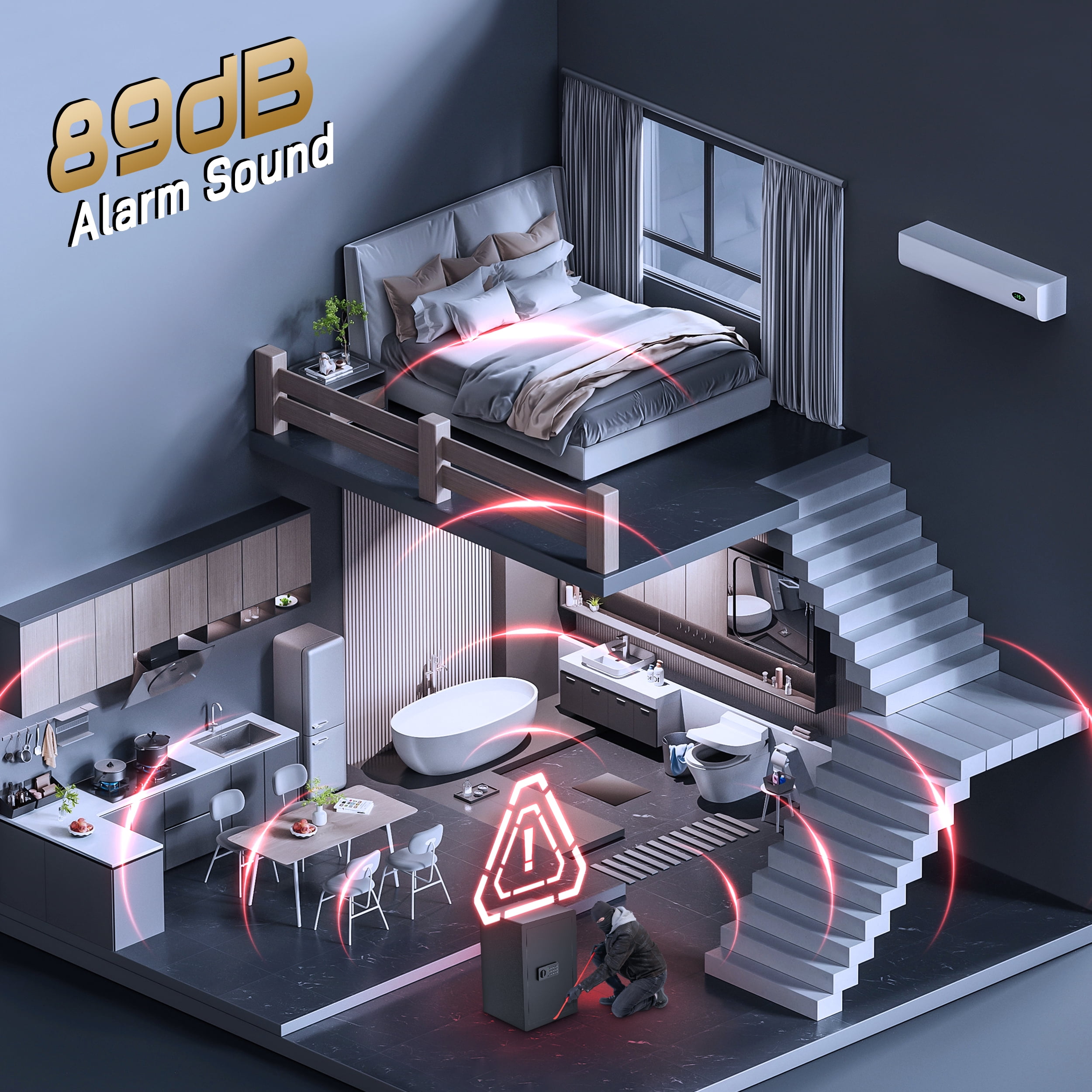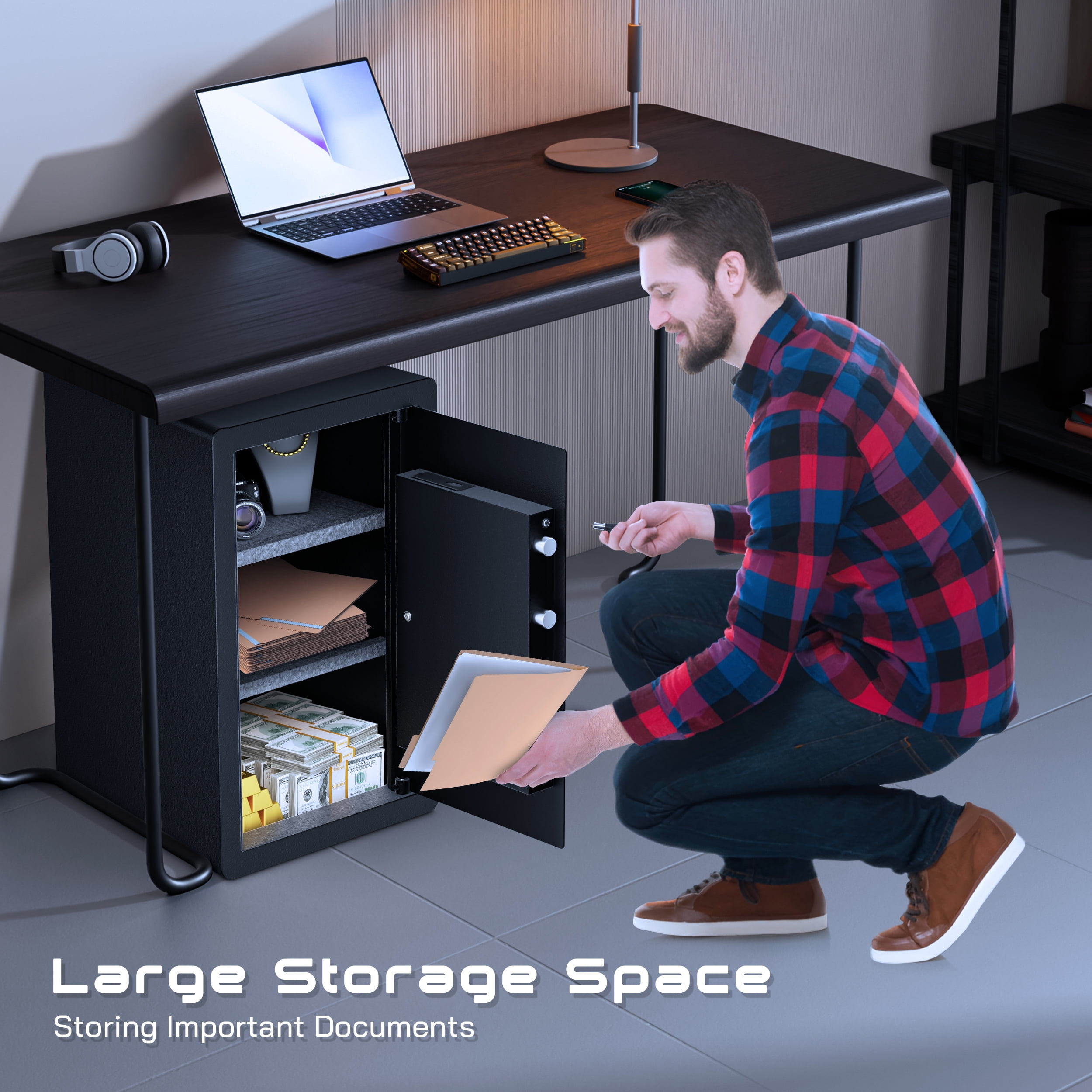 TELAM 4.0 Cubic Large Safe Box with Fireproof Waterproof Bag, Home Safe Security Box, LED Light, Alarm System,Movable Partitions The TELAM safe features a dual alarm system that prioritizes security, ensuring peace of mind at home or in the office. It uses high-density alloy bolts with anti-drill and anti-pry capabilities and includes multiple alarms for low battery, tamper vibrations, and misoperations. The TELAM safe also boasts a seamless door edge design for comprehensive theft protection and a smart interior layout for efficient organization of items.