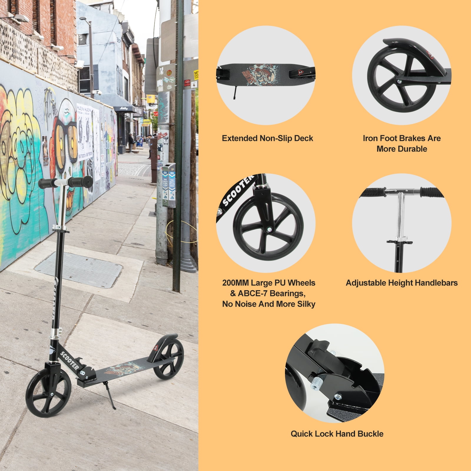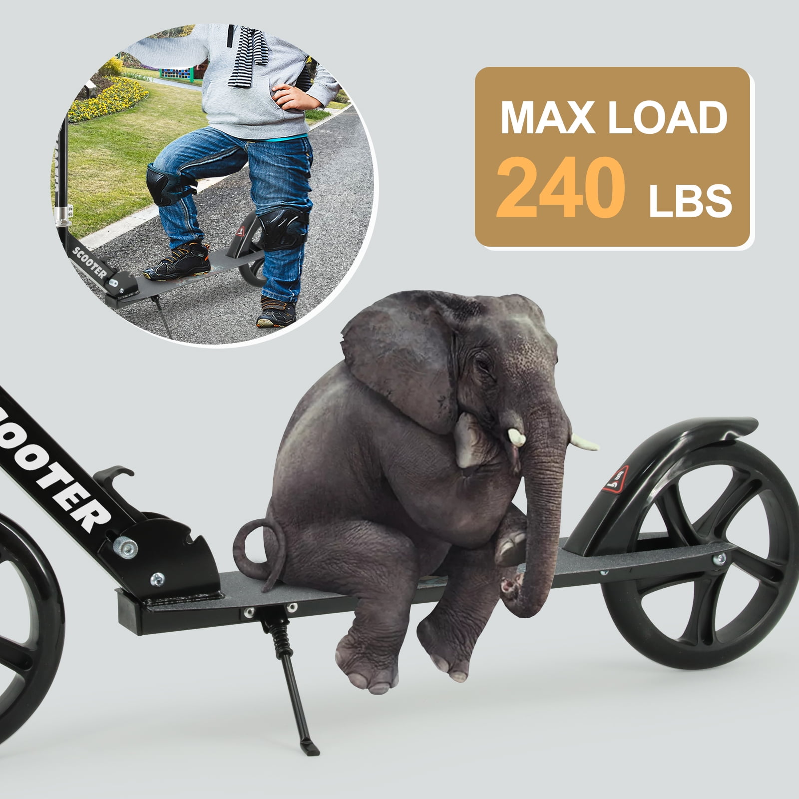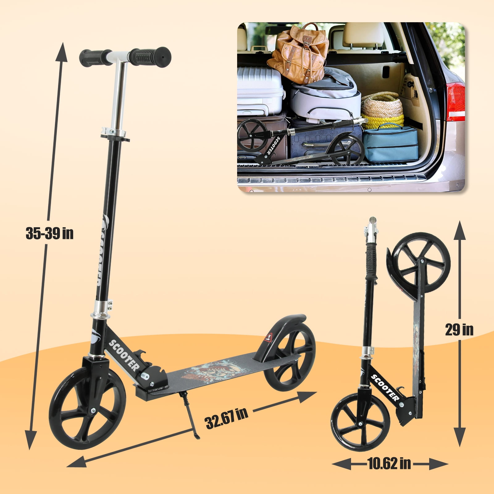 TENBOOM Kick Scooter, Black, 3 Adjustable Levels, for Kids, Teens, and Adults, Max Load 240 lbs Safety Features: The scooter includes a rear brake function, allowing for smooth stops by simply pressing one foot to the rear wheel Folding Design: Easily folds up by pulling the folding button, making it compact and portable for carrying or storage Height Adjustable: Features three height settings (35″, 37″, and 39″) suitable for children aged 8 and older, as well as teenagers and adults Wide Pedals: The pedal dimensions are 46 inches by 21 inches, providing a stable riding experience with a weight capacity of 240 lbs Support Feet: Designed for easy parking, the support feet allow for stable positioning both indoors and outdoors without leaning