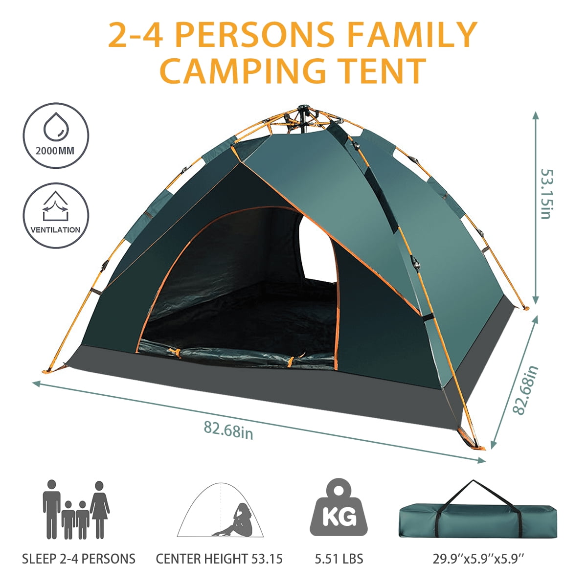 This lightweight 2-4 person dome tent with a large D-style door has enough space for you and a friend. This compact tent is ideal for hiking, camping, a kid’s indoor or backyard play tent, fishing, or shelter at the beach. Features: Double Zipper Doors The combination of the inner screen layer and the outer zippered fabric layer of the tent door provide plenty of air flow as well as privacy. Simply bind the doors back with the sewn in ties to keep the bugs out Ventilation Design Screen windows & doors makes the 4 personal tent have a large space, lighting effect and excellent vision. The camping tent with a center height of 53 inches and 78.7 x 78.7 inches base size. Sturdy Frame There are 2 premium fiberglass poles to support a sturdy frame. The fastening system holds the tent firmly to the sturdy frame, can supports most heavily wind rain. Lightweight & Portable This 2-4 person camping tent weighs just 6.17lb, it’s very easy to carry. When you finish your trip, you can simply place components back into the zippered carry bag to pack up and transport. Specifications: Color: Green Material: Oxford cloth + B3/B4 Ventilation mesh + Fiberglass poles Seasons: 3 Season Occupancy: 2-4 Person Weight: 6.17lbs Dimension: 78.7*78.7*53 inches (2*2*1.35m) Packaged Included: 1 X Camping Tent 1 X Carry Bag 4 X Guy Ropes 8 X Iron Pegs Note: 1. Do not use in an uneven place or environment. 2. Do not erect tents on hard stones or sharp objects. 3. Please be careful when erecting and folding tents. 4. Do not use this tent in extreme weather. 5. Please keep away from high temperature, high humidity and flame. But do not store it in the rain or wet place, otherwise it will cause rust. 6. Do not put heavy objects on the tent.