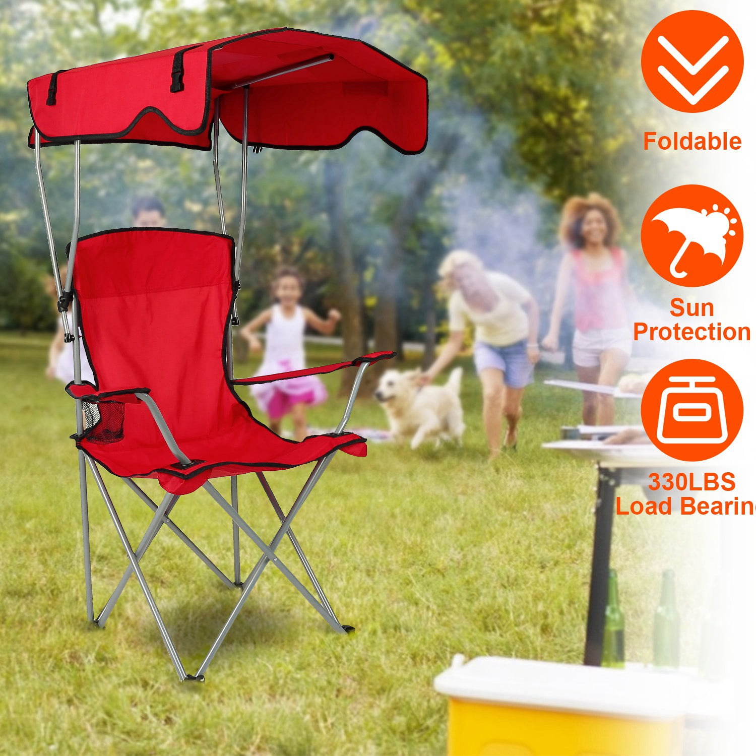 TeqHome Folding Camping Chair with Canopy 330lbs Capacity 600D Oxford Portable Camping Chair with Cup Holder Red