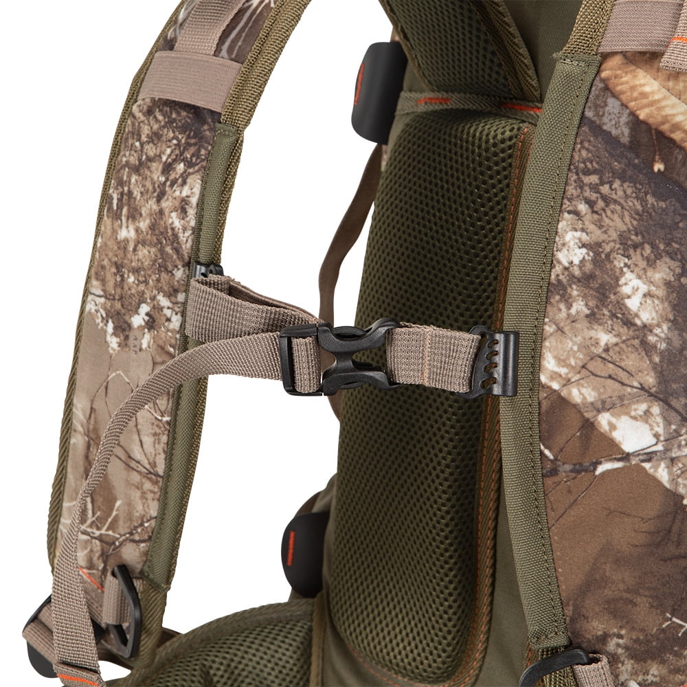 Padded Back Support Panel Quiet Fabric Dual Water Bottle Holders Realtree Edge® Camo Padded Shoulder Straps Adjustable Sternum Strap Waist Belt Adjusts to 52-Inch