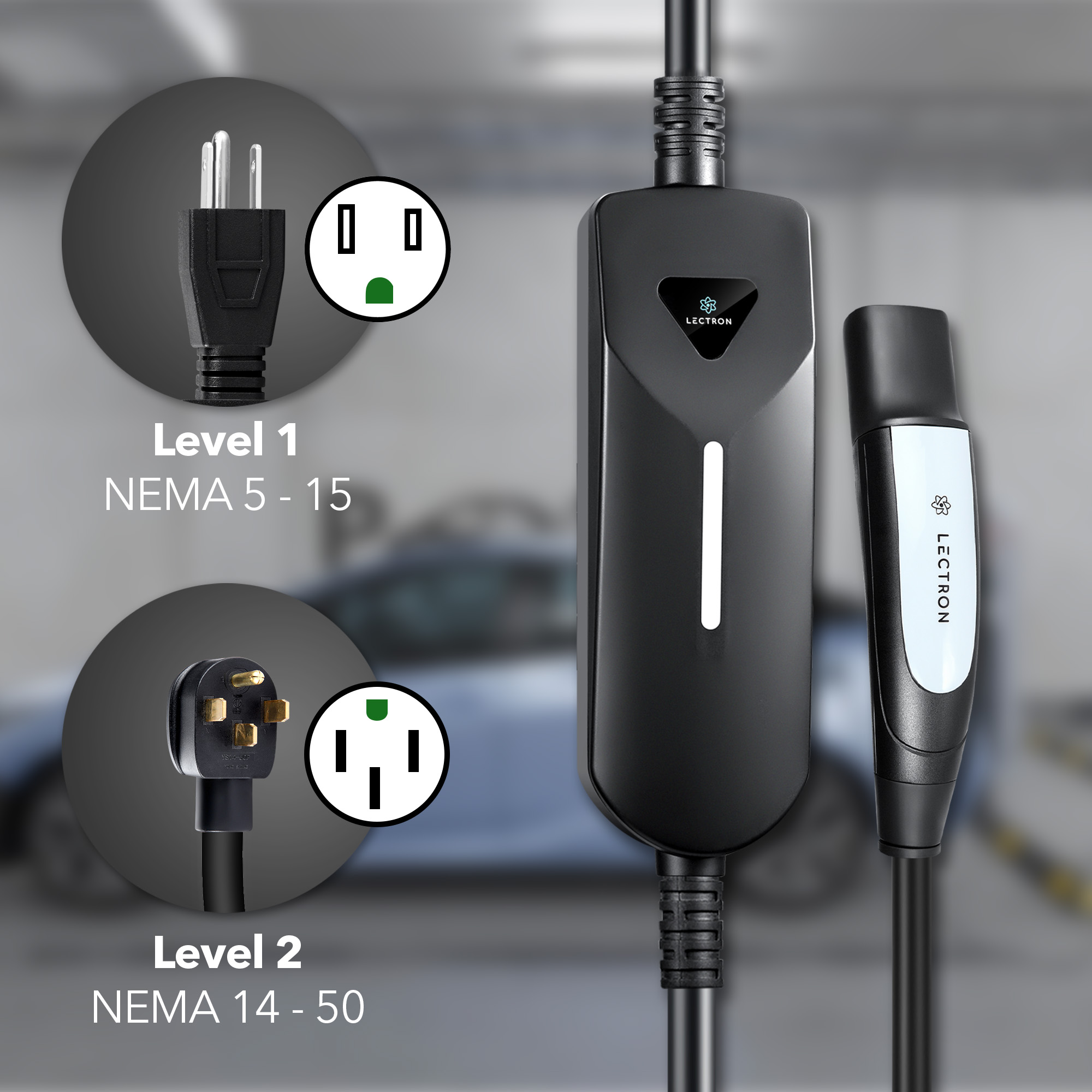 The Lectron Level 1/2 (12A & 40A) NACS Portable Charger is designed for flexibility and convenience, offering dual-level charging with both NEMA 5-15 and 14-50 plugs. Effortlessly switch between standard 12A charging for daily use and faster 40A charging when you need a quick boost, whether at home, work, or on the road. Its compact and portable design makes it easy to carry and store, ensuring you’re always prepared to charge your EV anywhere, anytime. Stay in control with real-time monitoring via LED status indicators, which keep you informed of your charging progress and alert you to any faults.Built with safety in mind, this UL-certified charger includes overvoltage, overcurrent, and over-temperature protection, along with a secure release button to ensure a safe connection between your EV and the charger. Fully compatible with all North American Charging Standard (NACS) electric vehicles, including Tesla Models 3/Y/S/X, this charger is the ideal solution for reliable and efficient charging on the go.