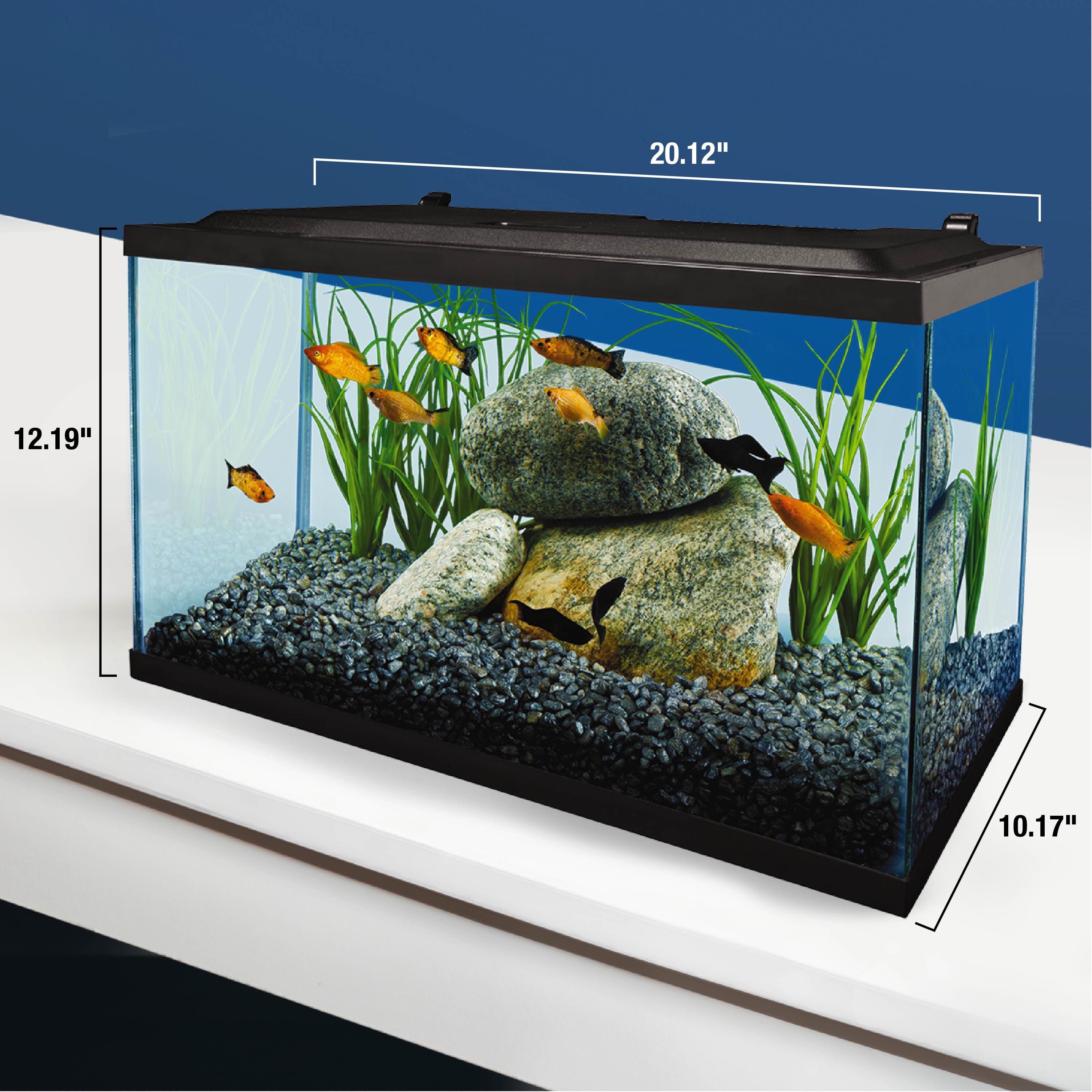 GLASS AQUARIUM KIT: Glass aquarium with low-profile hinged hood houses energy efficient white LEDs to create a natural underwater shimmer effect. EASY TO SET UP: Complete kit includes everything you need to get started. FILTER INCLUDED: Comes with the Tetra Whisper PF10 Power Filter with Tetra Medium Bio-Bag Filter Cartridge. ACCESSORIES: Kit also includes a fish net, Tetra AquaSafe water conditioner sample, TetraMin food sample and set-up guide. 10 GALLON TANK: Measures 20 inches wide by 10 inches deep by 12 inches high.