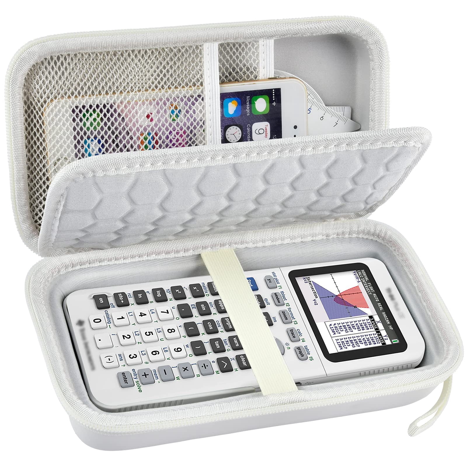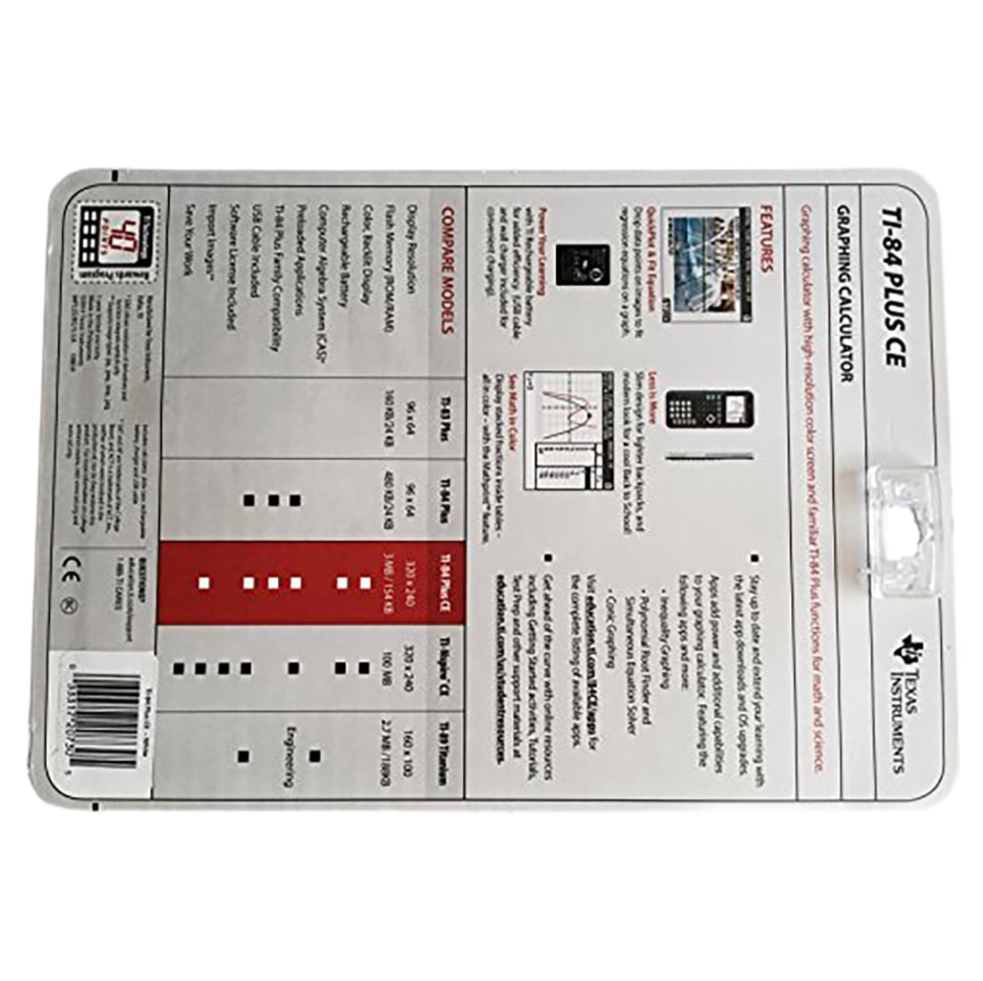 Real and complex numbers calculated to 14-digit accuracy and displayed with 10 digits plus a 2-digit exponent Graphs 10 rectangular functions, 6 parametric expressions, 6 polar expressions and 3 recursively defined sequences 30% lighter and thinner than earlier generation TI-84 Plus models Backlit graphing calculator with vibrant color screen Powered by the TI rechargeable battery (included) Pre-loaded apps and images Math Print functionality Texas Instruments graphing calculator is approved for use on the following exams: PSAT, SAT, ACT college entrance exams, AP and IB Color: White