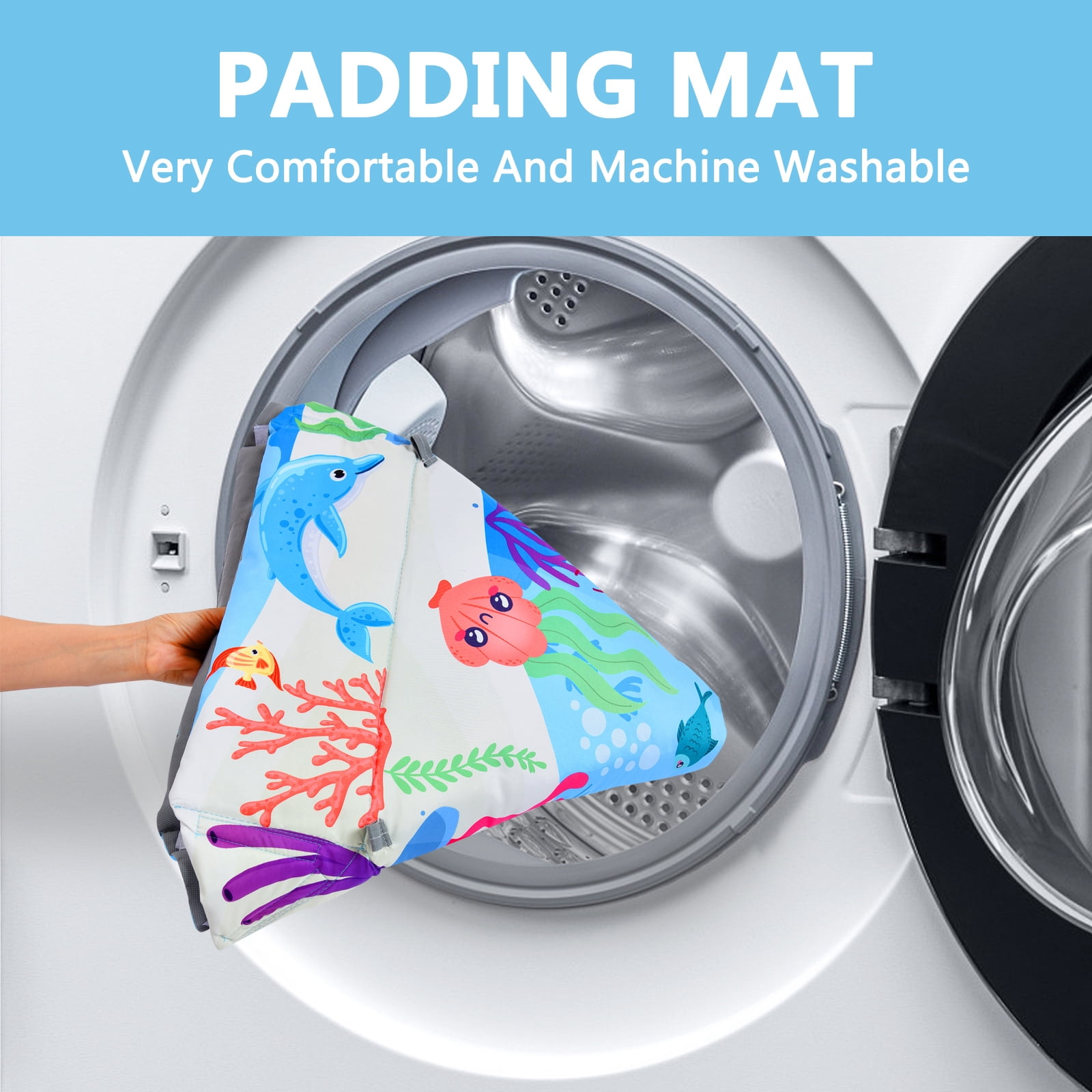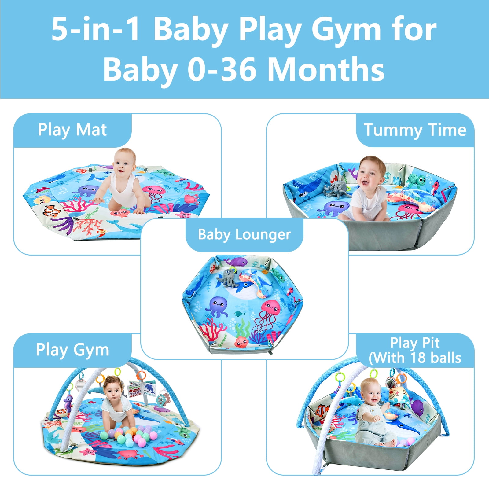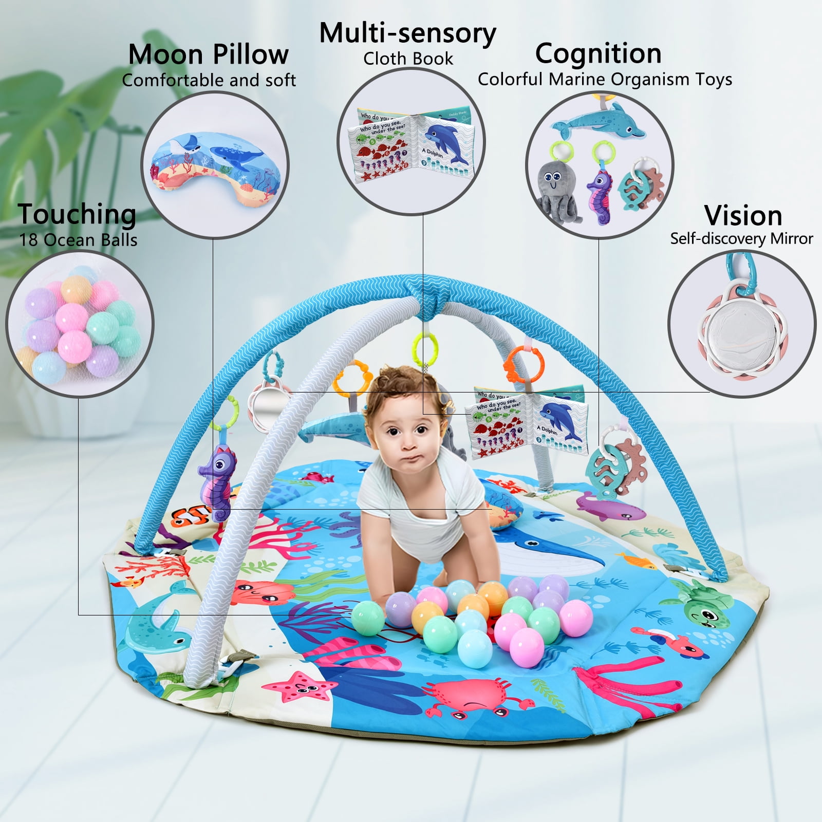 This multifunctional 5-in-1 baby activity fitness pad provides ample space for babies to explore and play freely, promoting visual, auditory, and tactile stimulation. It is made of high-quality, phthalate free materials with anti slip function, ensuring a safe and comfortable environment on various floor types. It has 7 detachable sensory toys, including high contrast cloth toys, a noisy cloth book, toy balls, grip toys, a self discovery mirror, and a belly time pillow, meeting comprehensive development needs. It is easy to machine wash and suitable for indoor/outdoor use, providing a comfortable and charming space for babies’ growth and play.