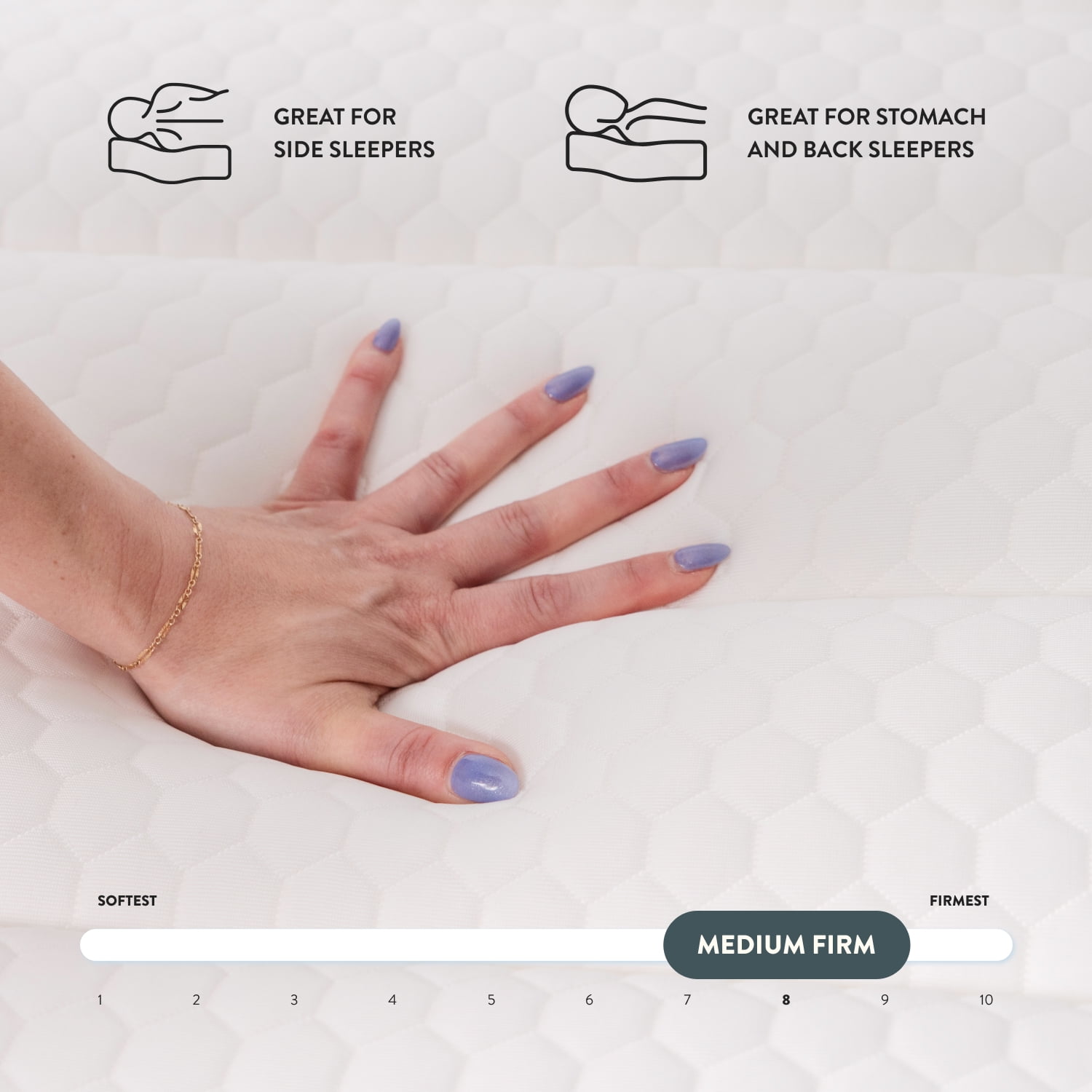 The Cool to the touch fabric pulls heat away from your body, providing a cooler night’s sleep The 3-Zoned Foam layer provides lumbar support, focused on your body’s alignment The 8″ indivually wrapped steel coils, help to create a sleep surface that sturdy, while still contouring to your body.