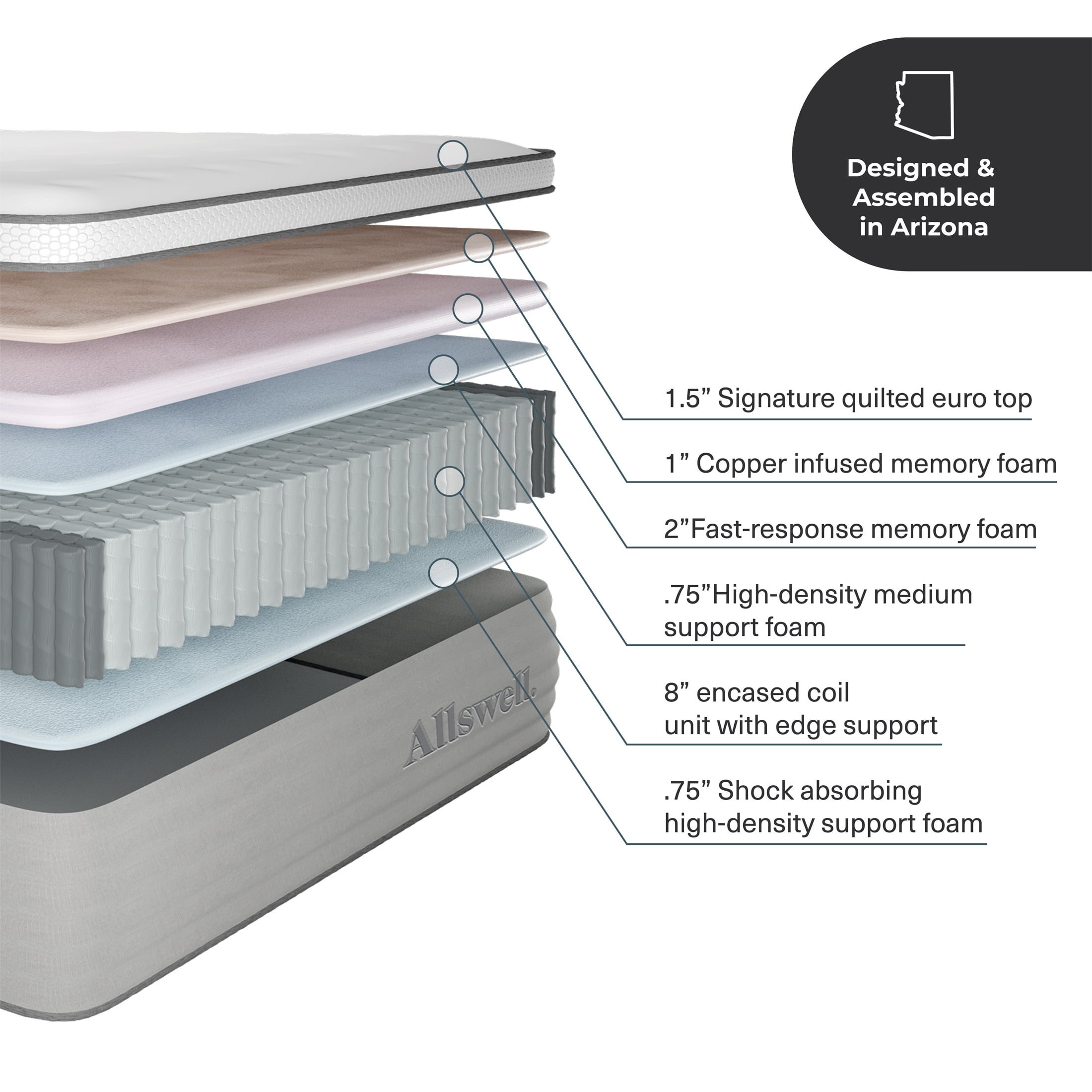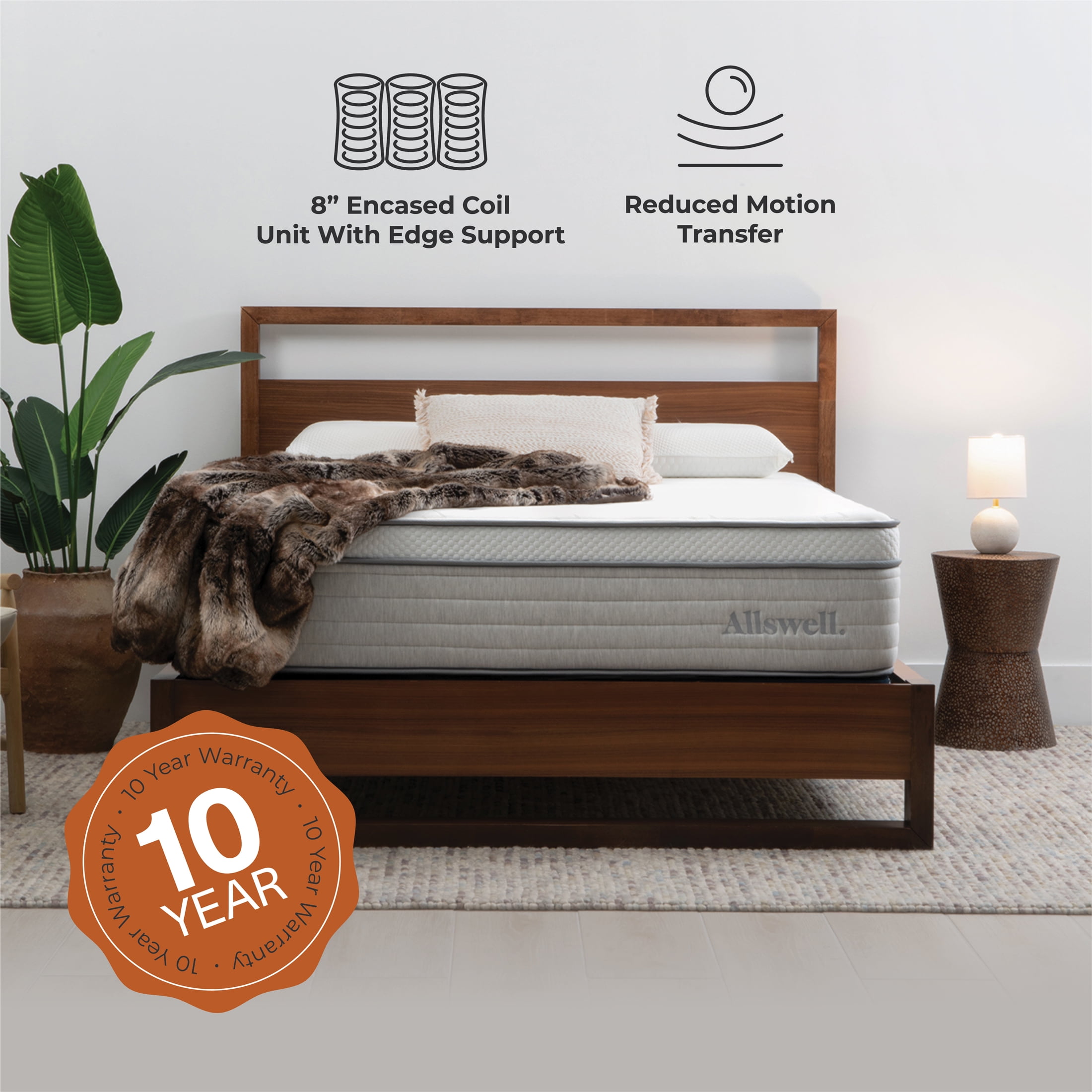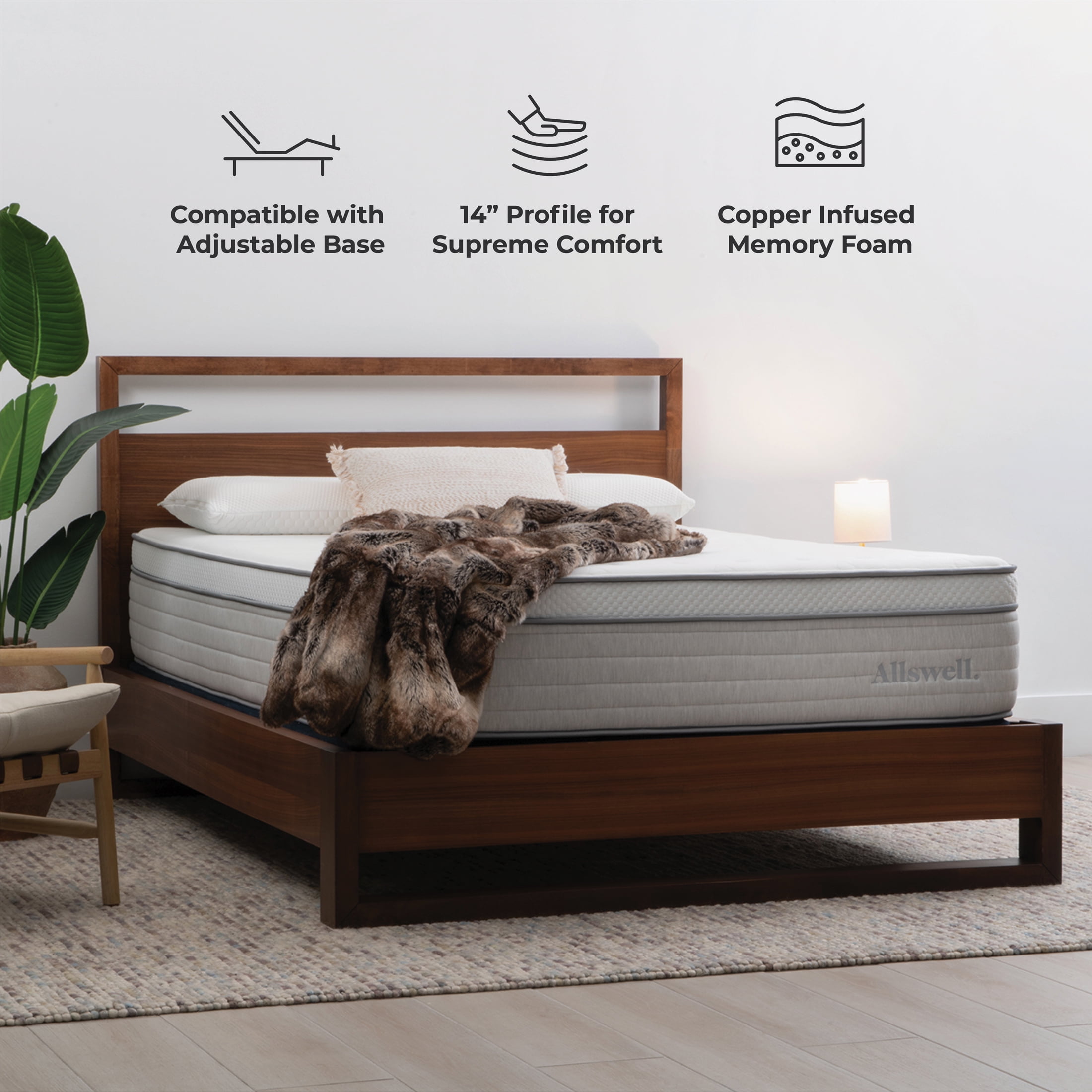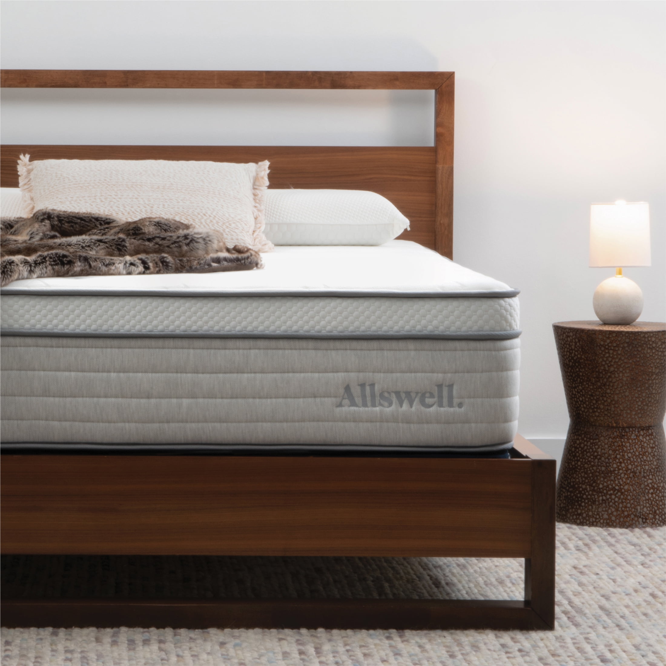 Allswell Supreme Mattress – Queen Foam & Coils: The best of both worlds. Hybrid mattresses blend a main element from traditional mattresses (coil springs) with layers of memory foam 14-Inches Tall: With added comfort and support, this mattress rivals some of the best high-end specialty store finds Built in Euro-top for that extra plush and luxury feeling CertiPUR-US Certified. The Allswell Supreme is made with CertiPUR-US certified foams which are made without bad stuff like mercury, lead, formaldehyde, and phthalates to name a few Our Very Unscientific Firmness Scale: After many iterations, we finally nailed what we think is the perfect recipe for the ideal medium-firm feel. Disclaimer: Firmness scale was created by Allswell based on the subjective opinions of Allswell and its extended team of 20 sleepers;Boxed for easy shipping and setup