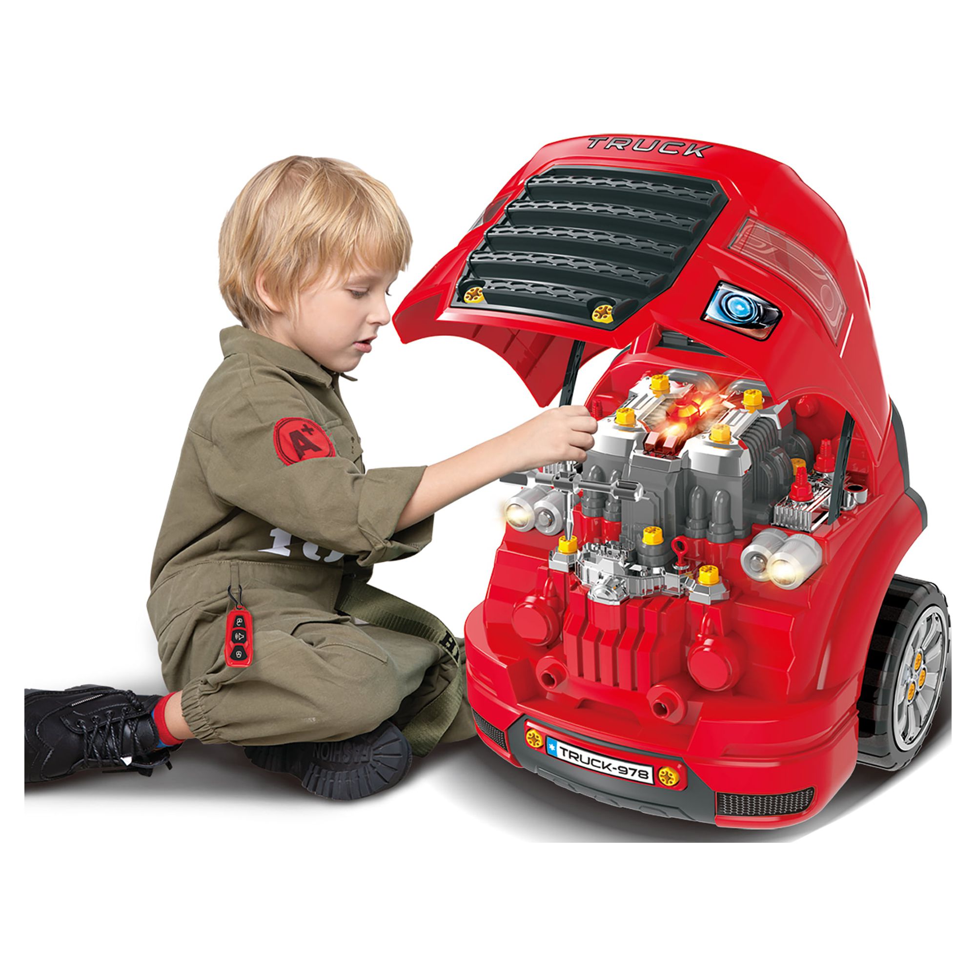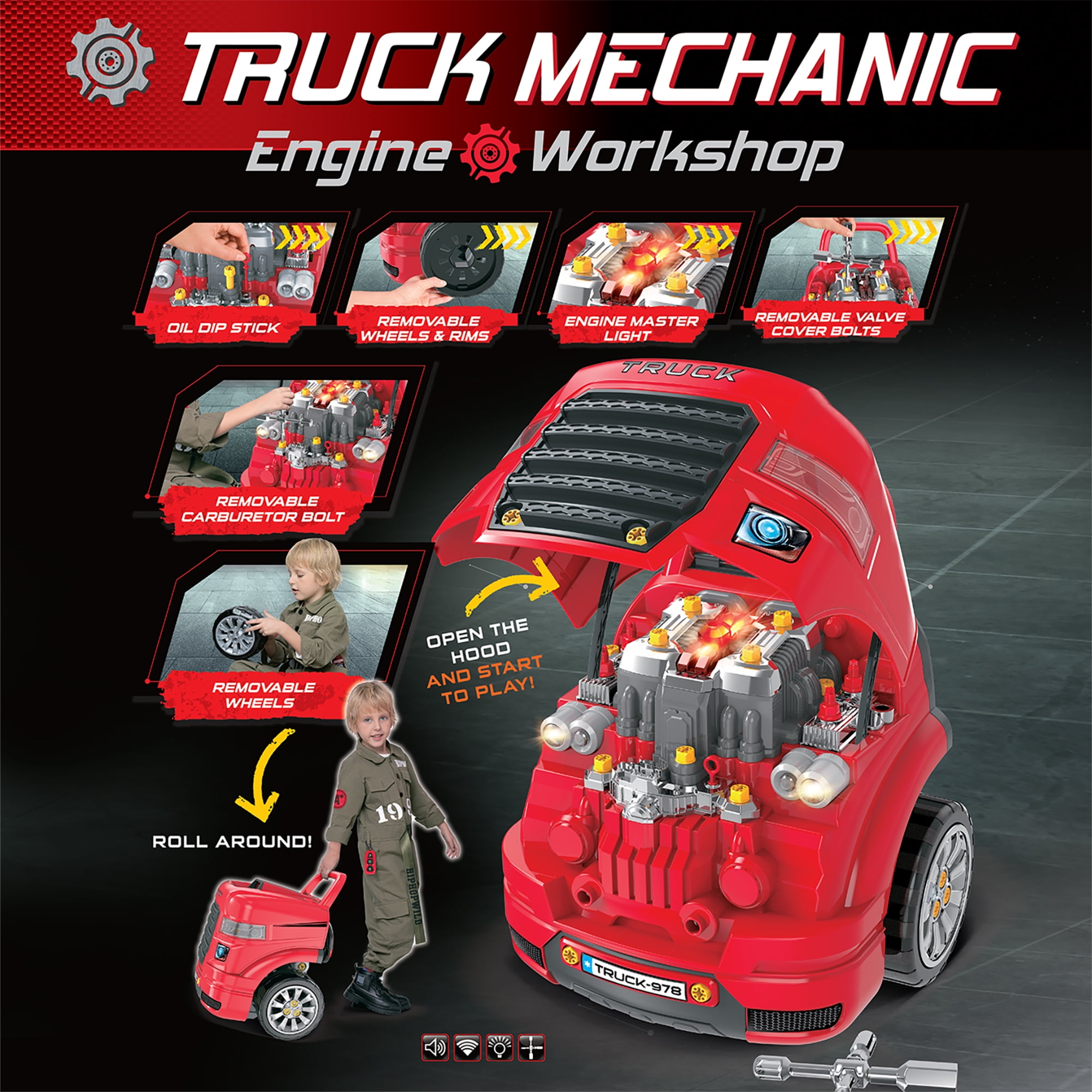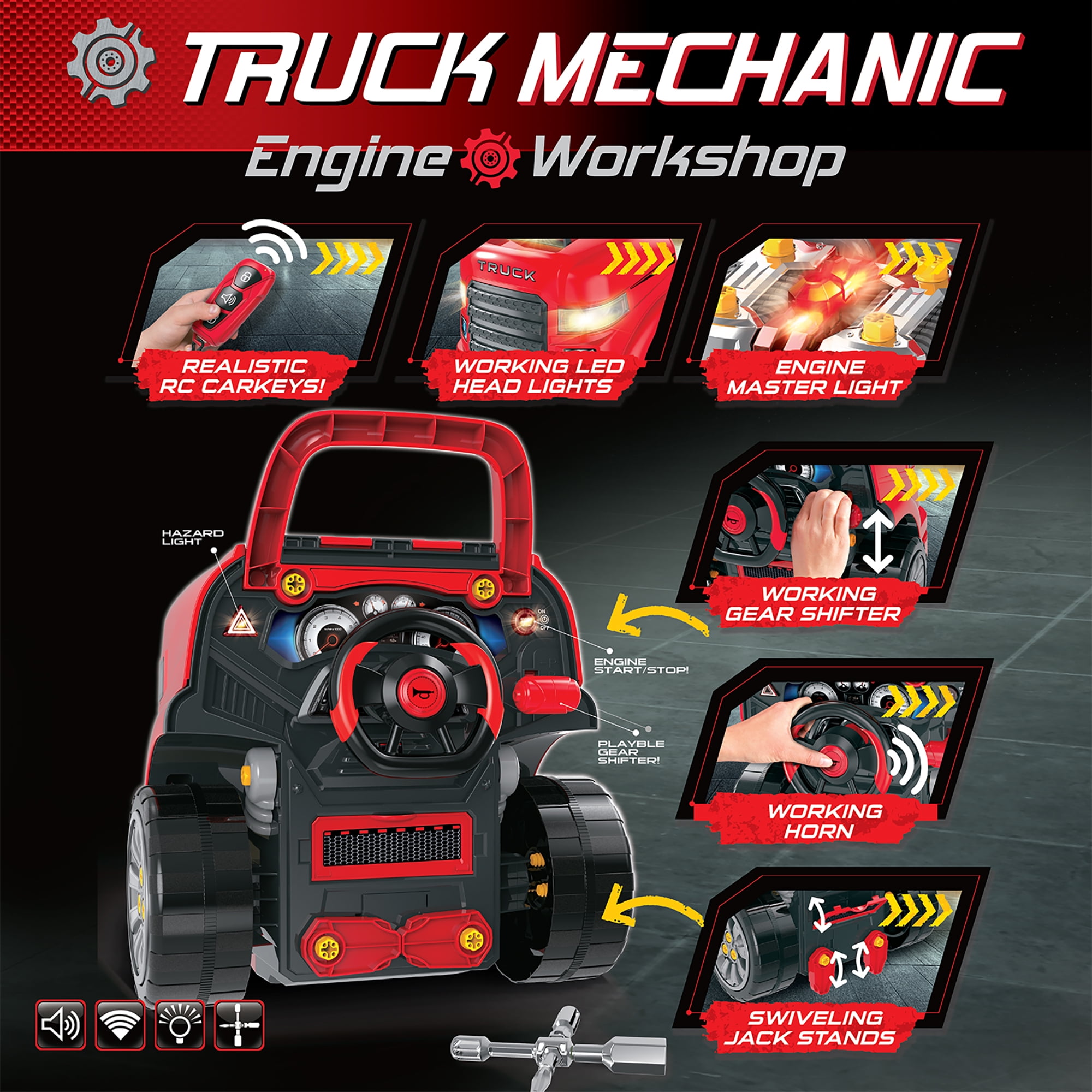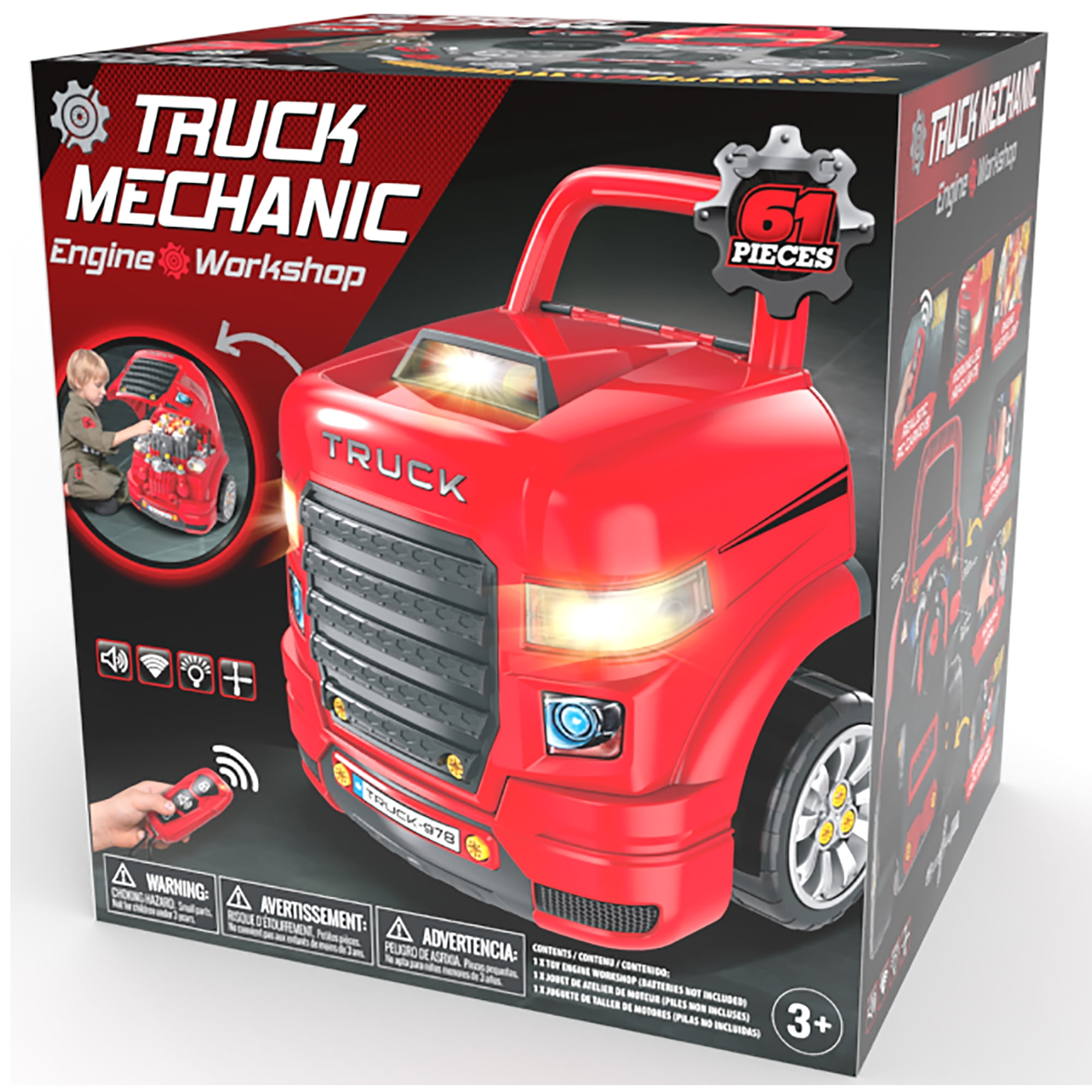 The Bubble Factory Truck Engine Workshop Vehicle Playset Get ready to become a mechanic! This interactive Truck Mechanic Engine Workshop sparks hours of active and imaginative play Encourages pretend role play and helps develop young motor skills, including directional skills and hand-eye coordination Key highlights include LED headlights, light & sound engine with push button start, oil filter, dip stick, pulley, playable gear shifter, rotating steering wheel with horn, jack stands to raise the car, and removable wheels and rims Features a realistic remote control car key with light and sound effects for locking, unlocking, and hailing Product dimensions: 18.5 x 15.7 x 15.3 inches. Made of durable quality plastic