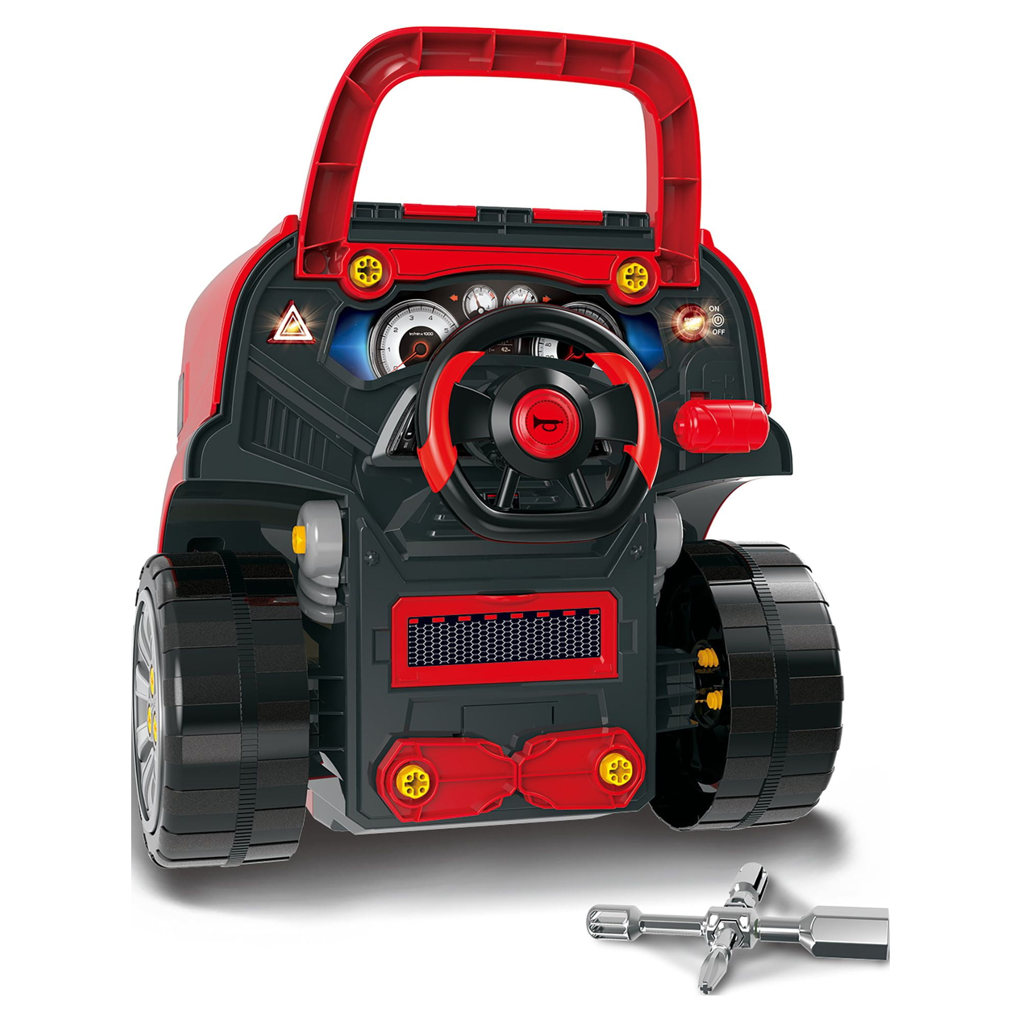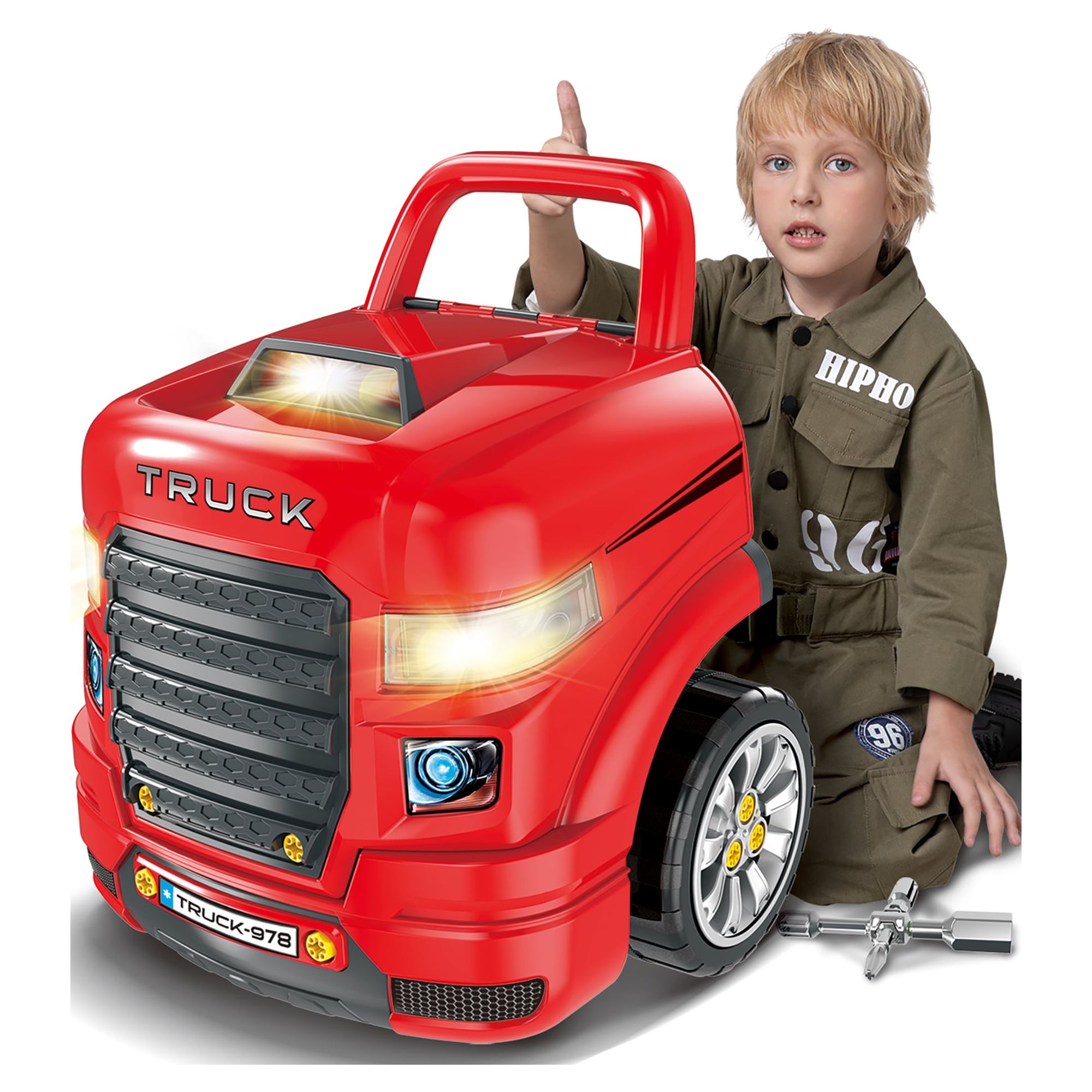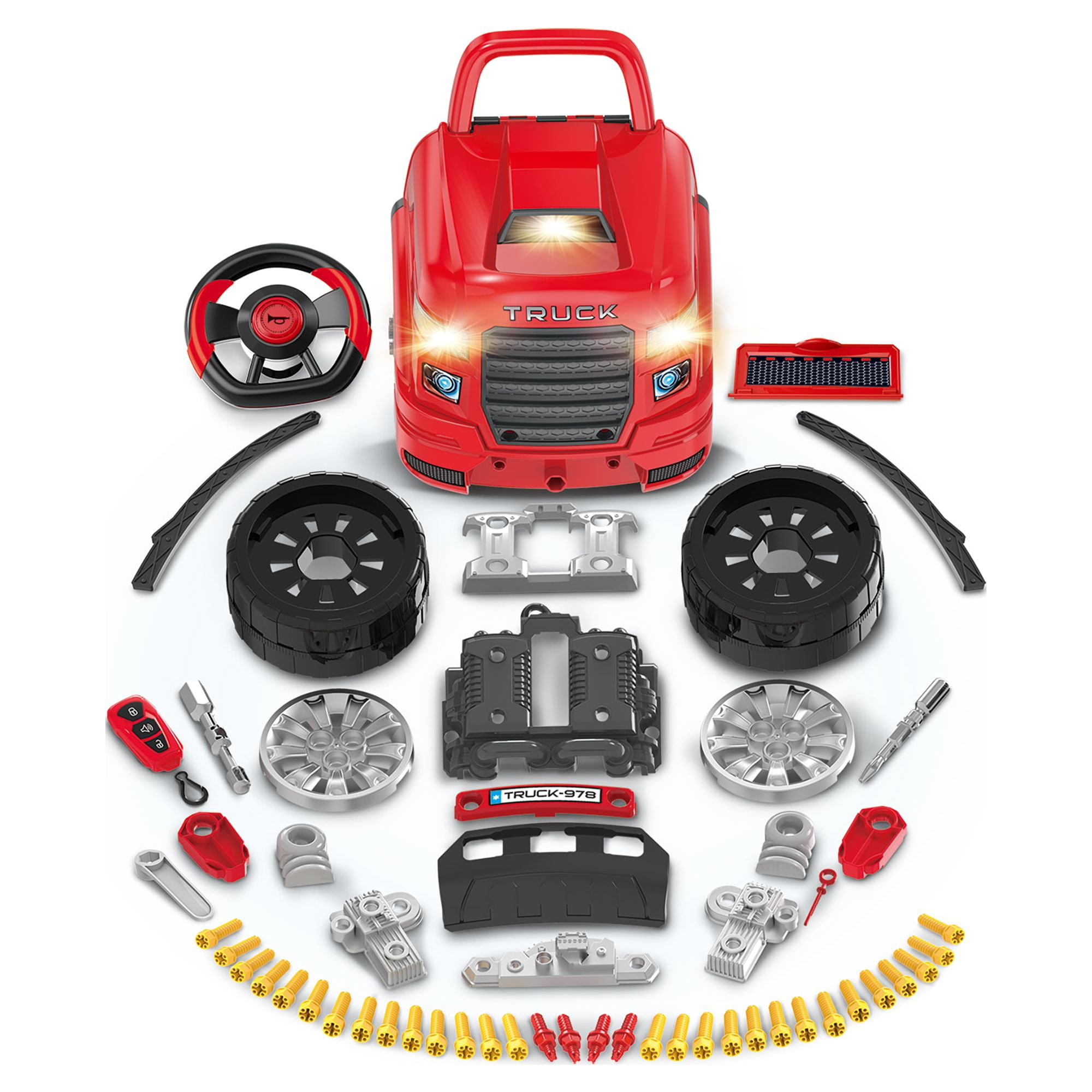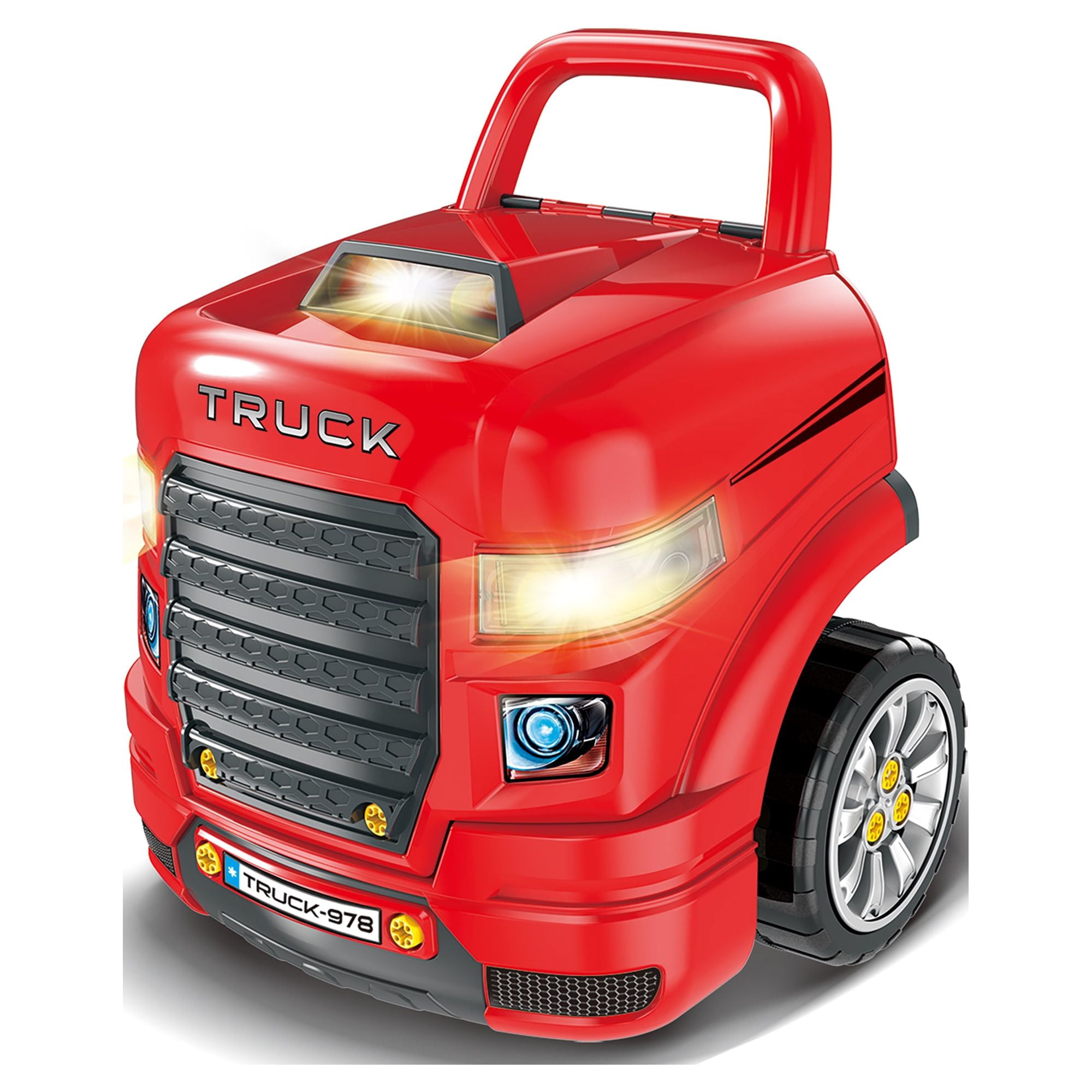 The Bubble Factory Truck Engine Workshop Vehicle Playset Get ready to become a mechanic! This interactive Truck Mechanic Engine Workshop sparks hours of active and imaginative play Encourages pretend role play and helps develop young motor skills, including directional skills and hand-eye coordination Key highlights include LED headlights, light & sound engine with push button start, oil filter, dip stick, pulley, playable gear shifter, rotating steering wheel with horn, jack stands to raise the car, and removable wheels and rims Features a realistic remote control car key with light and sound effects for locking, unlocking, and hailing Product dimensions: 18.5 x 15.7 x 15.3 inches. Made of durable quality plastic