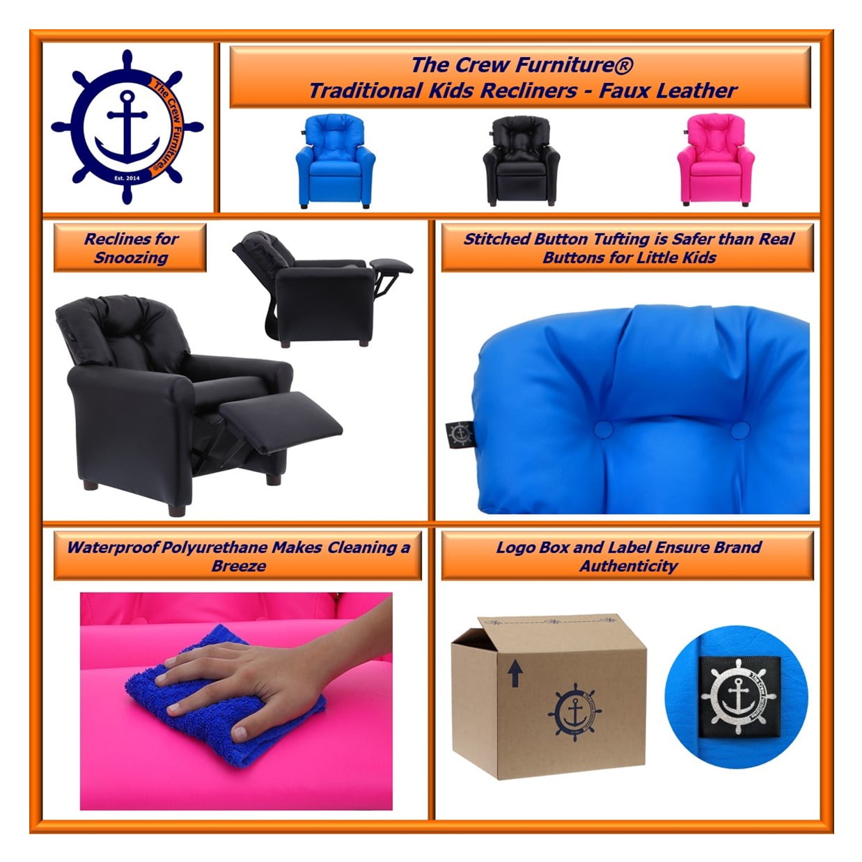 Perfect Size for Toddlers: The Crew Furniture Traditional Kids Recliner is designed specifically for children ages 1-5 years, making it an ideal kids recliner for your little ones. Its perfect size ensures that young children can sit comfortably and safely. This recliner for kids provides a cozy spot for relaxation and play. Comfort and Style: This kids armchair recliner features plush padding and a sleek PU faux leather upholstery. It not only offers maximum comfort but also adds a touch of elegance to any room. The stylish design makes this reclining chair for kids a great addition to your home decor. Easy to Clean: The PU faux leather material of this kids recliner is easy to wipe clean. It’s perfect for parents who want a low-maintenance option for their children. The recliner for kids stays looking new with minimal effort. Safe and Sturdy: Built with an engineered wood frame, this armchair recliner for kids ensures safety and longevity. Button tufting is made with circle stitches instead of actual buttons to eliminate the choking hazard which can occur when buttons fall off. Parents can feel confident that this kid’s armchair recliner is safe. Multi-Use Recliner: Perfect for reading, watching TV, or just relaxing, this kids armchair recliner is versatile and functional. It serves multiple purposes to suit your child’s needs. The reclining chair for kids is an all-in-one solution for comfort and activity. Compact and Lightweight: The compact design of this kids recliner makes it easy to move around. Its lightweight construction ensures that it can be relocated with ease. This recliner for kids is perfect for families who need flexibility in their furniture arrangement. Stylish Addition to Any Room: The classic faux leather finish of this kids reclining chair complements any decor. It’s a great addition to your child’s bedroom, playroom, or living area. This kids armchair recliner adds a stylish touch to any space. Great Gift Idea: This kids recliner makes a wonderful gift for birthdays, holidays, or any special occasion. It’s perfect for toddlers aged 1-5 years. Give the gift of comfort and style with this recliner for kids.