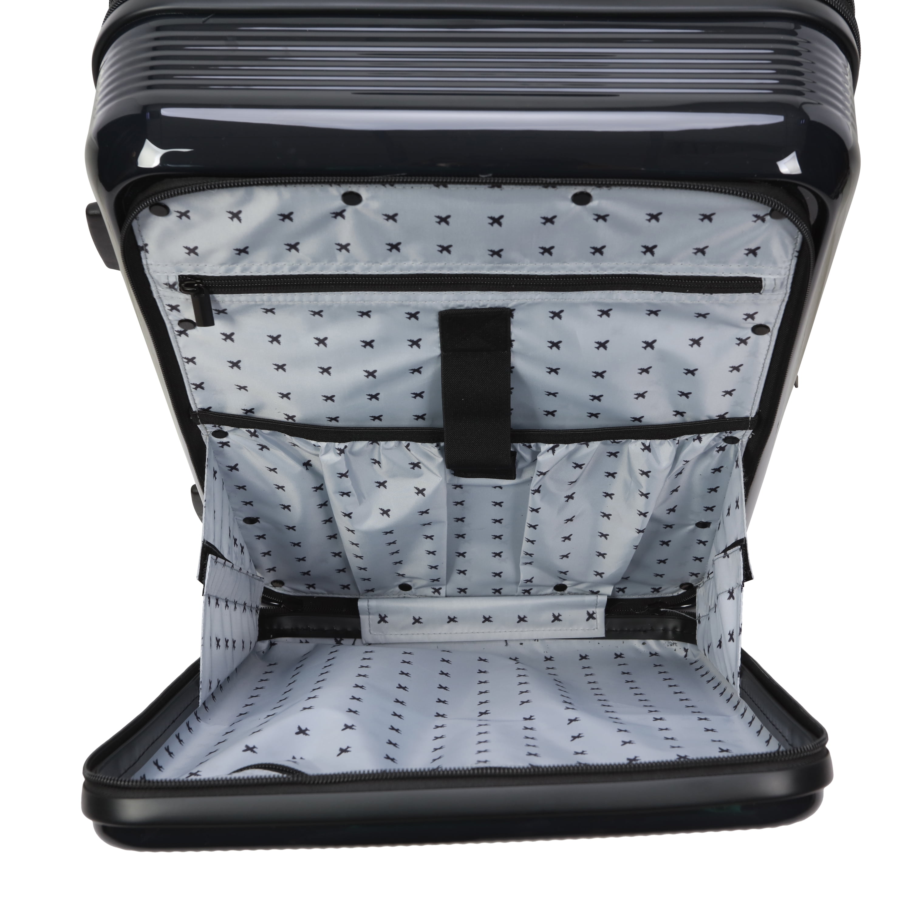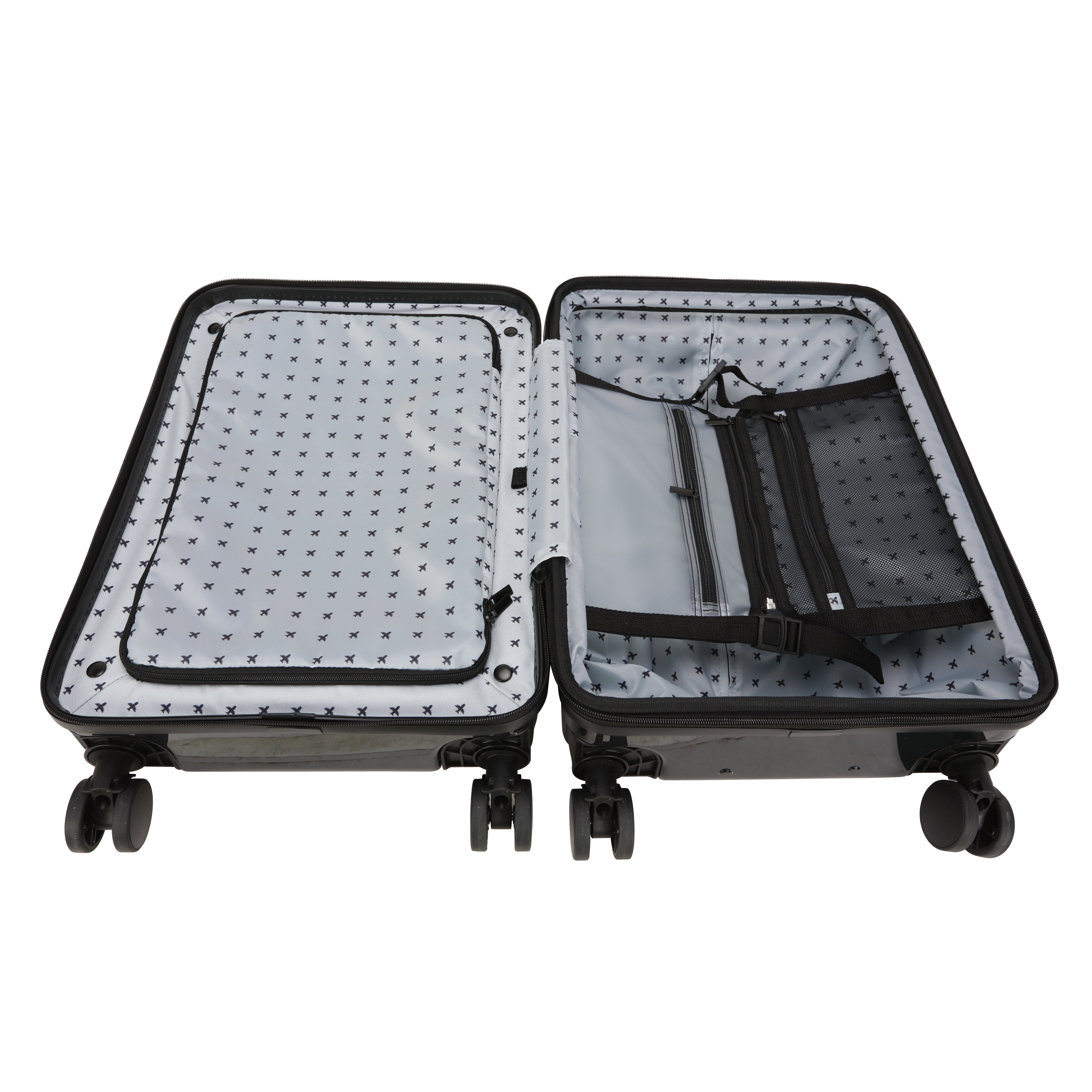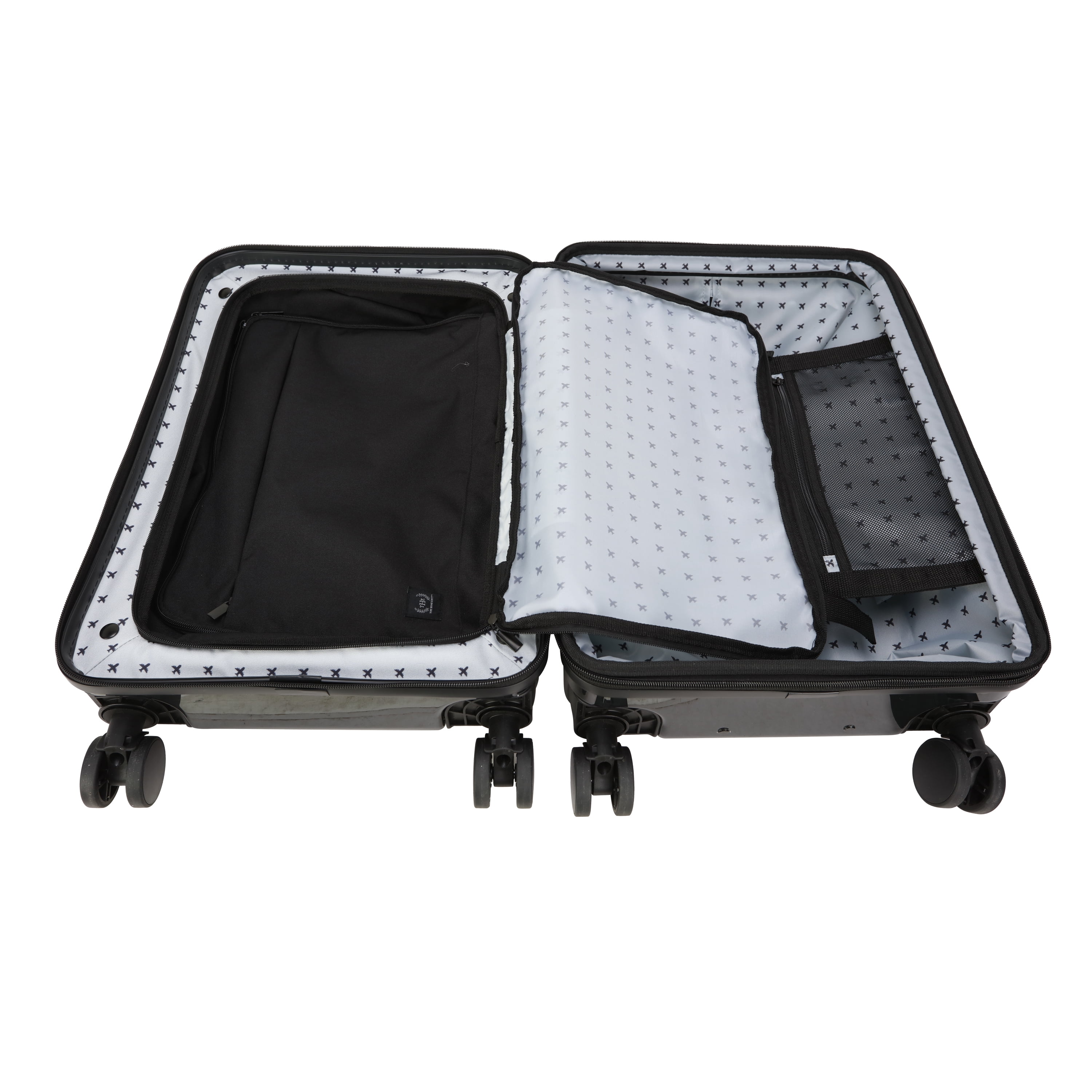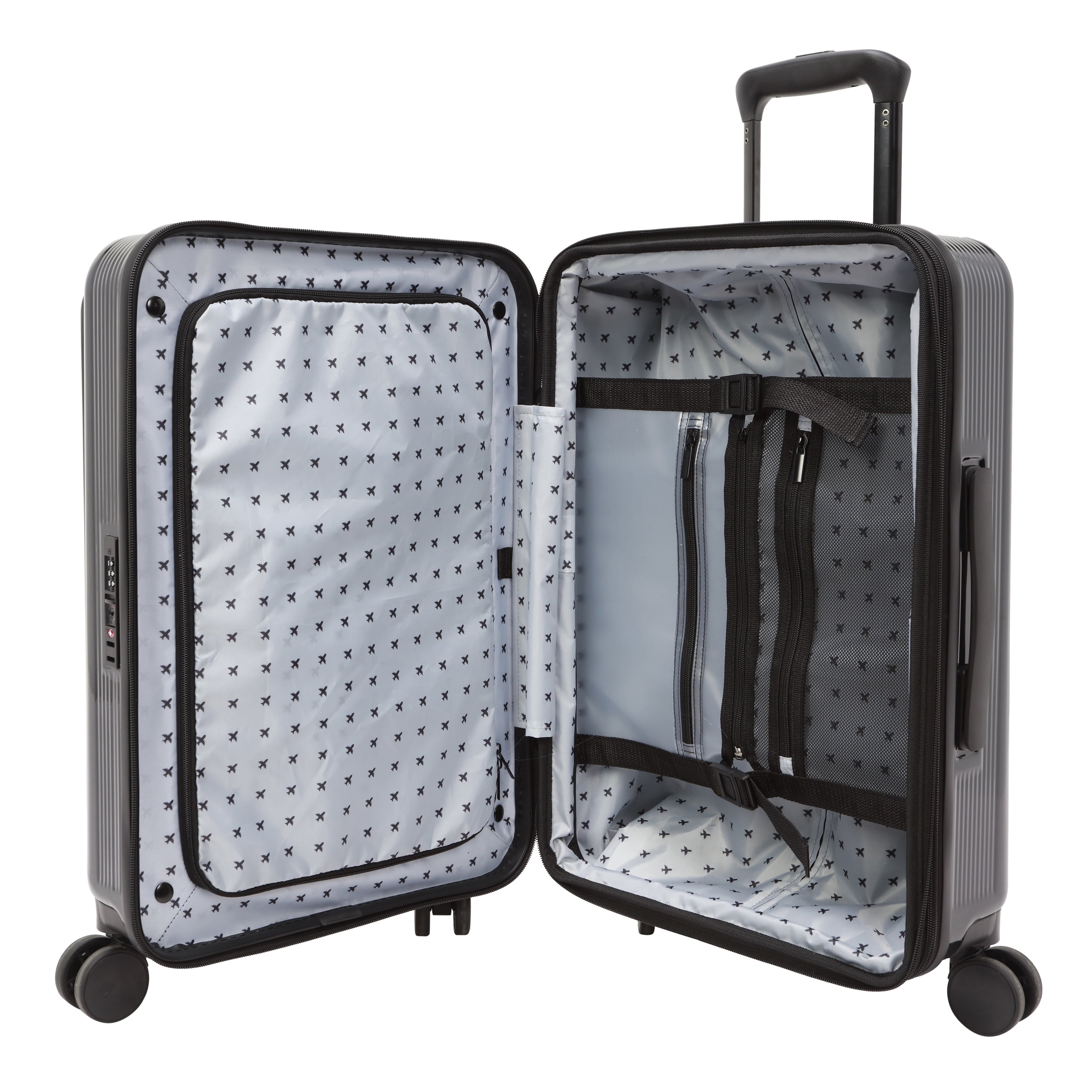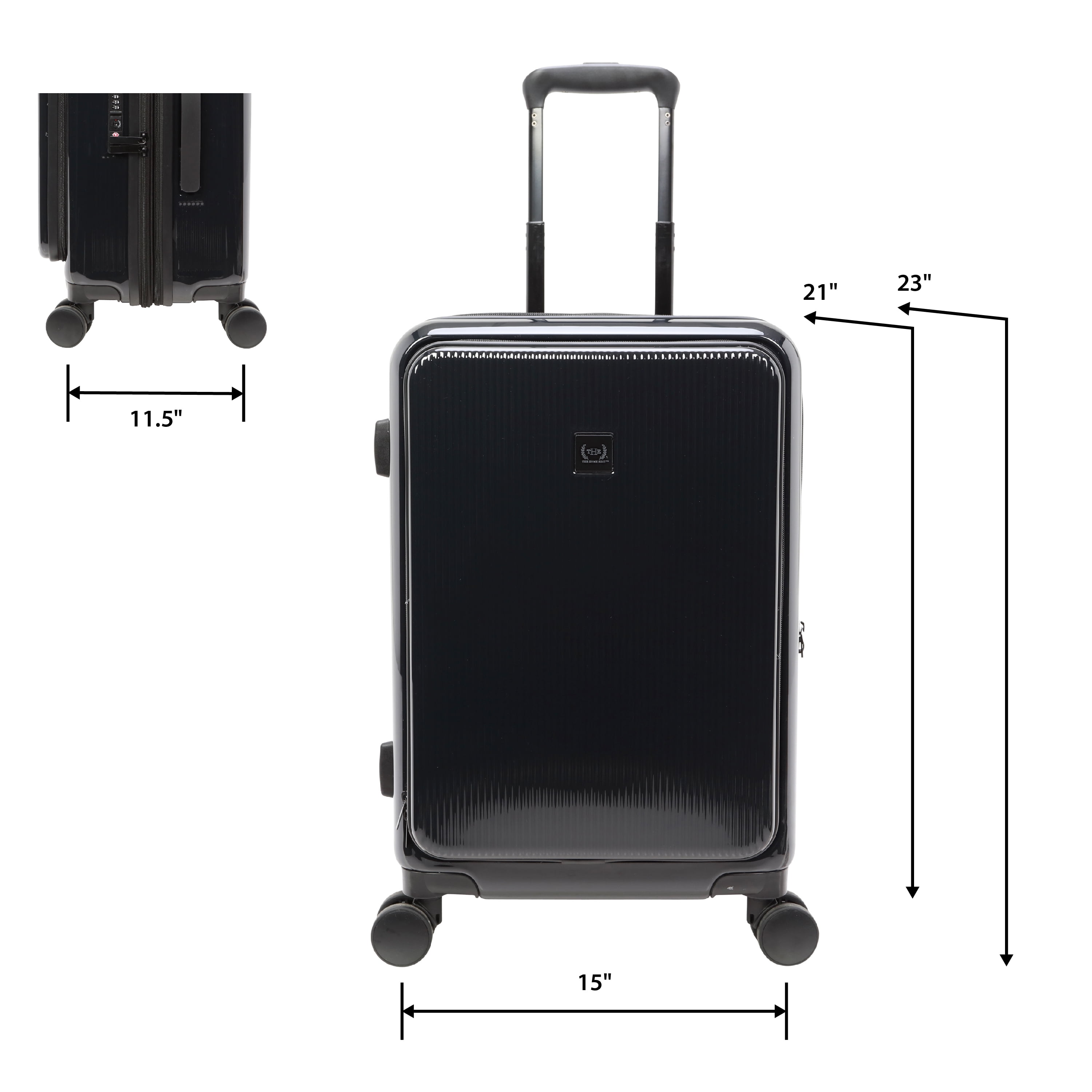 The Home Edit 21″ Hybrid Luggage in 4 colorways – Black, Green, Navy and Lavender Removable interior duffel for extra storage Dimensions: Body 21″ H x 15″ W x 11.5″ D With Wheels 23.5″ H x 15″ W x 11.50″ D and weight 11 lbs ABS Hardsided outer shell Polyester fabric lining TSA lock for security purposes Front pocket unzips for easy access to laptop, tablet and extra organization Inside wet pocket and mesh pocket Compression straps for holding clothing in place during travel 360-degree spinner wheels Matching metal hardware Top and side carry handles and telescopic adjustable handle