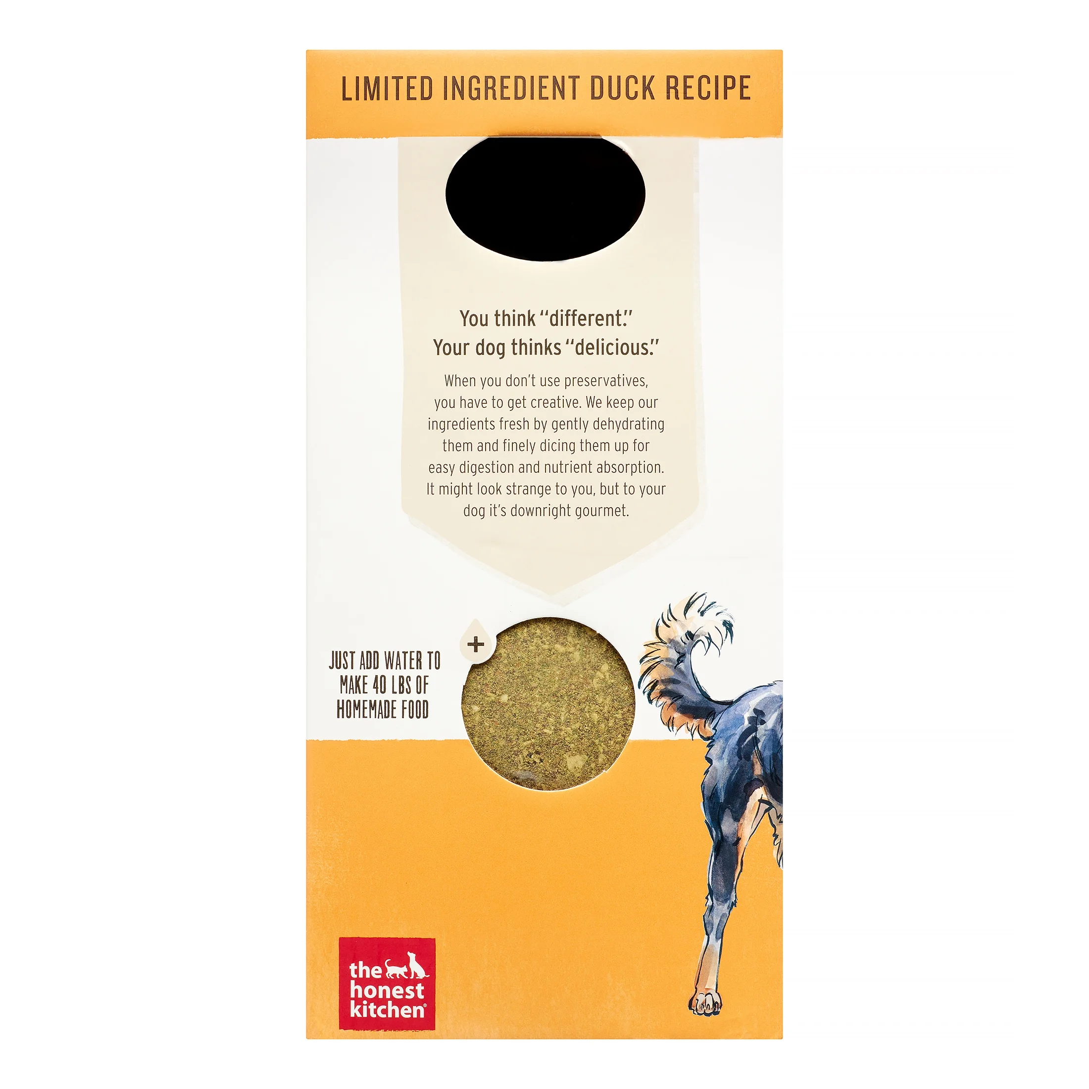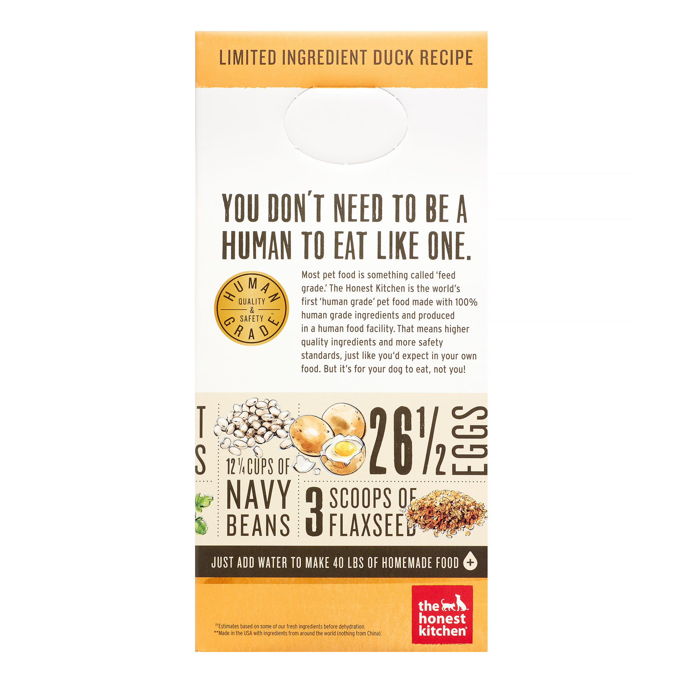 GRAIN-FREE: Gentle on sensitive stomachs, this minimalist dog food is made with just 6, grain-free ingredients including cage-free duck and sweet potato DEHYDRATED: The limited number of ingredients is perfect for dogs of all ages and breeds with food allergies or simplified diets HUMAN GRADE: The Honest Kitchen meets the rigorous FDA safety standards to use the label ‘human grade’, ensuring the highest quality dog treats. ALL NATURAL: This dog food is made with no by-products, preservatives or GMO ingredients – just add water for a warm and delicious meal.
