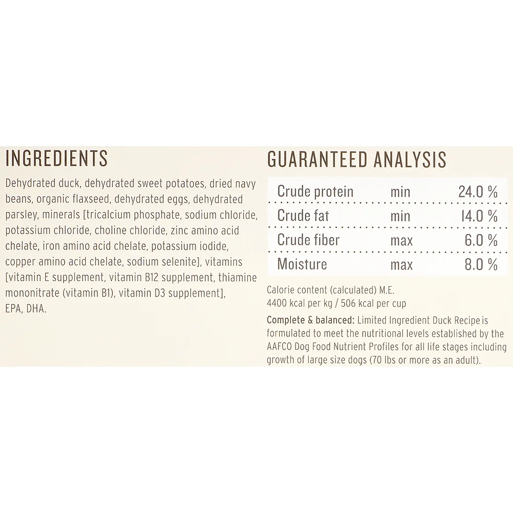 When your dog has sensitivities to ingredients in most bags, it’s time to start thinking inside the box. Delicious, cage-free duck is a unique protein for your pup’s touchy and unique tummy. This simple recipe is easy on the digestive tract and on the taste buds. Six grain-free ingredients unite to form a complete and balanced meal, but the limited number of ingredients make it gentle on pups who require a minimalist diet. Featuring only 100% human-grade ingredients you want, and 0% nothing you don’t.