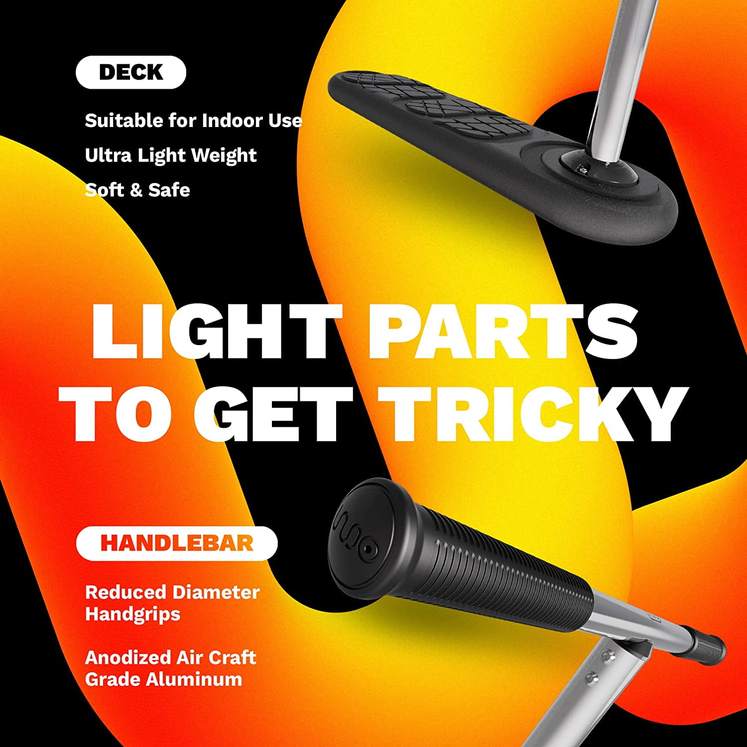 Indo Stunt Scooter for Kids & Teens 9-15 17 inch Perfect for active kids and teens: Helps build balance and allows for trying new scooter tricks Designed for use on both the floor and trampoline, making it versatile for indoor and outdoor fun Features a headset system for smoother rotation and faster trick landing, enhancing the riding experience A lightweight aluminum frame ensures ease of use and safety for beginners and mid-level users Includes a comfortable handlebar for better grip and control during rides