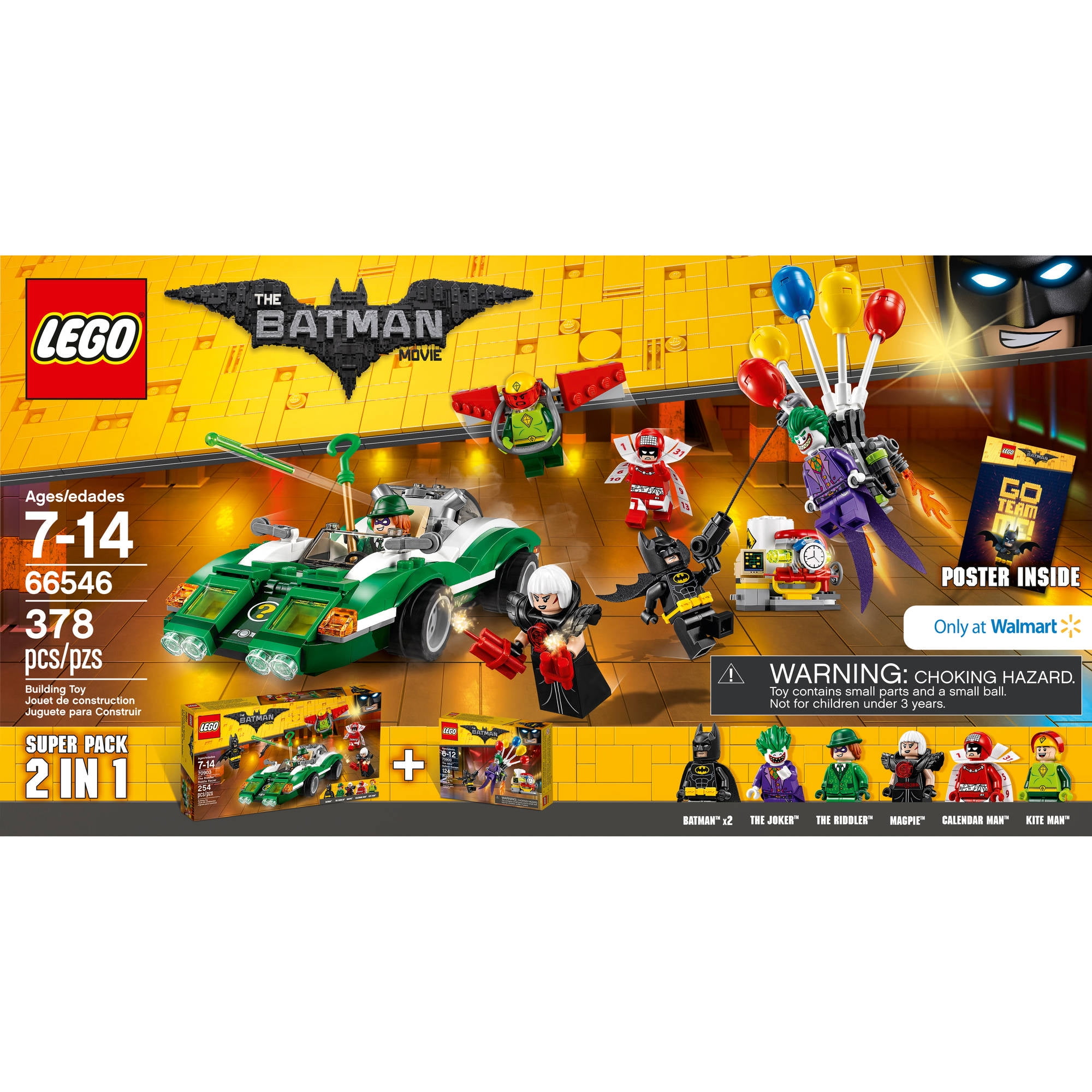 Includes six minifigures: Batman, The Riddler,Magpie, Calendar Man, Kite Man and The Joker ? The Riddle Racer features a dualexhaust with two flip-up, spring-loaded shooters, secret front compartment withtwo hidden guns, an open minifigure cockpit, plus wing mirror and translucentheadlight/indicator light-style elements.? Attach Kite Man?s glider pack withposable wings to take the action to the sky.? Weapons include Batman?sBatarang, and Magpie?s two dynamite elements.? Accessory elements includeBatman?s cape and new-for-spring-2017 molded utility belt, The Riddler?s tophat and cane, Magpie?s armor, Calendar Man?s calendar cape, and Kite Man?s kiteand helmet.? The Joker?s balloon backpack features five balloon and twotranslucent flame elements.? The power plant features a silo with explodefunction, pipes, plus computer, pressure meter and bomb elements.? Weaponsinclude Batman?s grappling gun with string attached.? Accessory elementsinclude Batman?s cape and new-for-spring-2017 molded utility belt, and TheJoker?s special purple coat-tail. ? A collectible poster and instructions foran alternate build included ? Riddle Racer measures over 1? (3cm) high, 7? (18cm) long and 2? (7cm) wide.? Kite Man?s kite measures over 3? (8cm) wide.?Balloon backpack measures over 4? (11cm) high, 3? (9cm) wide and 1? (4cm)deep.? Power plant measures over 2? (6cm) high, 2? (6cm) wide and 2? (7cm) deep