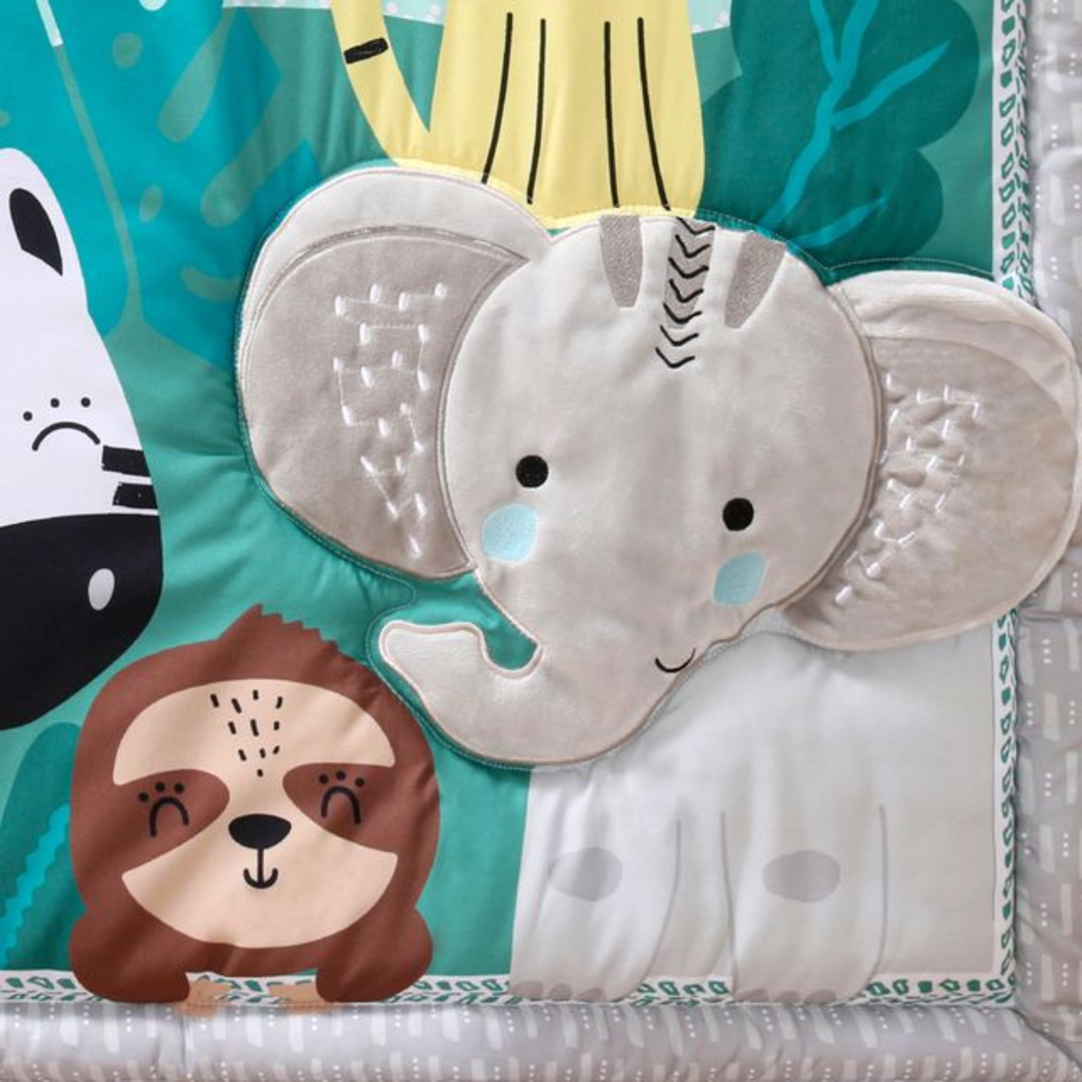 Bring all the jungle vibes right to your baby boy nursery with the 3-piece Safari Adventures baby bedding set by the Peanutshell. Our colorful, multi-functional crib quilt features an elephant, lion, monkey, and more enchanting safari animals hanging out amid leafy scenery in various shades of blue and green. A tonal gray geometric border with printed leaf detail inside perfectly frames this adorable scene. The fitted crib sheet comes in a perfect universal fit, designed for a standard 28? x 52? crib mattress with snug fitting all around elastic. The crib sheet is a soft and stylish allover pattern of bright, colorful jungle animals and leaf clusters. The tonal gray geometric print bed skirt rounds out the look. Coordinate this set with our other jungle themed nursery decor, crib mobiles and sheet set to complete your Safari Adventures bedroom.