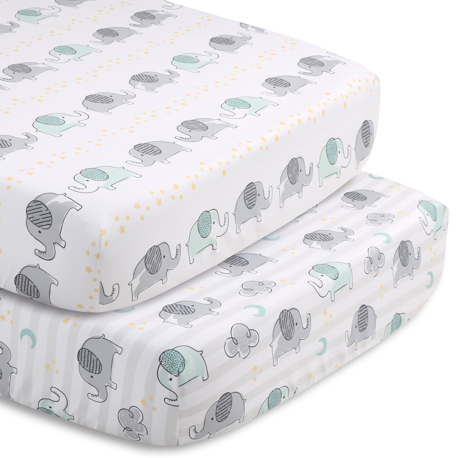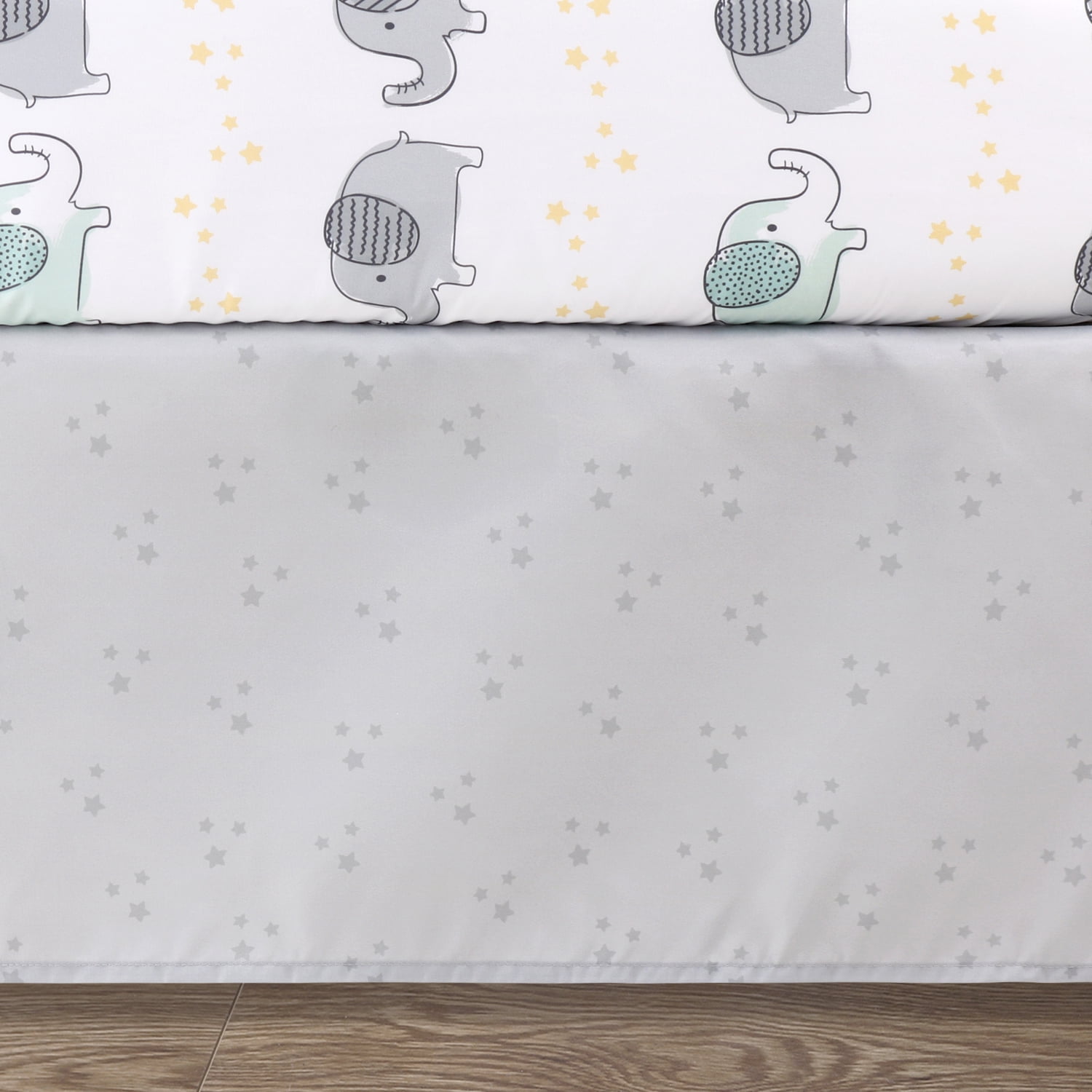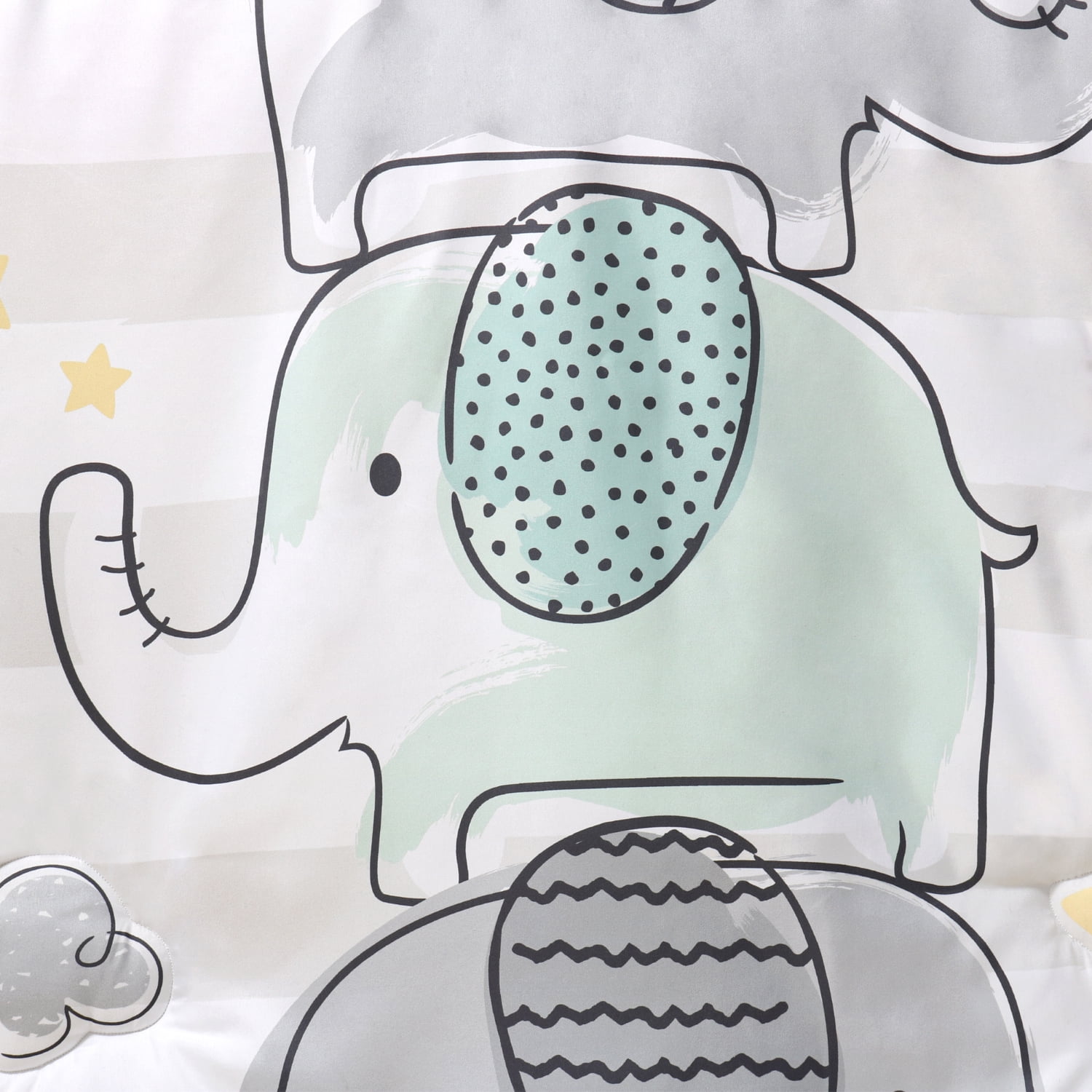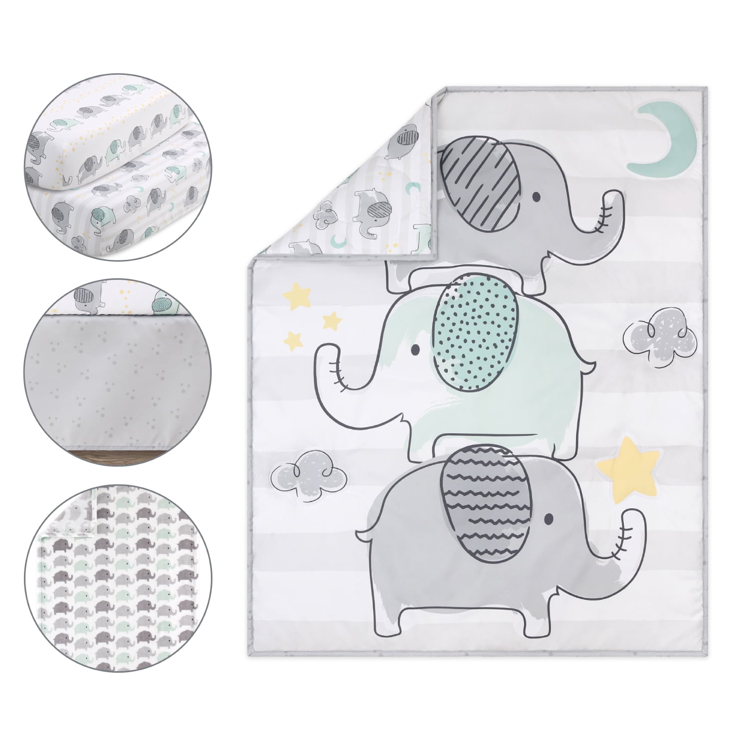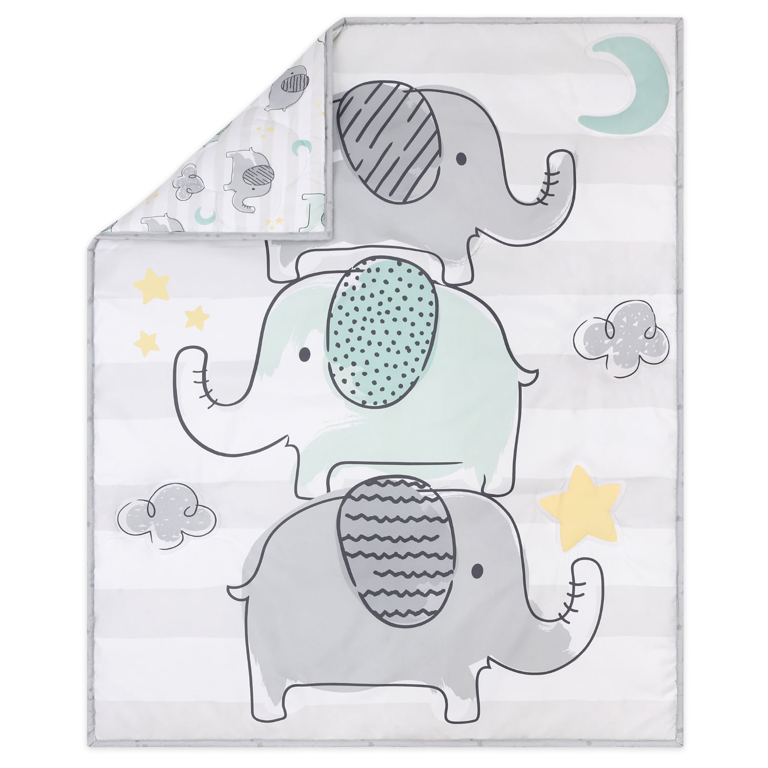 A stack of playful elephants stands tall in this 5 piece Elephant Dream baby bedding set from The Peanutshell. Our generously sized 32″ x 41″ soft and cozy quilt features a trio of gray and aqua elephant friends a top a wide light gray stripe and surrounded by a sky of moons, clouds, and stars. The quilt is finished in a gray border. Two fitted crib sheets are included in this 5 piece nursery set. Both are a perfect universal fit, designed for a standard 28” x 52” crib mattress with snug fitting all around elastic. One sheet features mint and gray elephants scattered among clouds, moons, and stars, the second fitted sheet print features a linear layout of parading elephants and rows of yellow stars. The tonal gray star printed bed skirt rounds out this gender-neutral look. The 30″ x 40″ burnout velour blanket with gray and aqua elephant silhouettes is the perfect accessory for stroller walks or comfy cuddles.