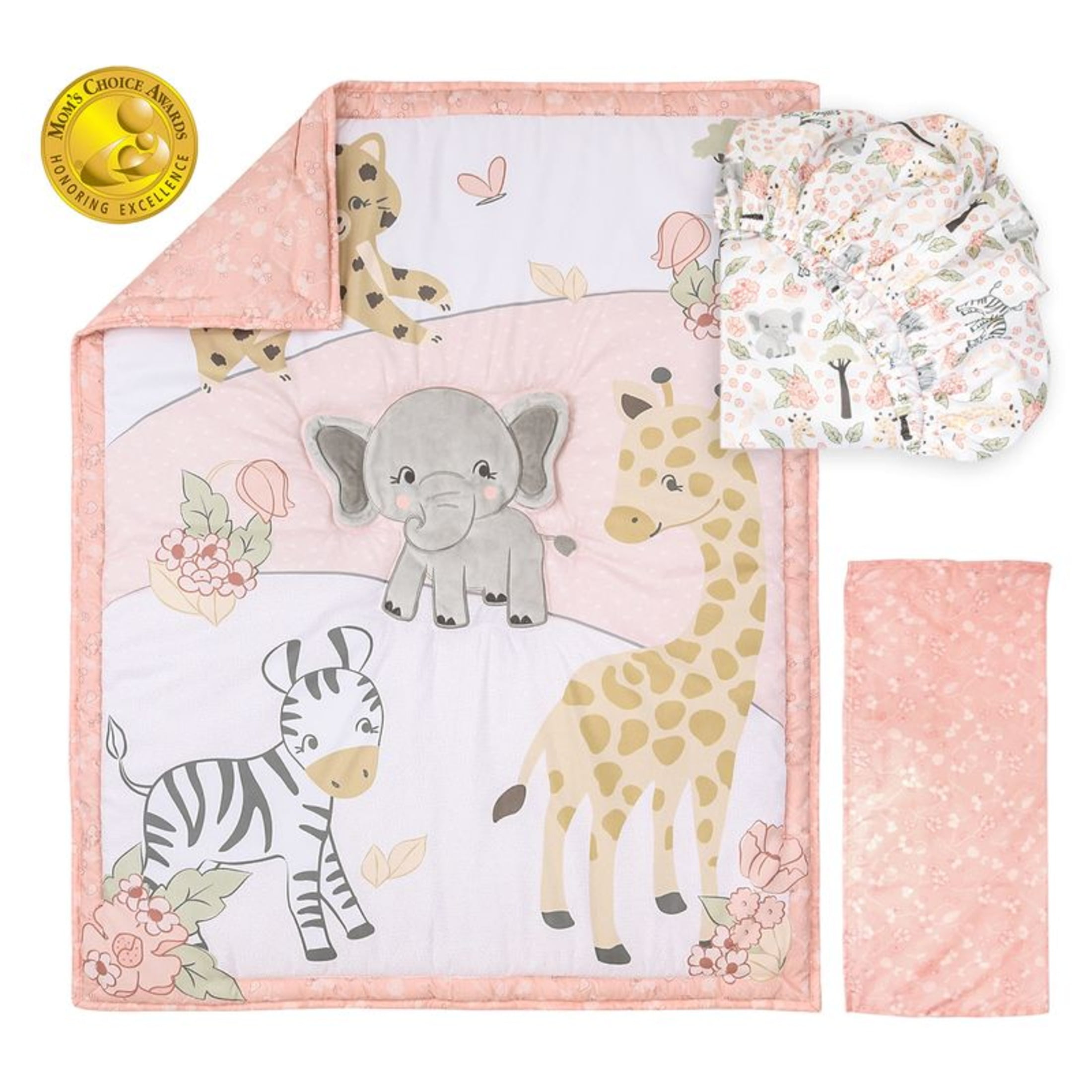 Bring sweet safari style to your baby girl nursery with this darling 3-piece Wildest Dreams baby bedding set by The Peanutshell. Our multi-functional crib quilt features a pink floral border that surrounds tender safari animals: elephant, zebra, giraffe, and cheetah as they play amid a hilly landscape. The crib sheet is soft and stylish for the perfect universal fit, designed for a standard 28″ x 52″ crib mattress with snug fitting all around elastic. The thoughtfully detailed fitted crib sheet features animals and flowers tossed together in an interesting mirror image pattern. The soft pink floral printed bed skirt adds even more feminine flair. Coordinate this set with our nursery décor, crib mobiles and sheet sets to complete your Wildest Dreams baby girl bedroom.