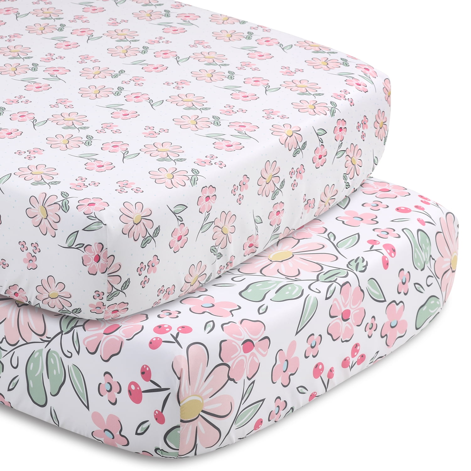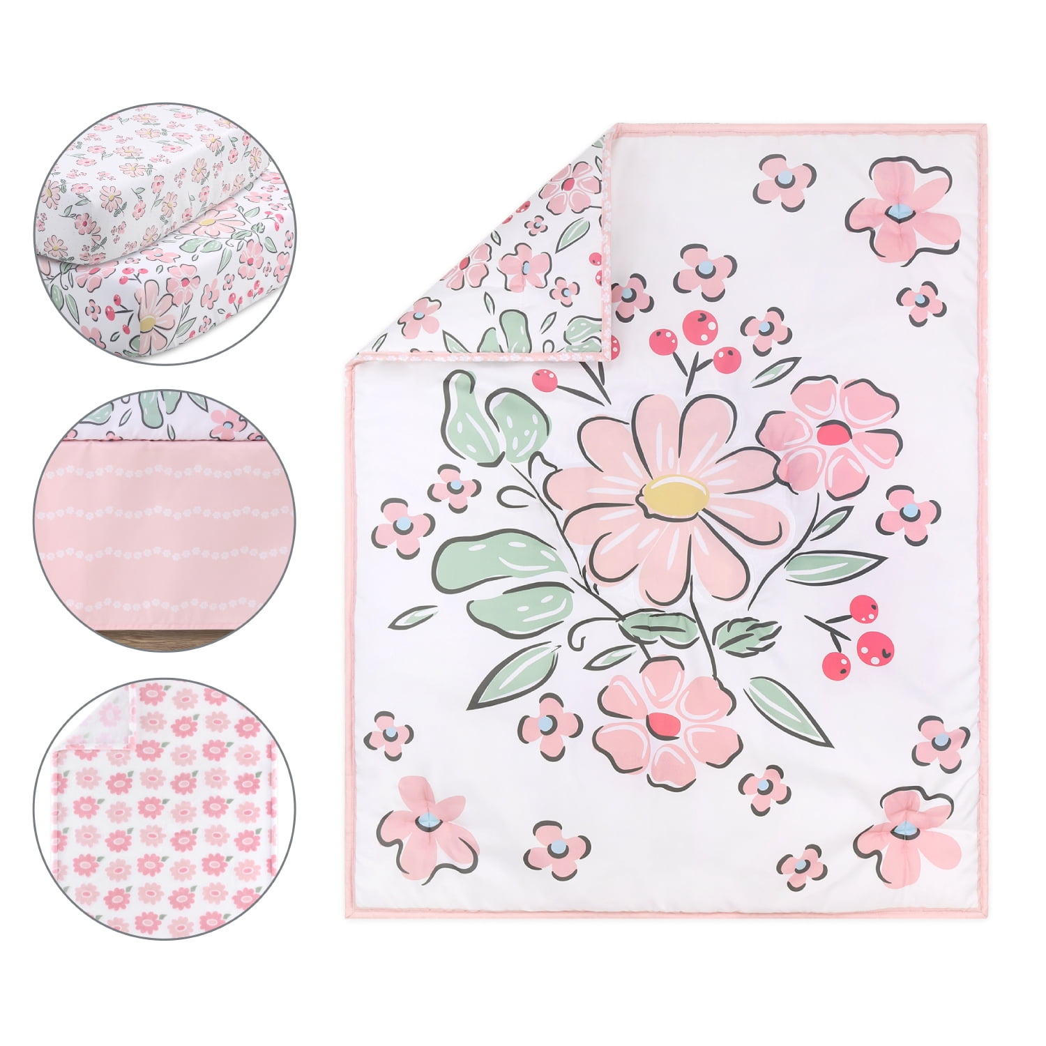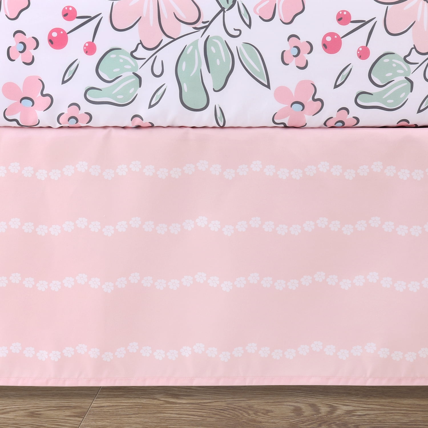 Fantastic flowers are scattered about in this 5 piece Floral Fun baby bedding set from The Peanutshell. Our generously sized 32″ x 41″ soft and cozy quilt features variously sized pink flowers, accented with pops of blue and yellow and outlined in a gray brush stroke. The gorgeously girly artwork is finished in a soft pink border. Two fitted crib sheets are included in this 5 piece nursery set. Both are a perfect universal fit, designed for a standard 28” x 52” crib mattress with snug fitting all around elastic. One sheet features large tossed florals, the second fitted sheet print features a smaller floral pattern. The pink and white flower striped bed skirt rounds out this feminine look. Our 30″ x 40″ burnout velour blanket with pink flower silhouettes is the perfect accessory for stroller walks or comfy cuddles
