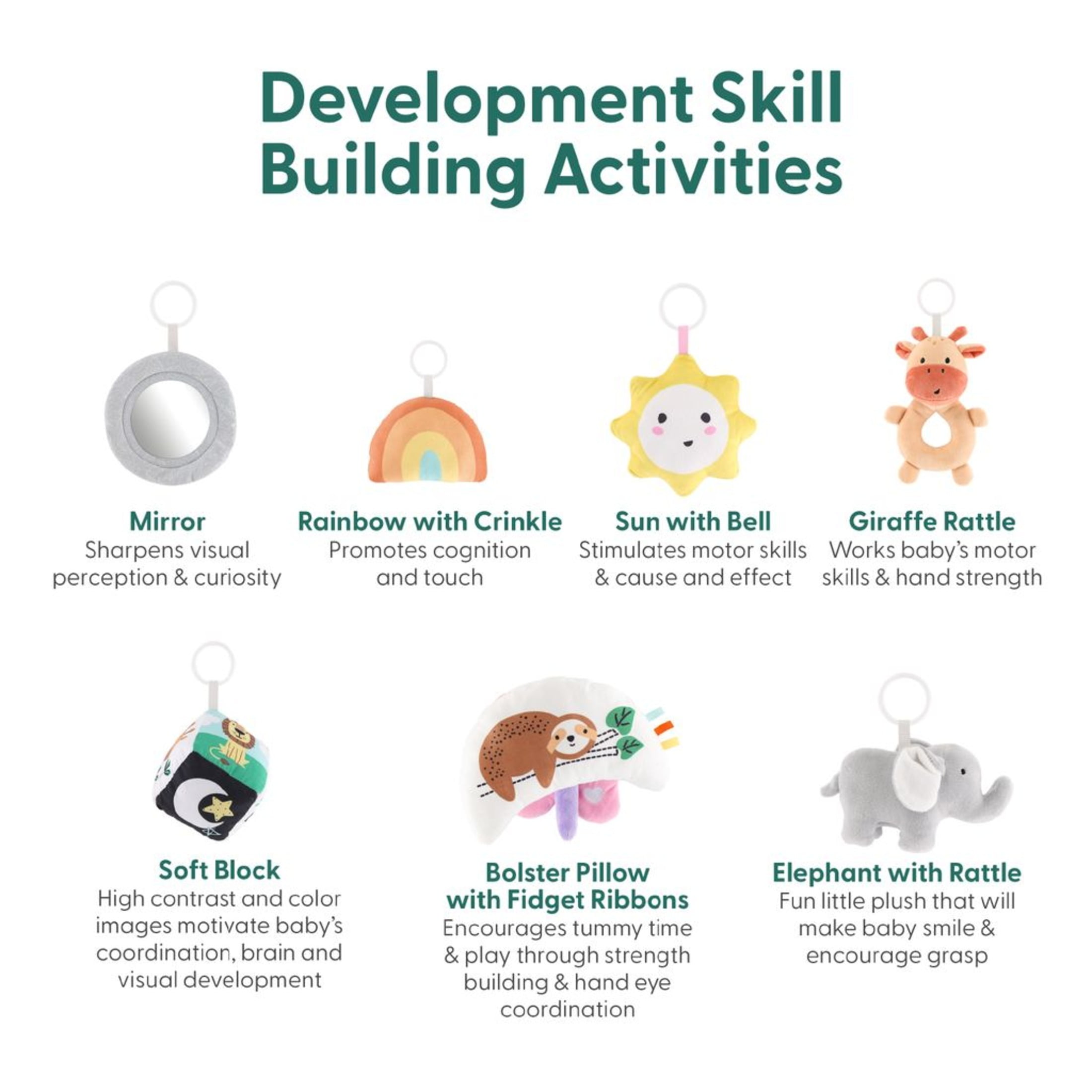 The Peanutshell 7 in 1 Baby Play Gym and Play Mat, Safari 123 is the perfect place for your baby to stretch out for stimulating tummy time! Designed to capture baby’s attention, the Safari 123 Play Gym from The Peanutshell is the ultimate spot for educational fun and entertainment. The Montessori inspired interactive mat is the perfect pad for educational fun and entertainment. Let baby’s imagination roam wild as they engage with 6 removable hanging toys and a pillow headrest. Each adorable plush piece promotes visual and auditory sensory development and encourages cause-and-effect learning. Capture baby’s curiosity as they see, hear and touch safari animals, shapes, letters, colors, numbers, and trees. From fidget ribbons, mirrors, and rattles to crinkles and bells, these interactive toys strengthen fine motor skills and enhance cognitive development. The easy-to-assemble play gym accommodates baby’s milestones through lay down, tummy time and sitting up development stages. Sturdy gray botanical crossbars and a non-skid backing ensure hours of safe play. Clean up is a breeze too, simply wipe clean with a damp cloth and fold flat for easy storage.