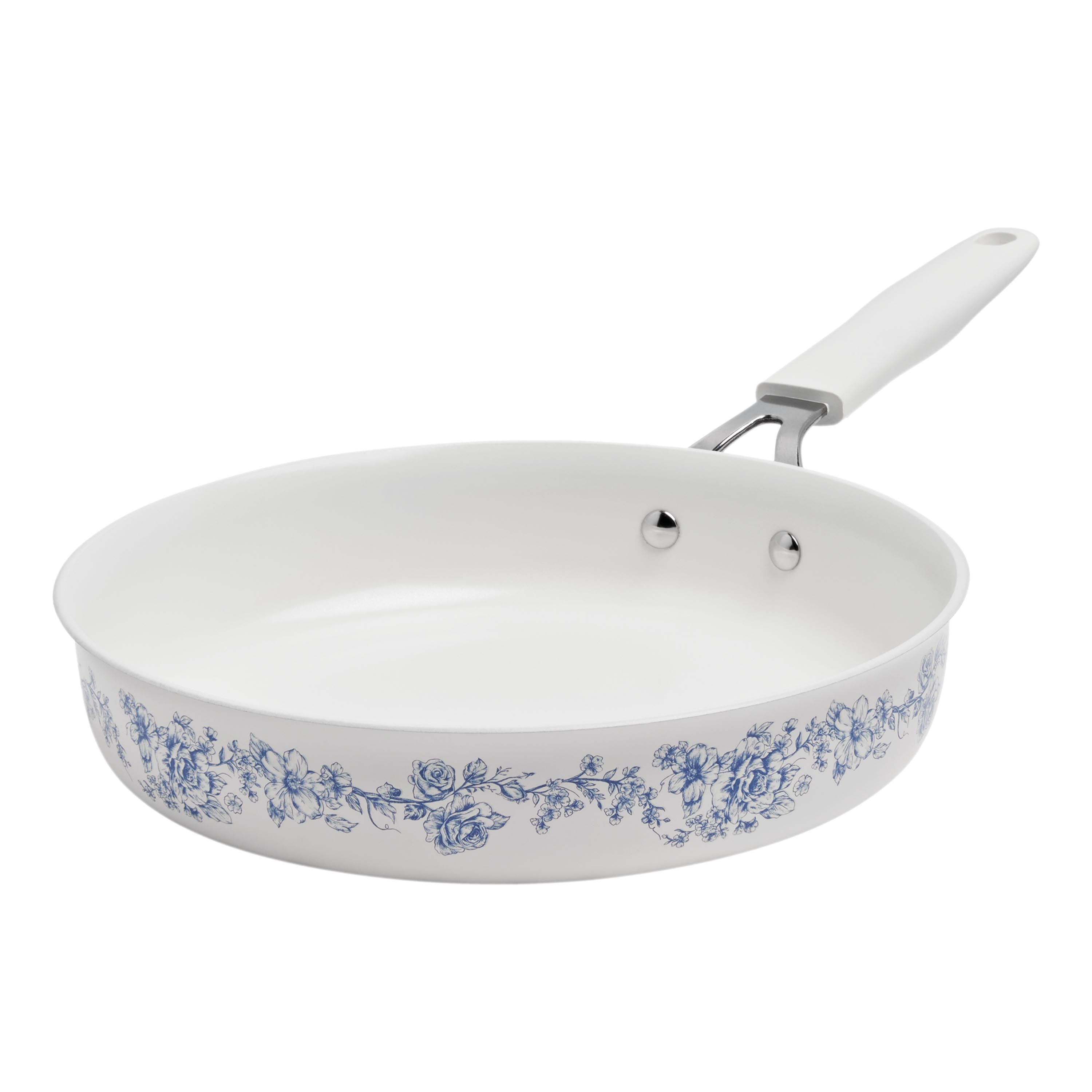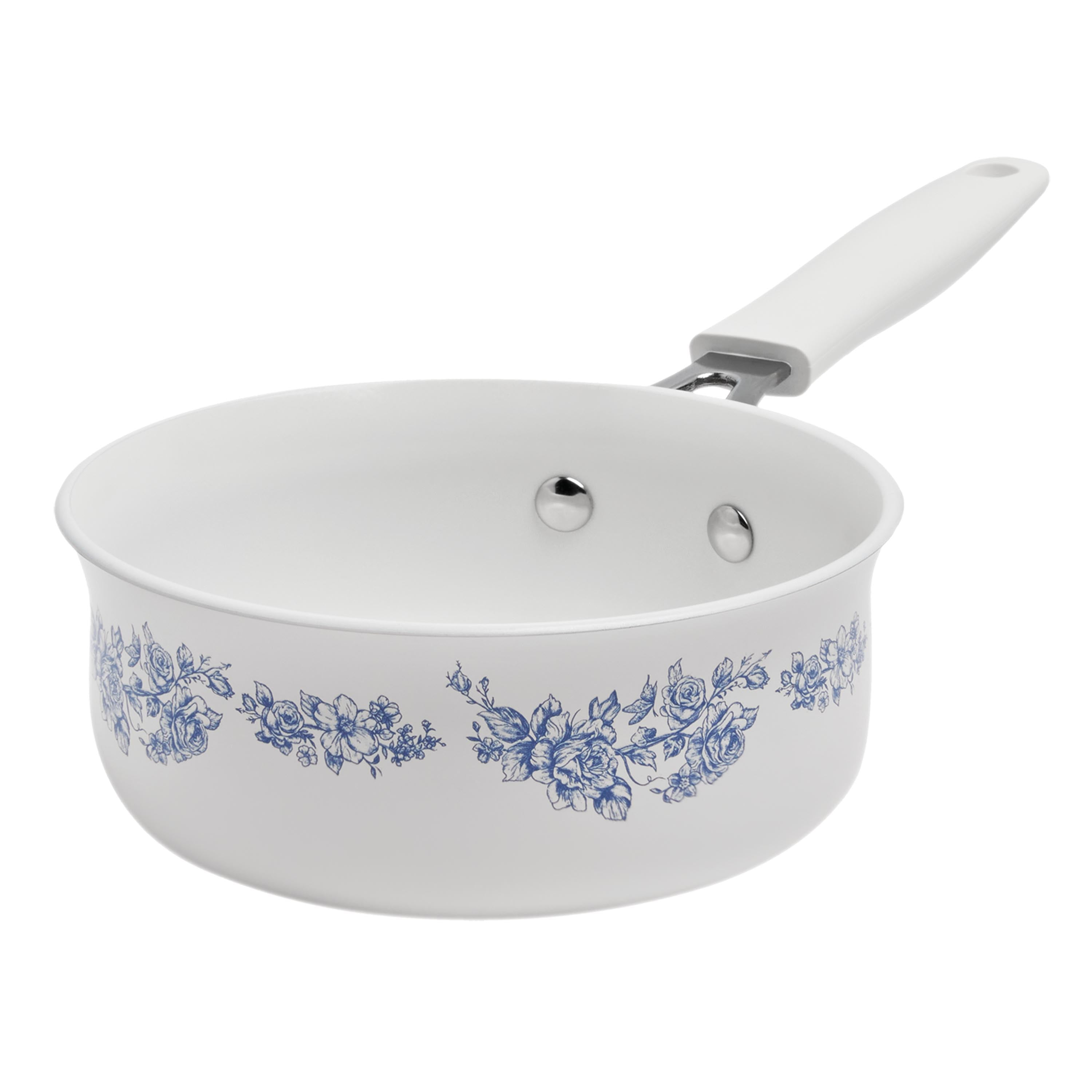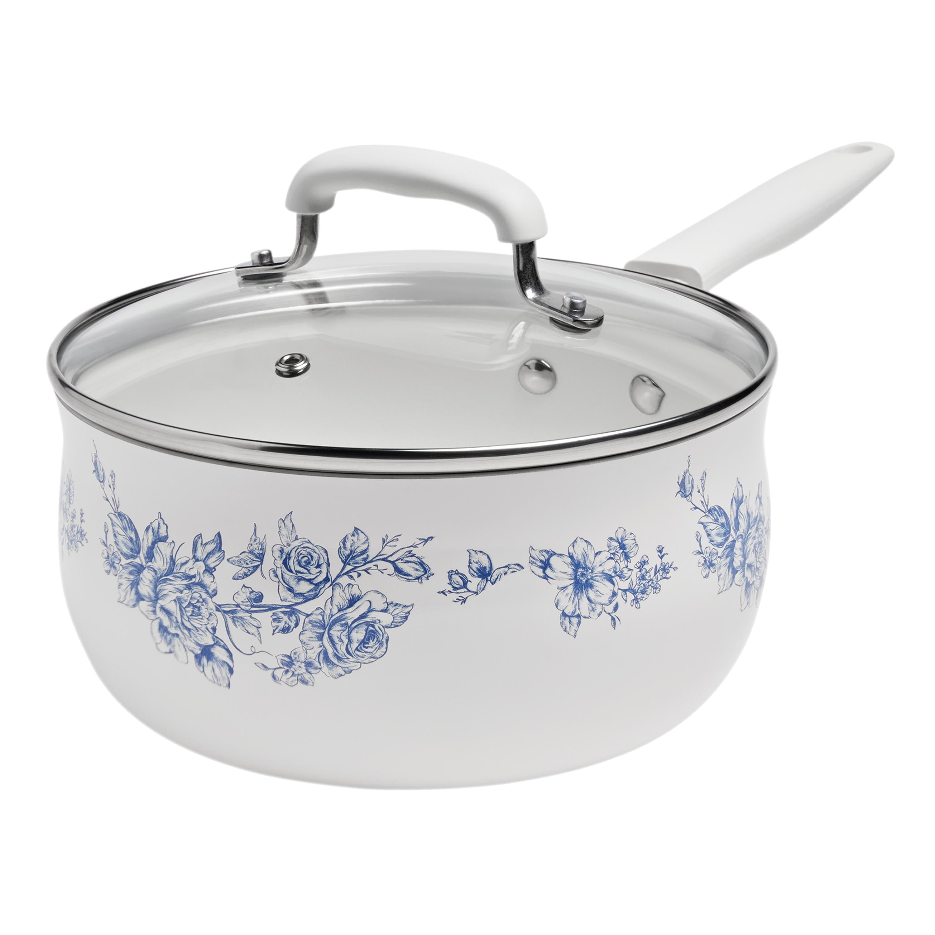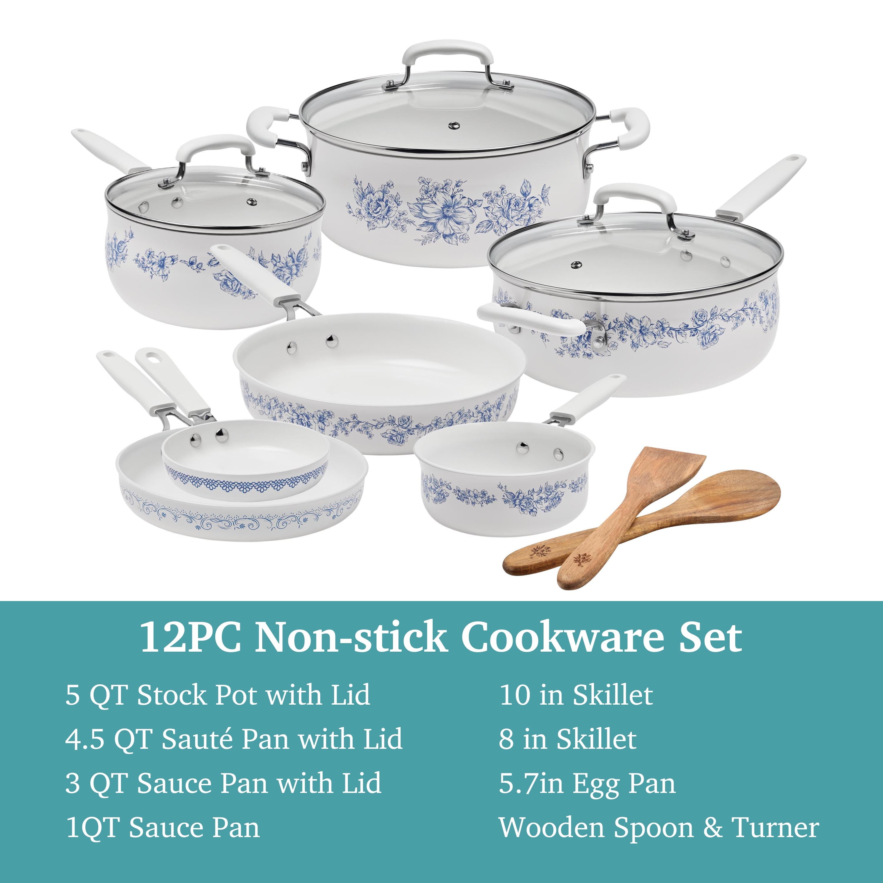 The Pioneer Woman Agatha 12-Piece Aluminum & Ceramic Classic Cookware Set Each cookware piece comes decorated with Ree’s signature floral designs in vibrant colors Provides excellent heat conduction and uniform cooking Riveted stainless steel handles offer comfort and convenience Durable aluminum body delivers quick and even heating Ceramic non-stick interior makes it easy to remove food once it’s done cooking Compatible with induction, gas, electric, halogen, and vitroceramic stove tops Tempered glass lid allows to keep a close eye on the cooking process without lifting the lid and easily monitor the texture, color of the food. Hand wash recommend Set includes: (1) 1-quart saucepan, (1) 3-quart saucepan with lid, (1) 4.5-quart saute pan with lid, (1) 5-quart Dutch oven with lid, (1) 8″ skillet, (1) 10″ skillet, (1) egg pan, (1) acacia wood turner, and (1) acacia wood ladle Heat resistant painting performs easy clean-up Clear tempered glass lid with vent holes allows you to monitor the cooking process