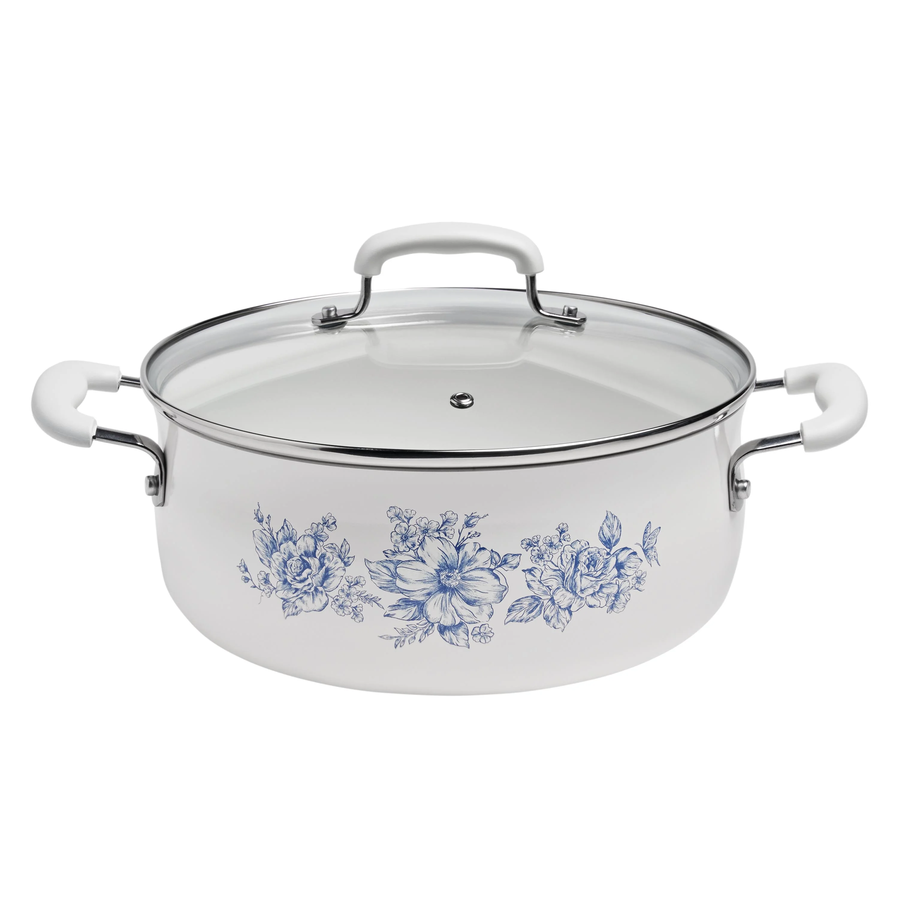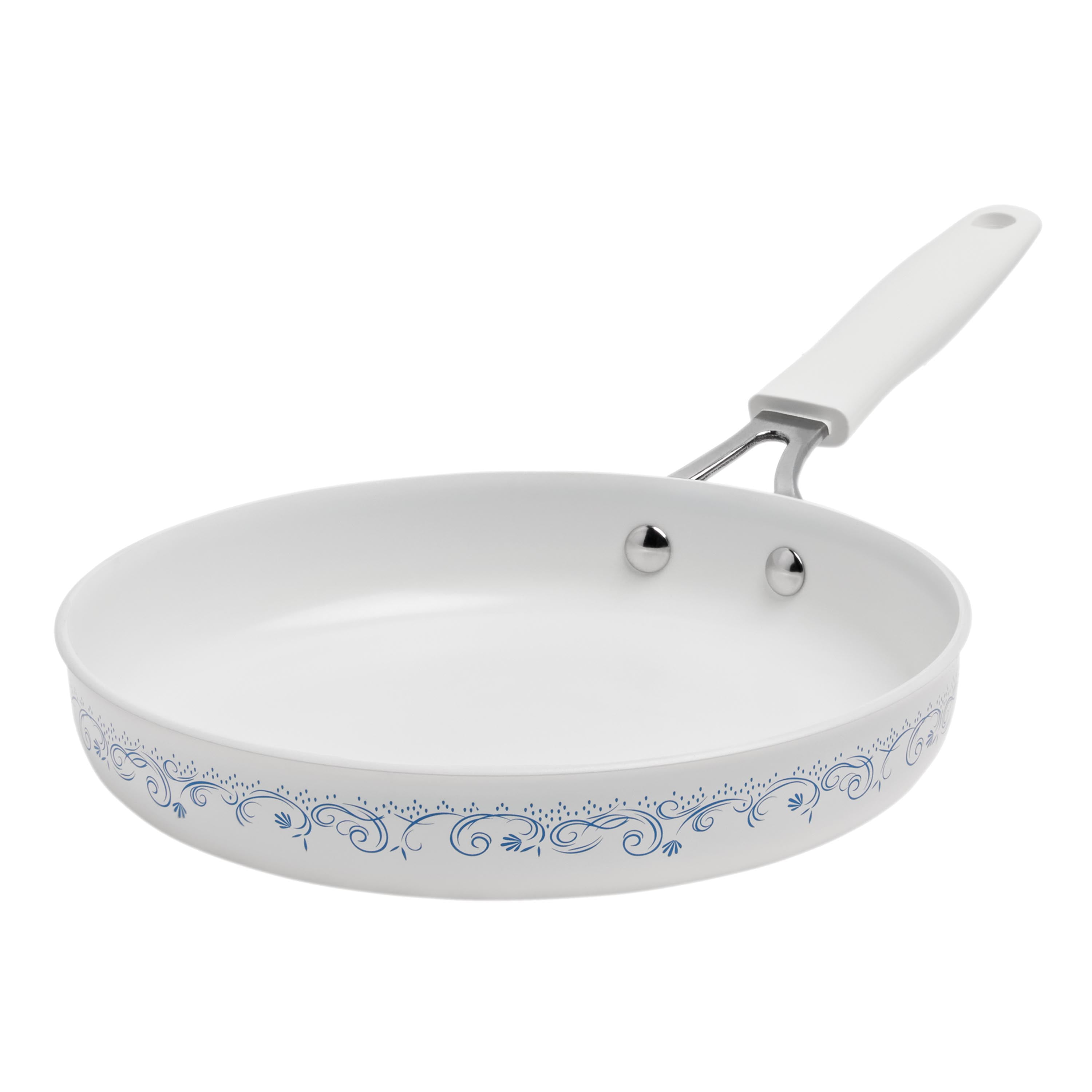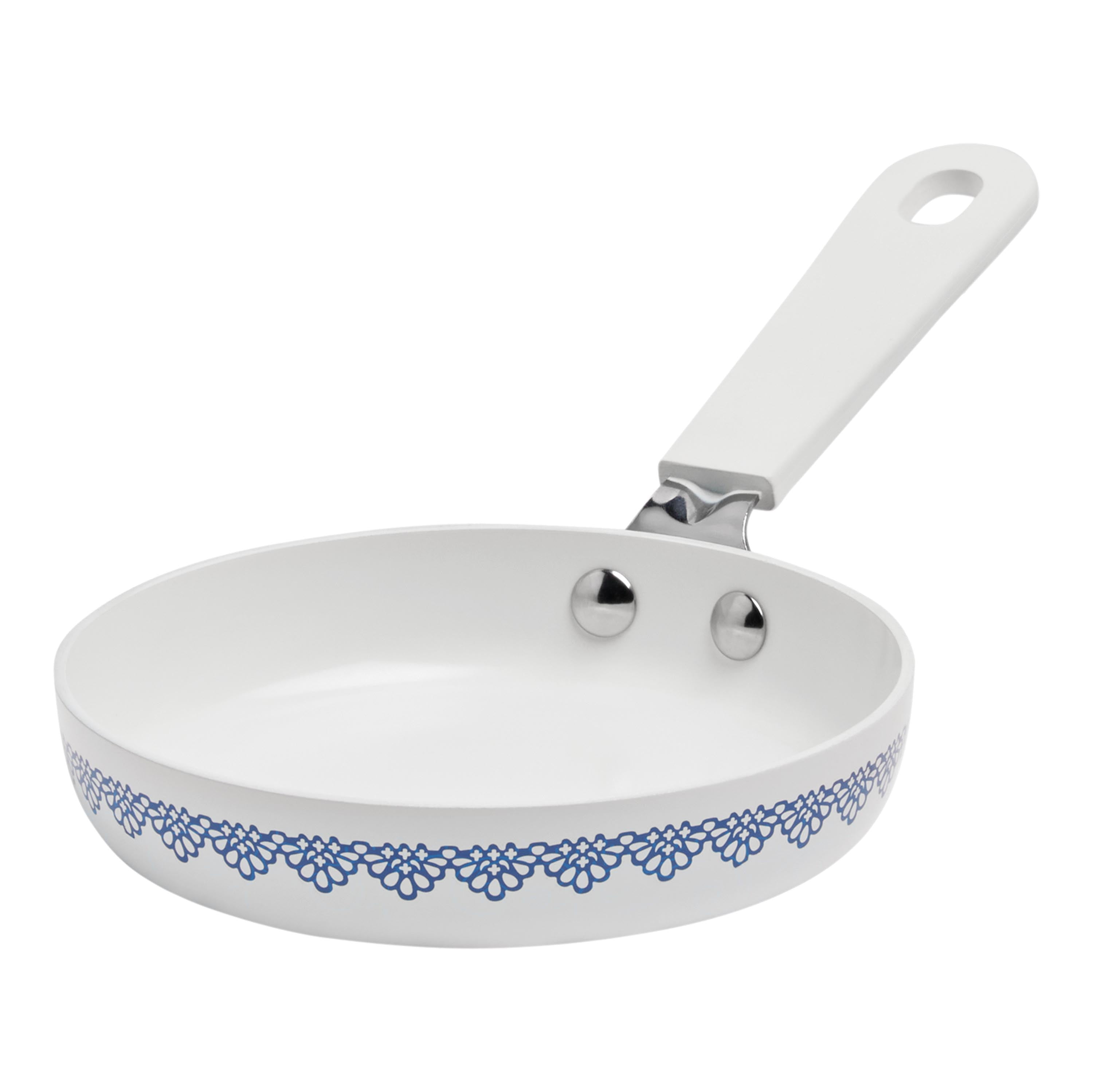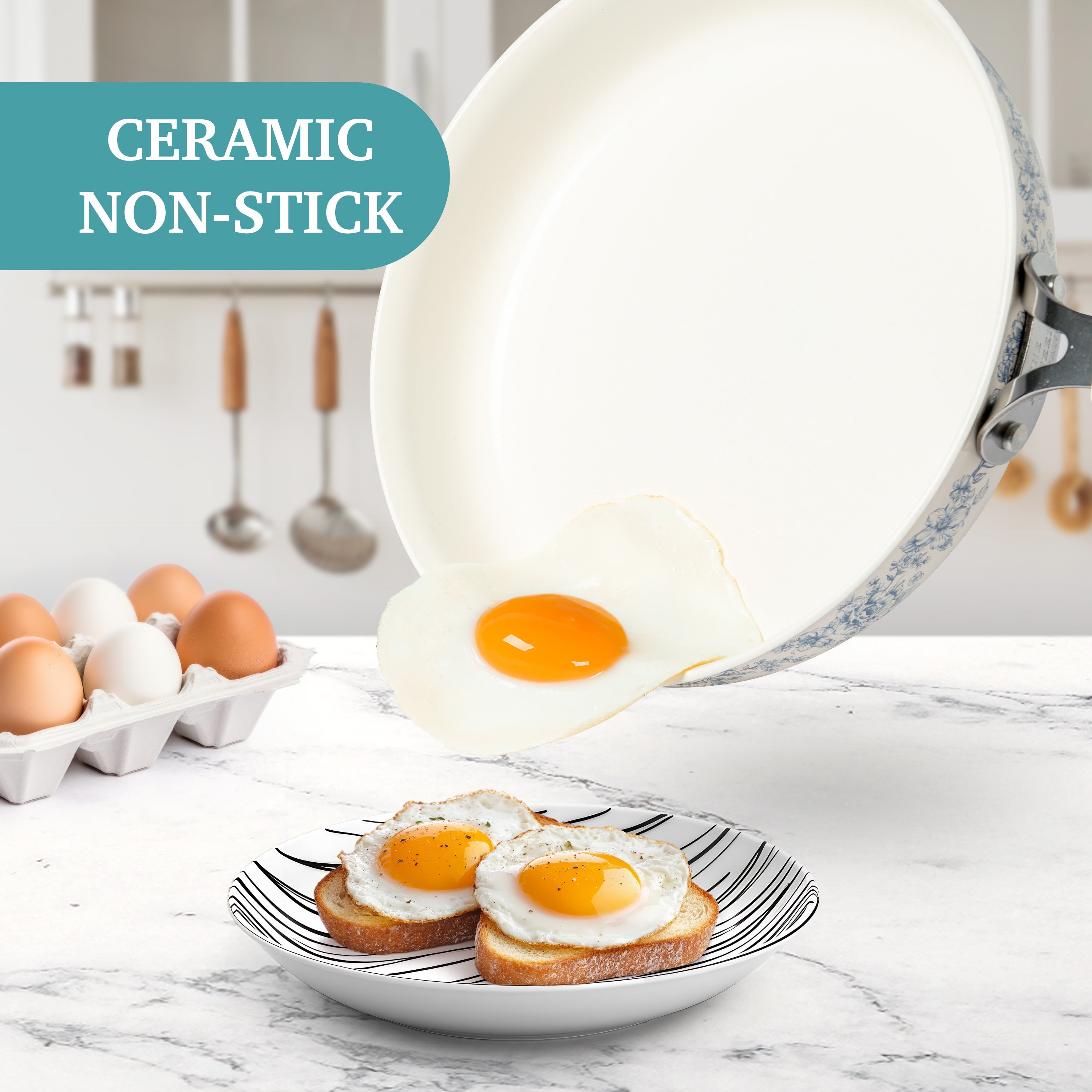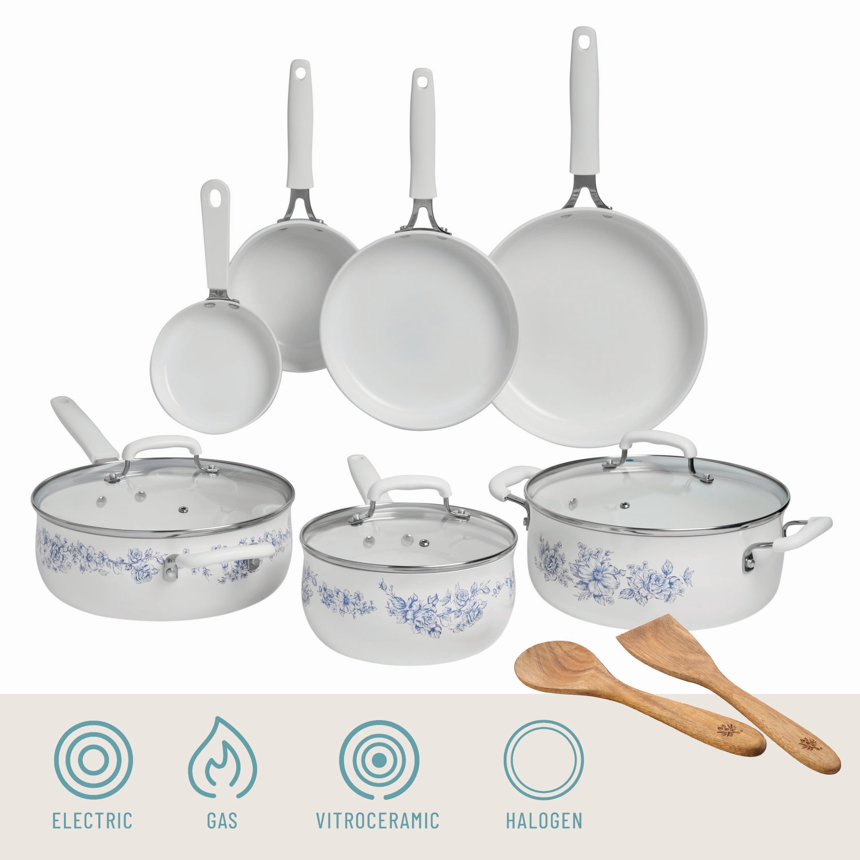 The Pioneer Woman Agatha 12-Piece Aluminum & Ceramic Classic Cookware Set Each cookware piece comes decorated with Ree’s signature floral designs in vibrant colors Provides excellent heat conduction and uniform cooking Riveted stainless steel handles offer comfort and convenience Durable aluminum body delivers quick and even heating Ceramic non-stick interior makes it easy to remove food once it’s done cooking Compatible with induction, gas, electric, halogen, and vitroceramic stove tops Tempered glass lid allows to keep a close eye on the cooking process without lifting the lid and easily monitor the texture, color of the food. Hand wash recommend Set includes: (1) 1-quart saucepan, (1) 3-quart saucepan with lid, (1) 4.5-quart saute pan with lid, (1) 5-quart Dutch oven with lid, (1) 8″ skillet, (1) 10″ skillet, (1) egg pan, (1) acacia wood turner, and (1) acacia wood ladle Heat resistant painting performs easy clean-up Clear tempered glass lid with vent holes allows you to monitor the cooking process