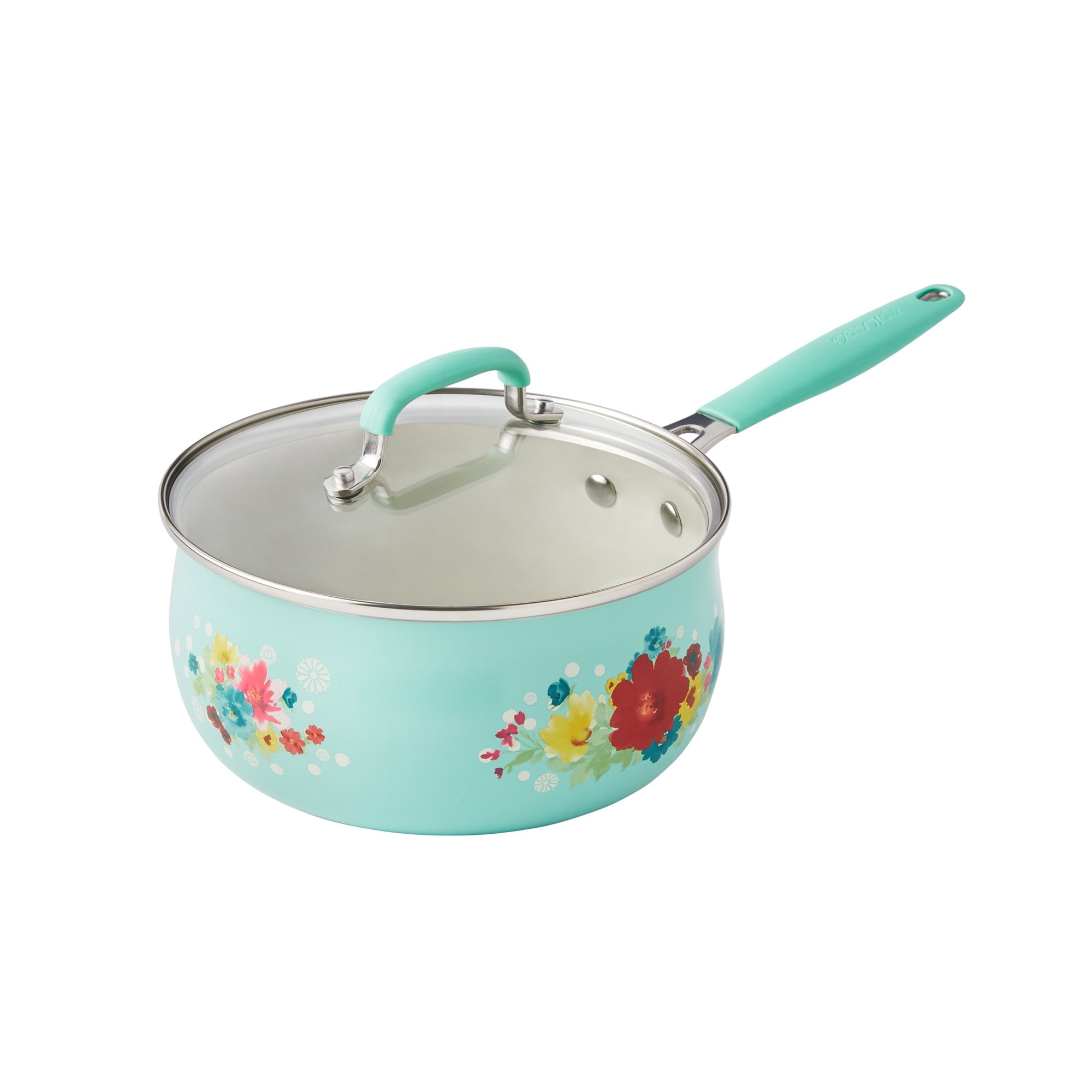 The Pioneer Woman 12-Piece Classic Belly Cookware Set, Decal Each cookware piece comes decorated with Ree’ s signature floral designs in vibrant colors Provides excellent heat conduction and uniform cooking Riveted stainless steel handles offer comfort and convenience Durable aluminum body delivers quick and even heating Ceramic non-stick interior makes it easy to remove food once it’ s done cooking Compatible with induction, gas, electric, halogen, and vitroceramic stove tops Oven safe up to 350-degrees Fahrenheit (176-degrees Celsius) Hand wash recommend Set includes: (1) 1-quart saucepan, (1) 3-quart saucepan with lid, (1) 4. 5-quart saute pan with lid, (1) 5-quart Dutch oven with lid, (1) 8″ skillet, (1) 10″ skillet, (1) egg pan, (1) acacia wood turner, and (1) acacia wood ladle
