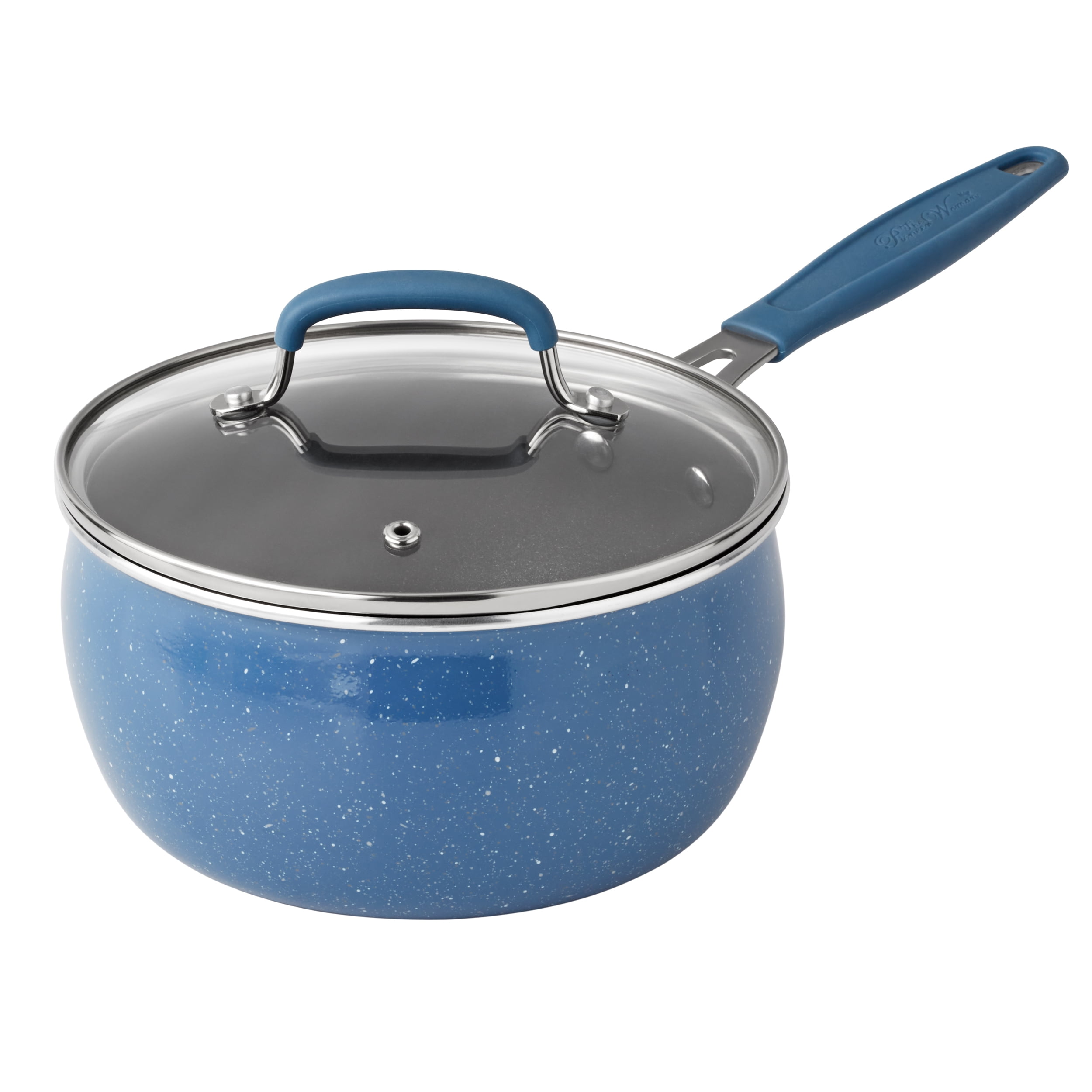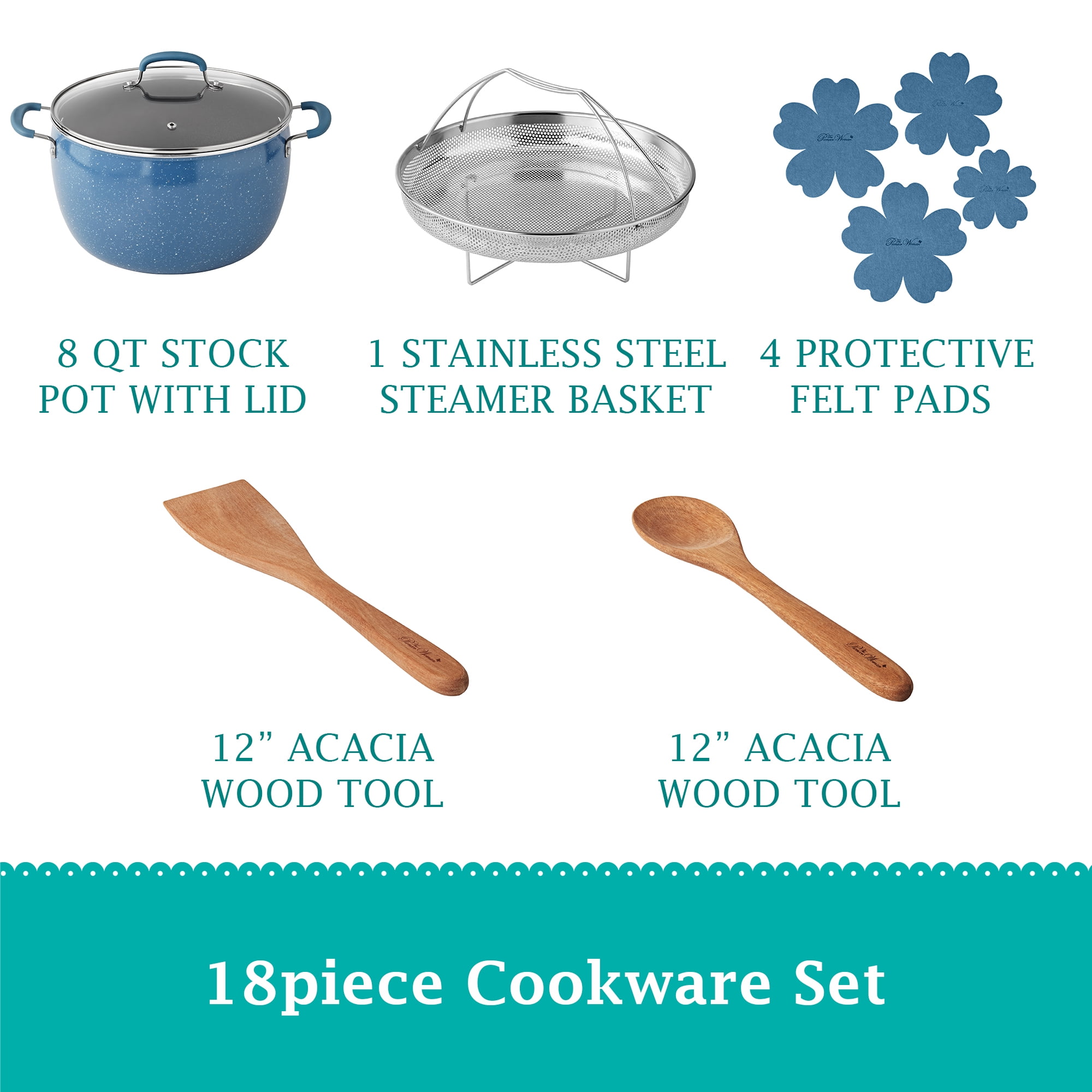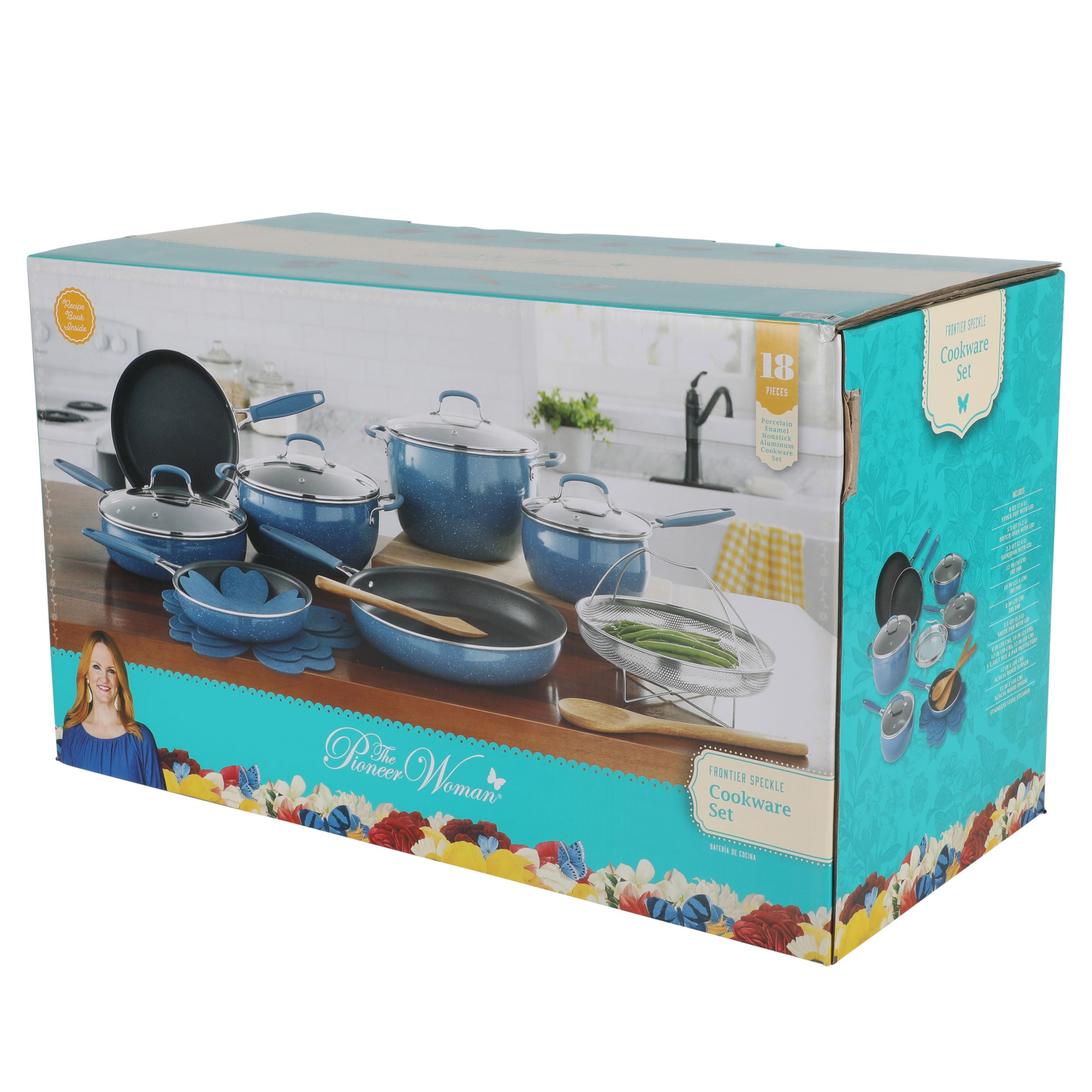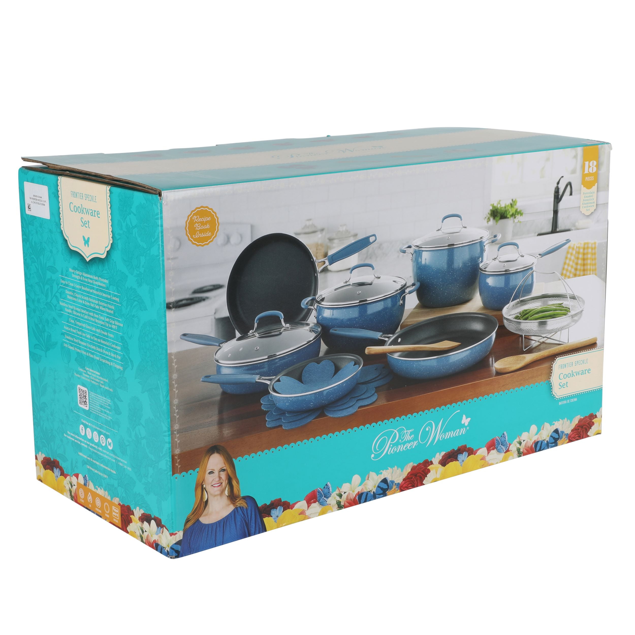 The Pioneer Woman Frontier Speckle 18 Piece Nonstick Aluminum Cookware Set, Blue Includes all essential pots and pans for everyday cooking Nonstick interiors ensure easy food release and hassle-free cleanup Glass lids allow for easy monitoring of the cooking process Set features frying pans, everyday pans, saucepans, lids, wood utensils, protectors, and a strainer Durable acacia wood utensils included for added convenience