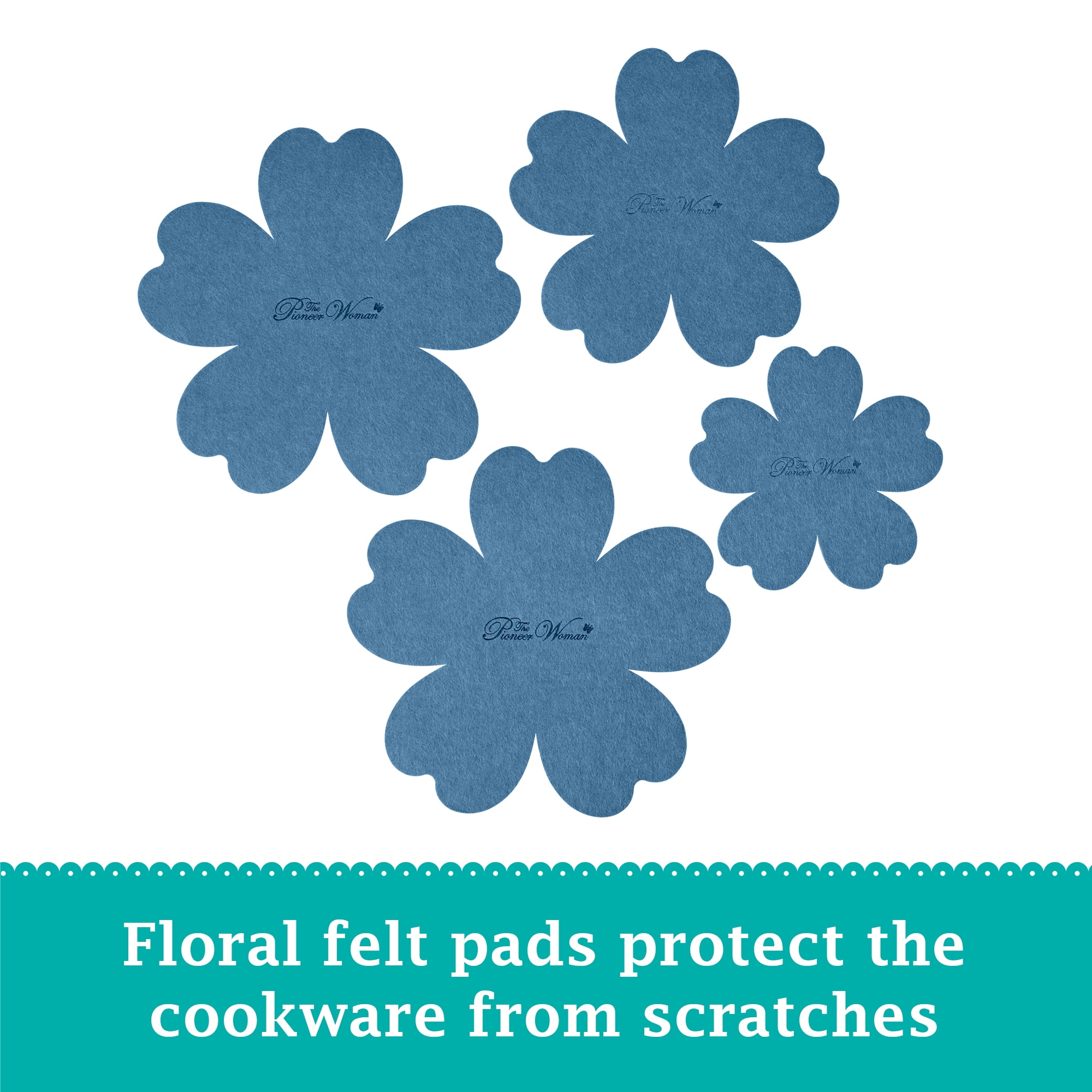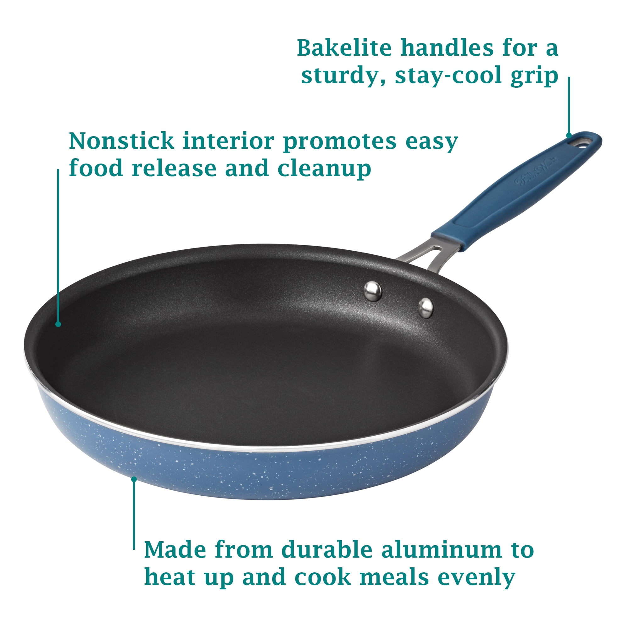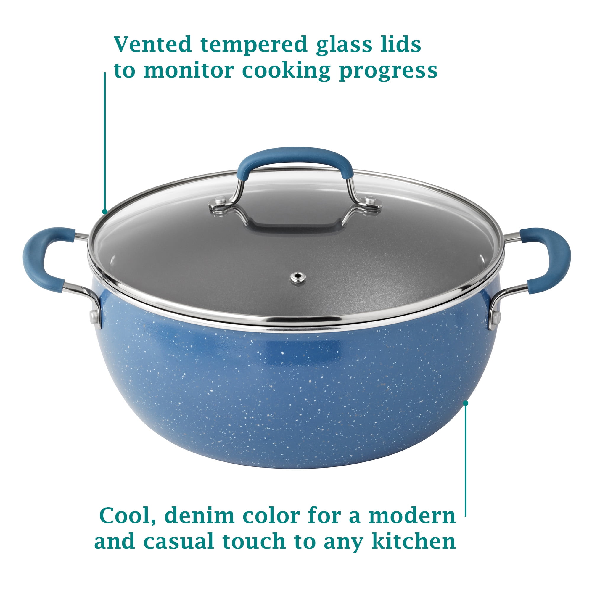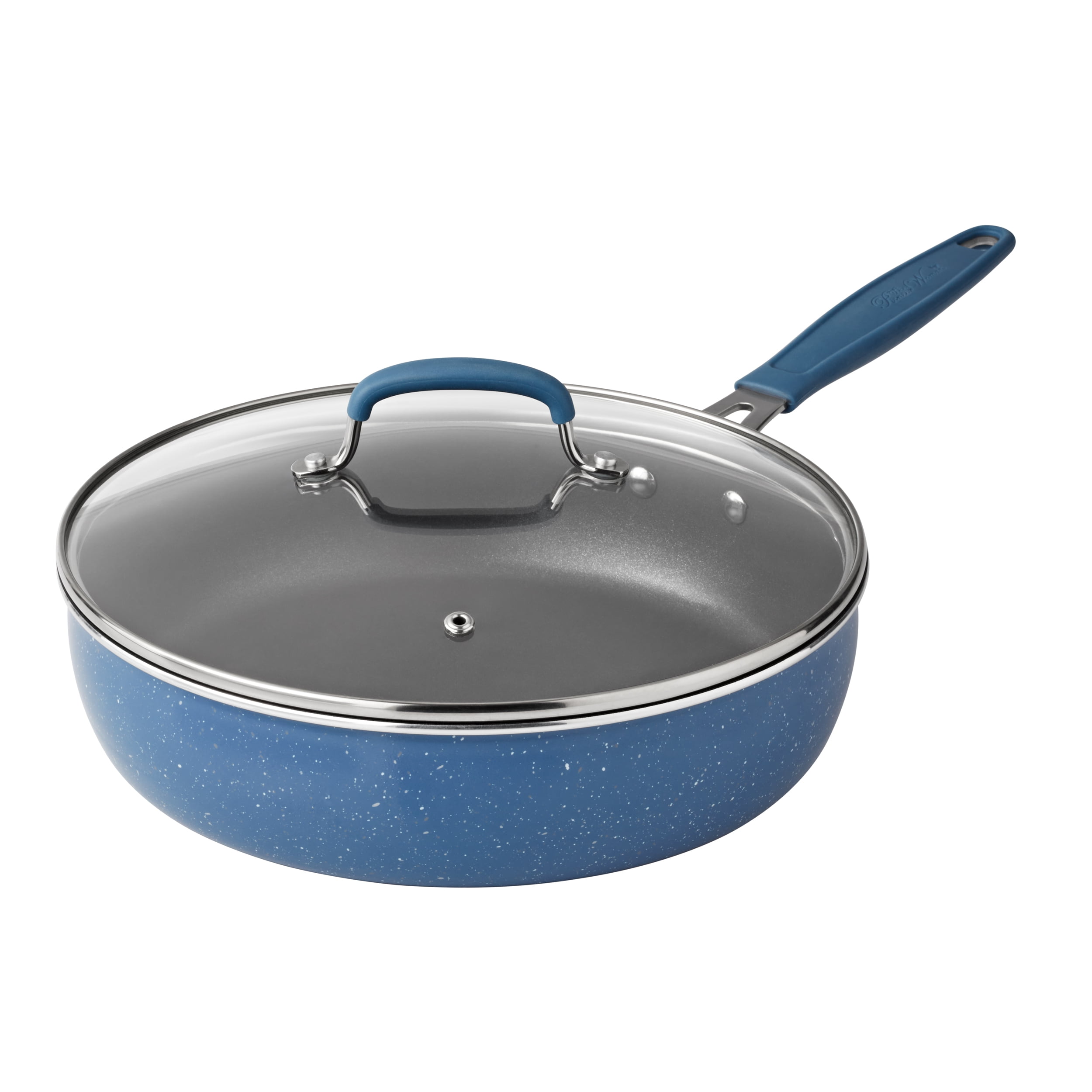 The Pioneer Woman Frontier Speckle 18 Piece Nonstick Aluminum Cookware Set, Blue Includes all essential pots and pans for everyday cooking Nonstick interiors ensure easy food release and hassle-free cleanup Glass lids allow for easy monitoring of the cooking process Set features frying pans, everyday pans, saucepans, lids, wood utensils, protectors, and a strainer Durable acacia wood utensils included for added convenience