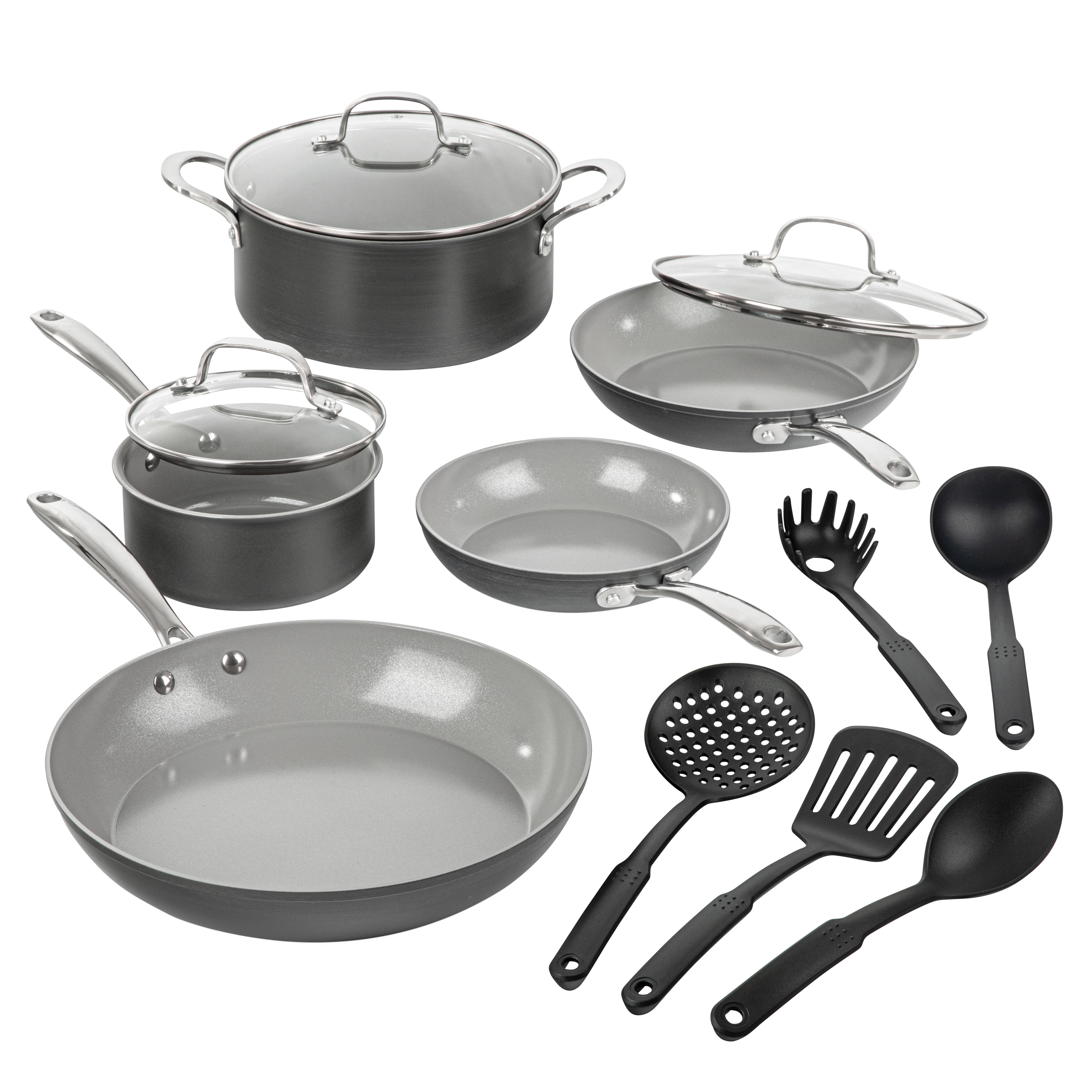 1-qt sauce pan with lid 2.5-qt sauce pan with lid 5.5-qt Dutch oven with lid 9.5″ fry pan 12″ skillet 4 ceramic measuring bowls 4 ceramic measuring spoons 8″ cast iron skillet 2 mini au gratins 2 silicone sleeves Acacia wood turner Acacia wood spoon Nylon spatula [Heavy Gauge Aluminum Body Provides Strength & Even Heat Distribution / Easy to Clean 3-Layer Reinforced Nonstick Interior Coating / Durable, Chip & Scratch Resistant Exterior Finish; Maintains Color & Does Not Fade When Heated / Stainless Steel Riveted Bracket with Non-Toxic Soft Grip Silicone Handle: Silicone Is Cold & Heat Resistant Up to 400° F / Clear, Tempered Glass Lids with Steam Vents / Acacia Wood Tools Are Safe to Use on Nonstick Cookware]