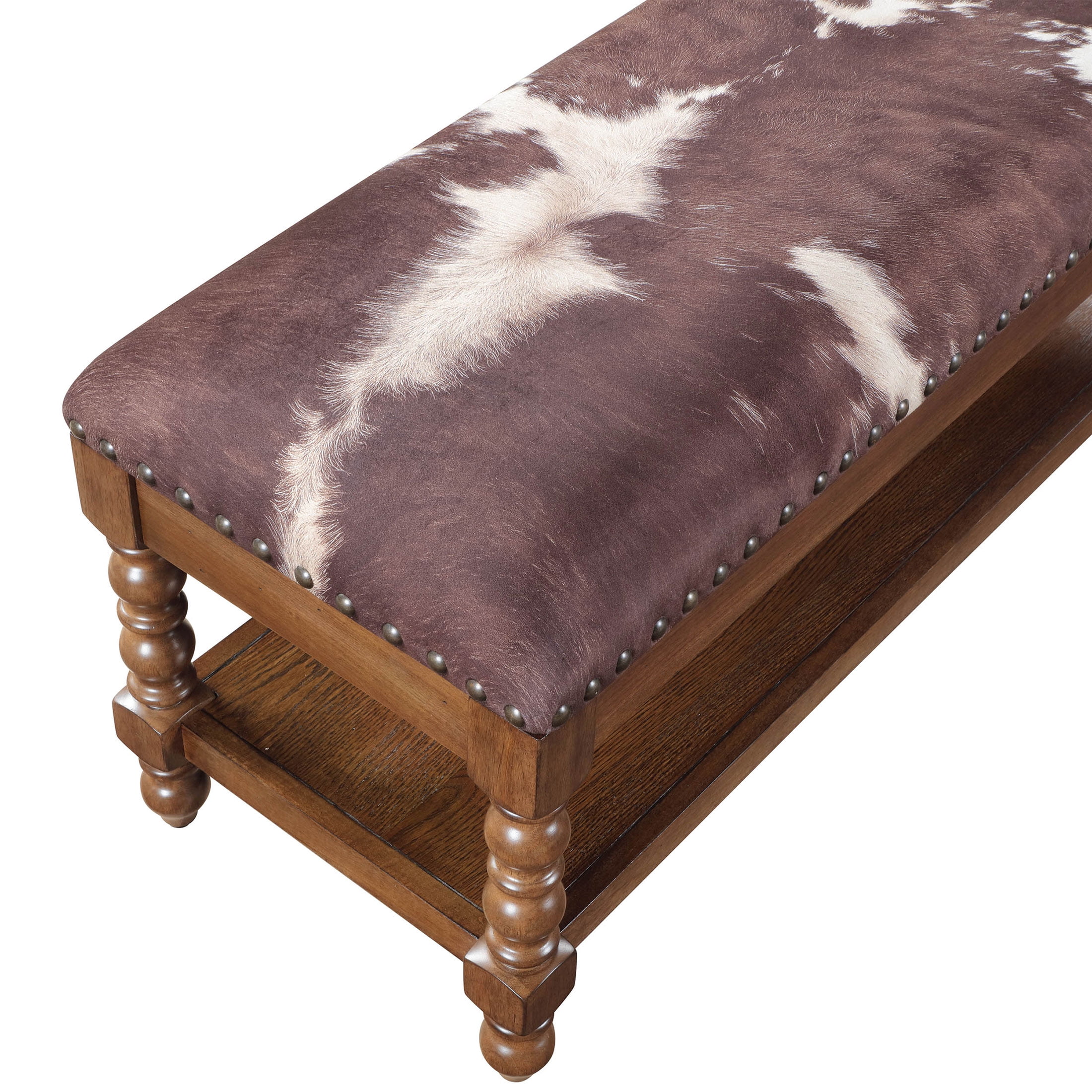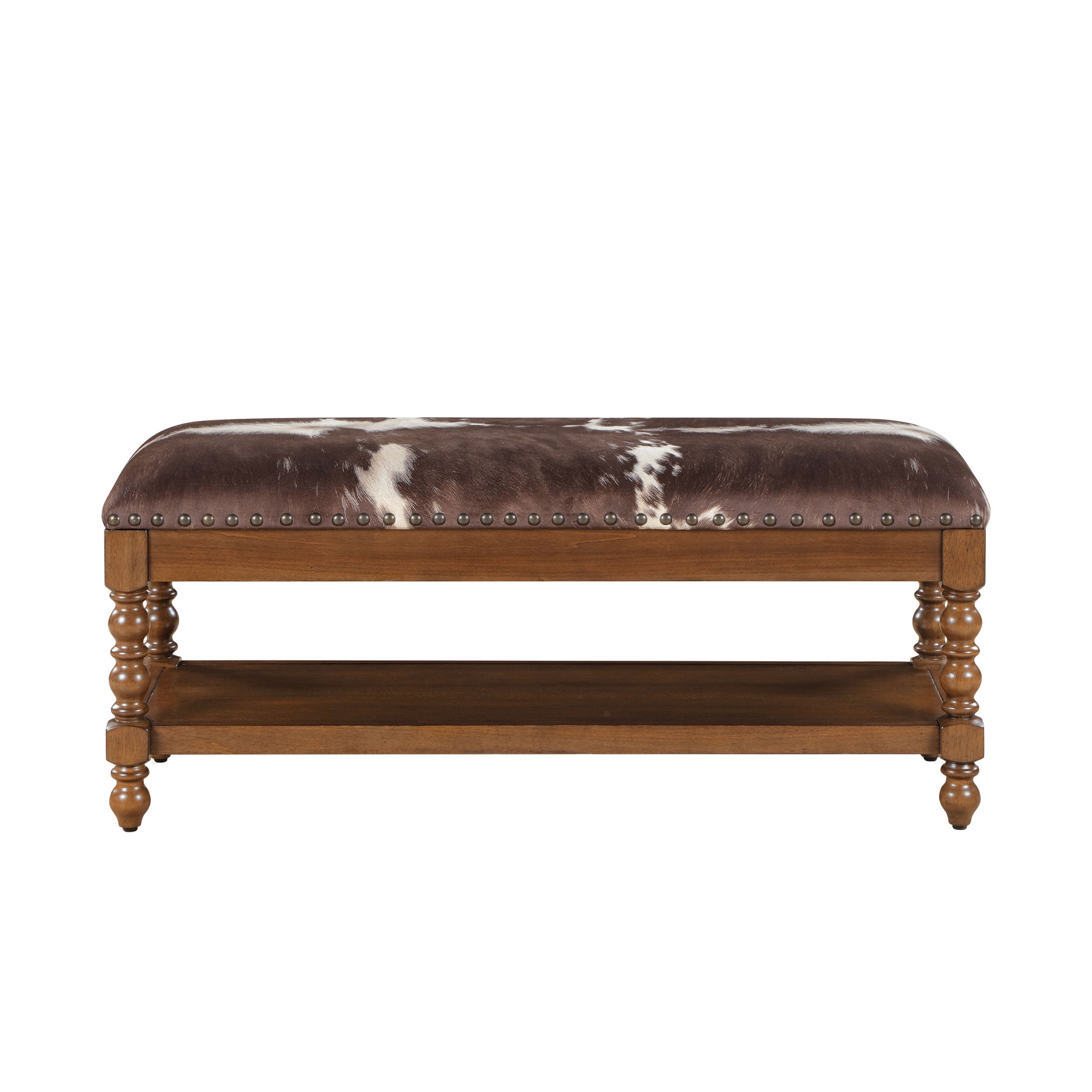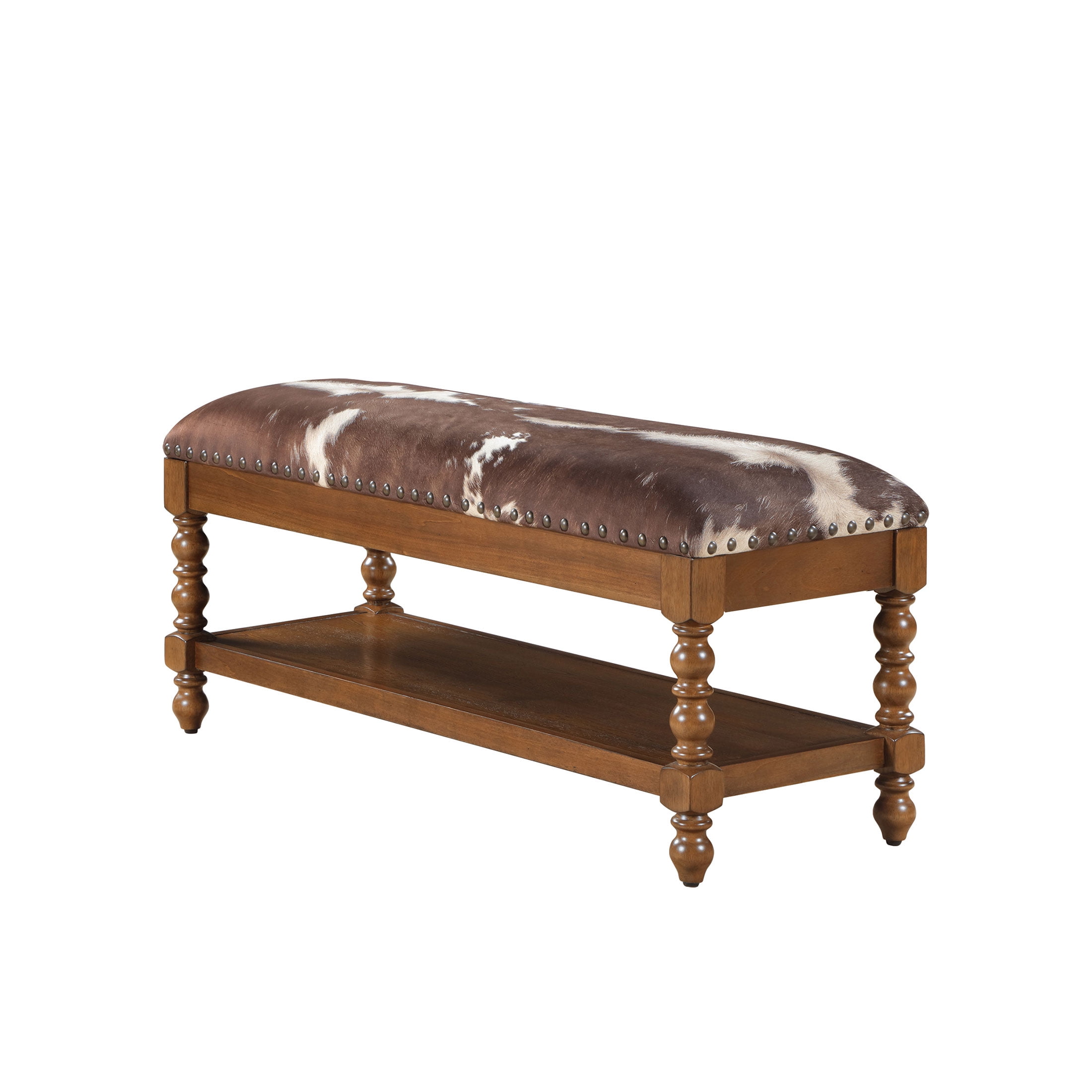 Solid Wood Construction: Durable and sturdy, ensuring long-lasting use Faux Cowhide Upholstered Seat: Adds a unique, stylish element and provides comfortable seating Spindle Style Turned Legs: Enhances the traditional farmhouse aesthetic Generously Padded Seat: Ensures a comfortable sitting experience Spacious Lower Storage Shelf: Offers practical storage space for various items Nailhead Trim: Adds a touch of vintage elegance Product Dimensions: 45.25 IN W x 16.25 IN D x 19.25 IN (114.9 CM x 41.2 CM x 48.9 CM) Product Weight: 34.39 lb Packaging Dimensions: 48.75 IN x 19 IN D x 9.75 IN H Packaging Weight: 43.4 lb (19.7 kg) Model# PW1425004710060 Spindle Style Turned Legs: Enhances the traditional farmhouse aesthetic Generously Padded Seat: Ensures a comfortable sitting experience Spacious Lower Storage Shelf: Offers practical storage space for various items Nailhead Trim: Adds a touch of vintage elegance Product Dimensions: 45.25 IN W x 16.25 IN D x 19.25 IN (114.9 CM x 41.2 CM x 48.9 CM) Product Weight: 34.39 lb Packaging Dimensions: 48.75 IN x 19 IN D x 9.75 IN H Packaging Weight: 43.4 lb (19.7 kg) Model# PW1425004710060