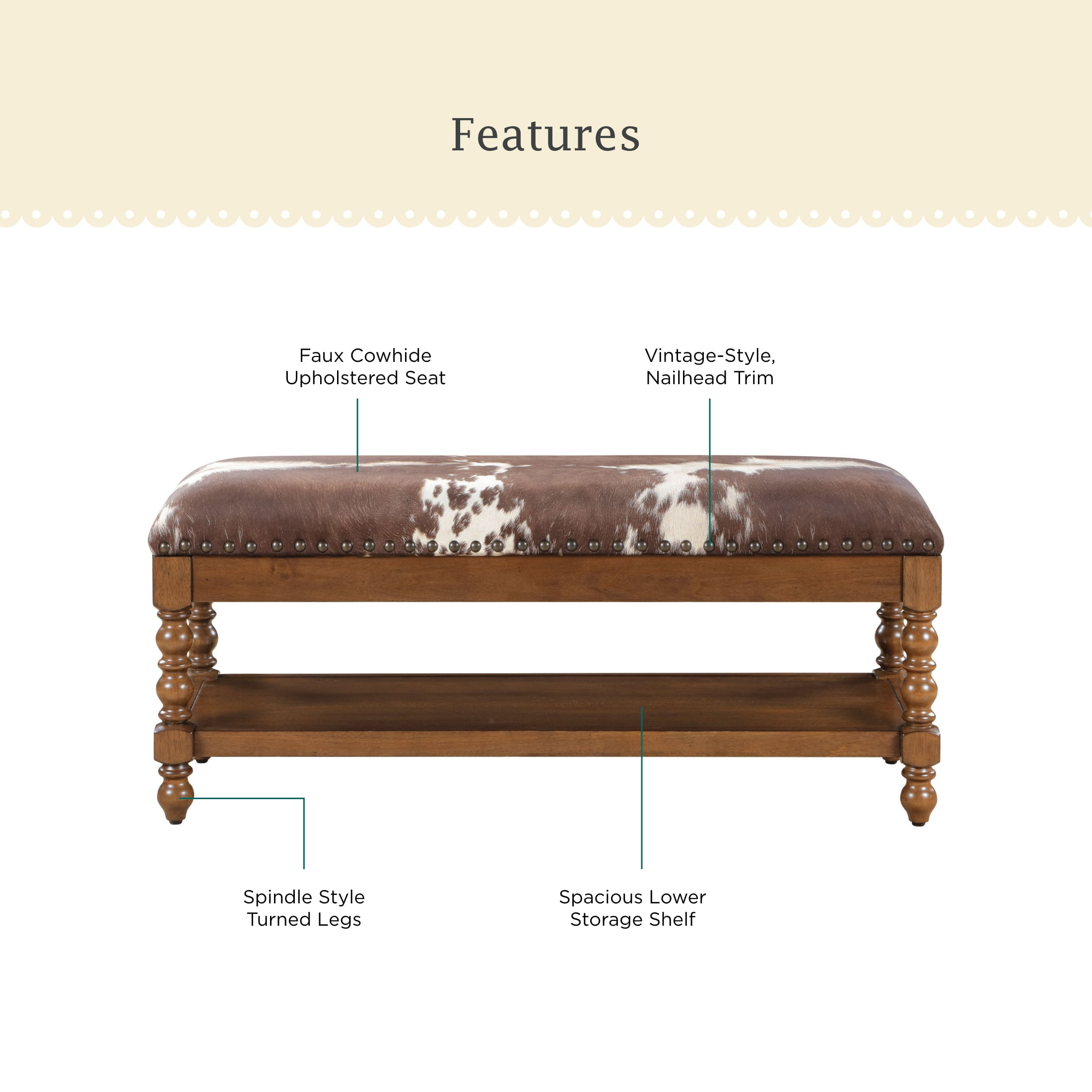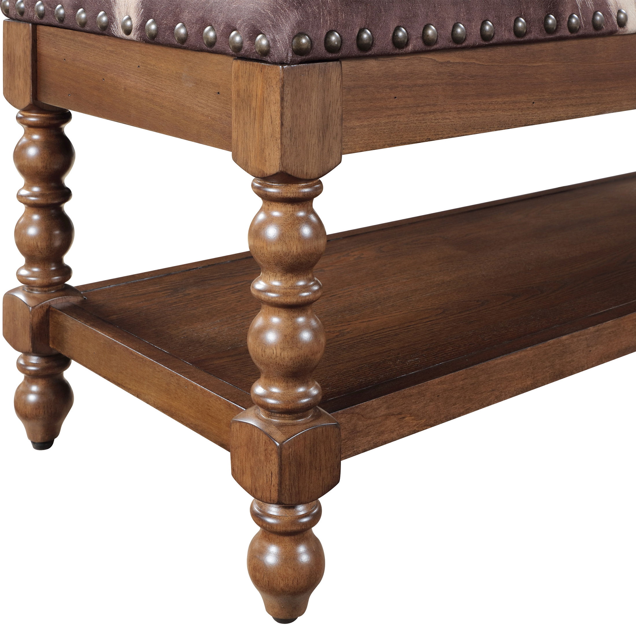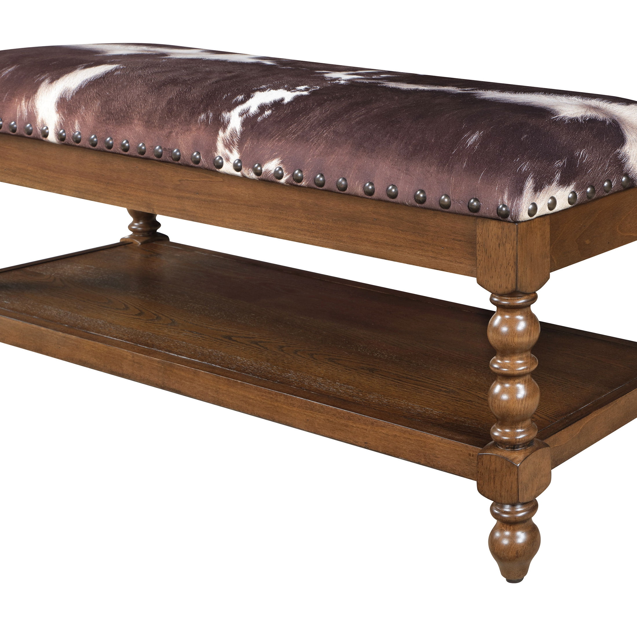 Solid Wood Construction: Durable and sturdy, ensuring long-lasting use Faux Cowhide Upholstered Seat: Adds a unique, stylish element and provides comfortable seating Spindle Style Turned Legs: Enhances the traditional farmhouse aesthetic Generously Padded Seat: Ensures a comfortable sitting experience Spacious Lower Storage Shelf: Offers practical storage space for various items Nailhead Trim: Adds a touch of vintage elegance Product Dimensions: 45.25 IN W x 16.25 IN D x 19.25 IN (114.9 CM x 41.2 CM x 48.9 CM) Product Weight: 34.39 lb Packaging Dimensions: 48.75 IN x 19 IN D x 9.75 IN H Packaging Weight: 43.4 lb (19.7 kg) Model# PW1425004710060 Spindle Style Turned Legs: Enhances the traditional farmhouse aesthetic Generously Padded Seat: Ensures a comfortable sitting experience Spacious Lower Storage Shelf: Offers practical storage space for various items Nailhead Trim: Adds a touch of vintage elegance Product Dimensions: 45.25 IN W x 16.25 IN D x 19.25 IN (114.9 CM x 41.2 CM x 48.9 CM) Product Weight: 34.39 lb Packaging Dimensions: 48.75 IN x 19 IN D x 9.75 IN H Packaging Weight: 43.4 lb (19.7 kg) Model# PW1425004710060