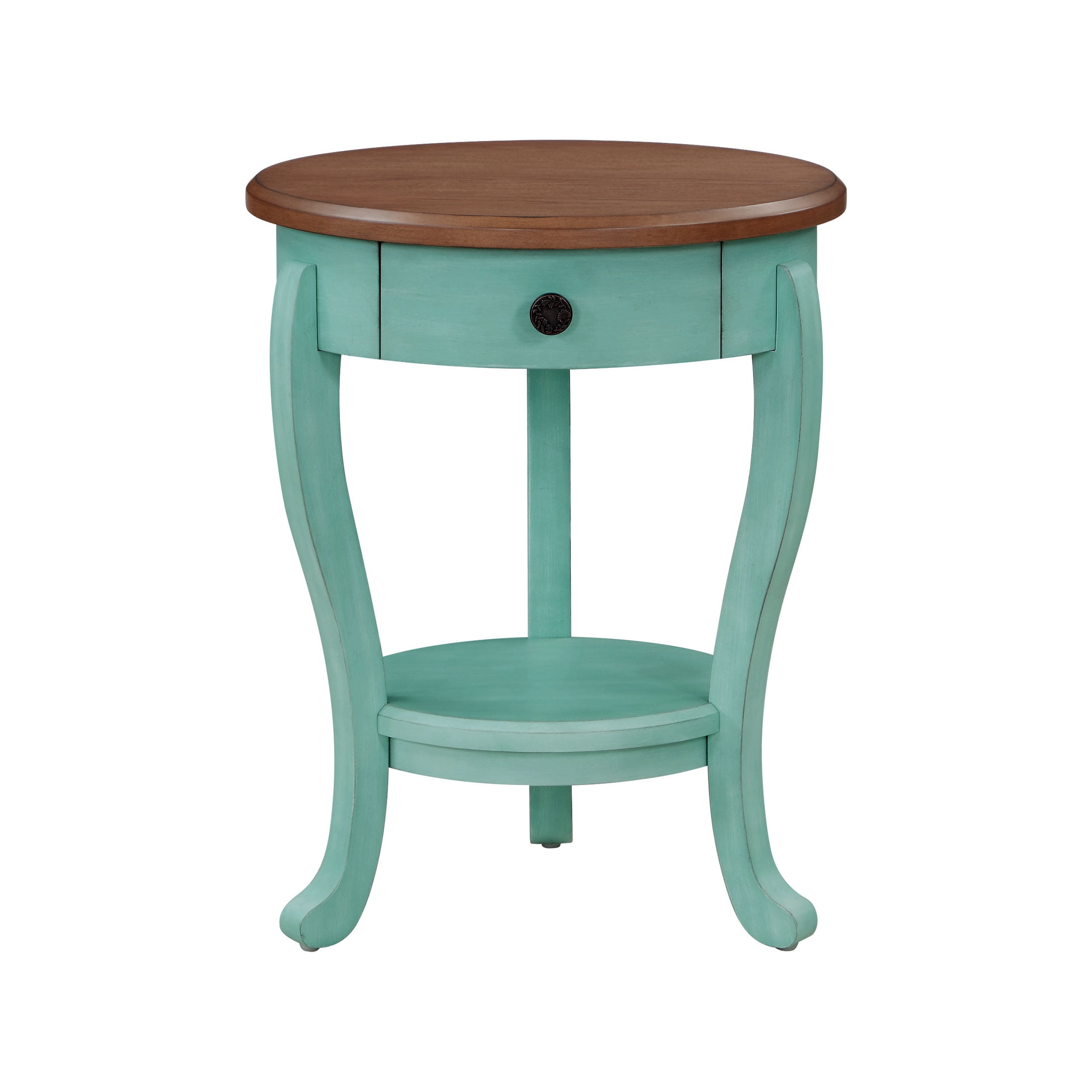 The Pioneer Woman End Table is a charming addition to your home furnishings Teal table features a dark wood surface Small bottom shelf that you can use for storage or display With a top drawer where you could keep assorted items neatly stowed away Ideal for living rooms, bedrooms, and more Coffee table measures 20″ L x 20″ W x 25.5″ H Materials: rubber wood, MDF, oak veneer Assembled weight: 25.35 lb Mix and match with other furniture from The Pioneer Woman Collection