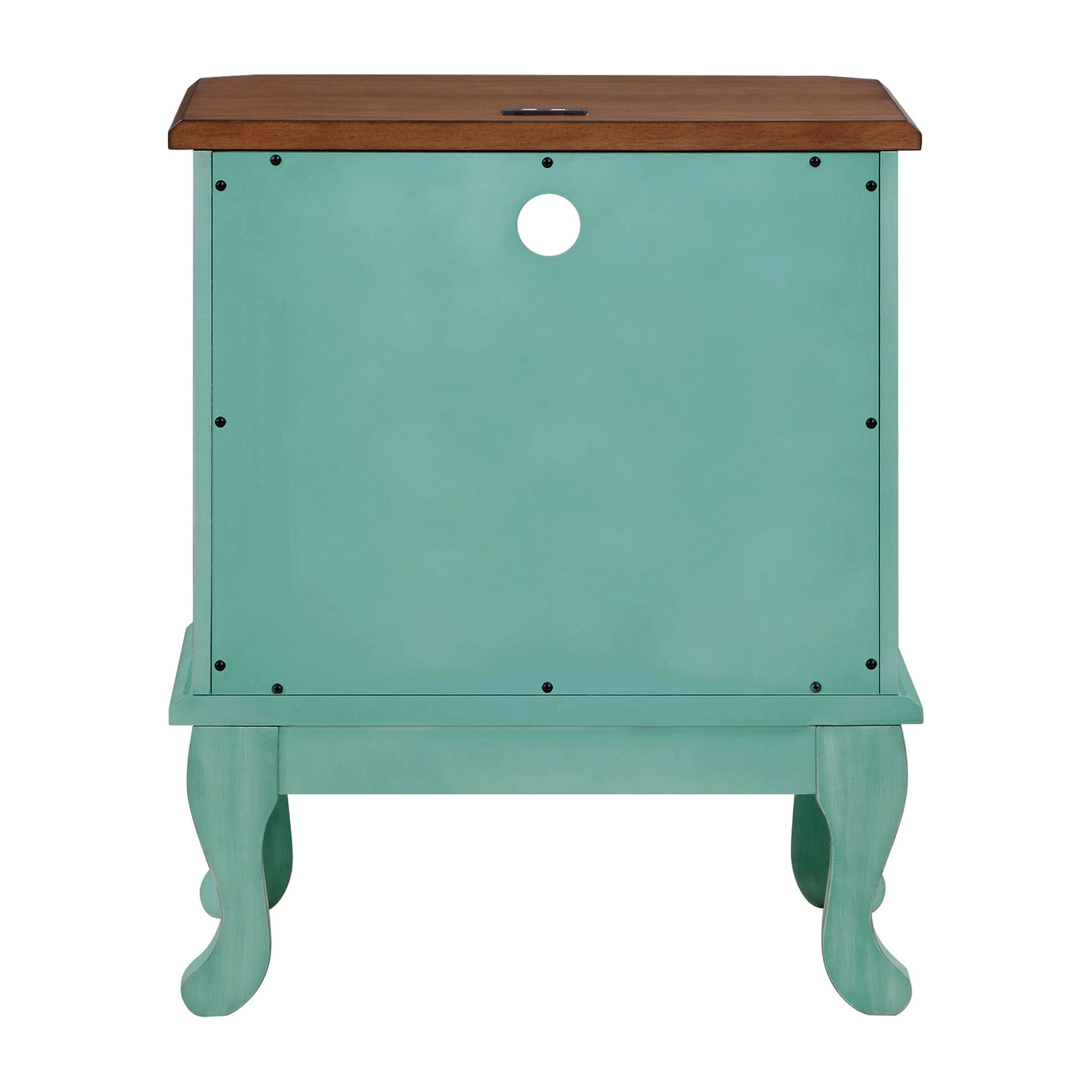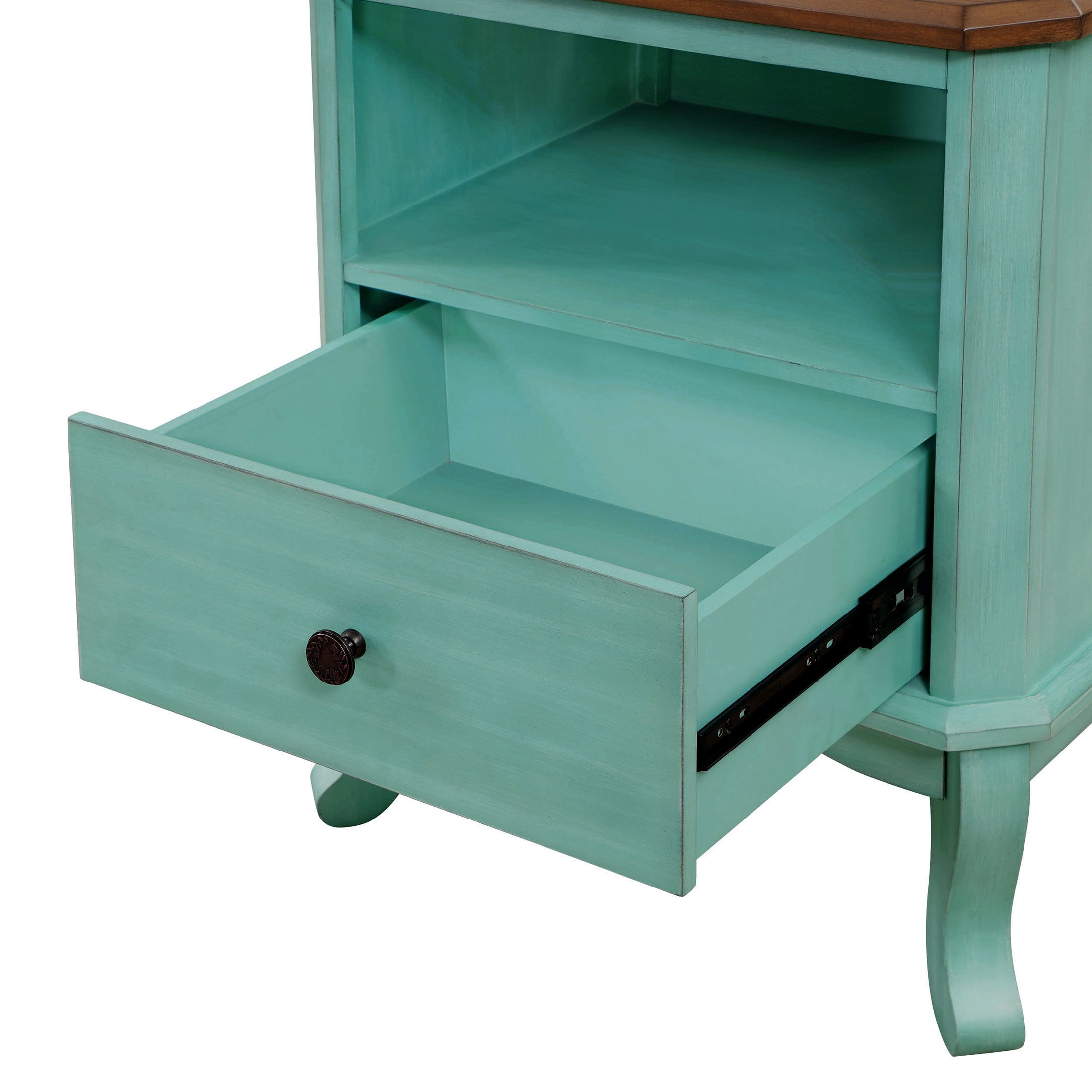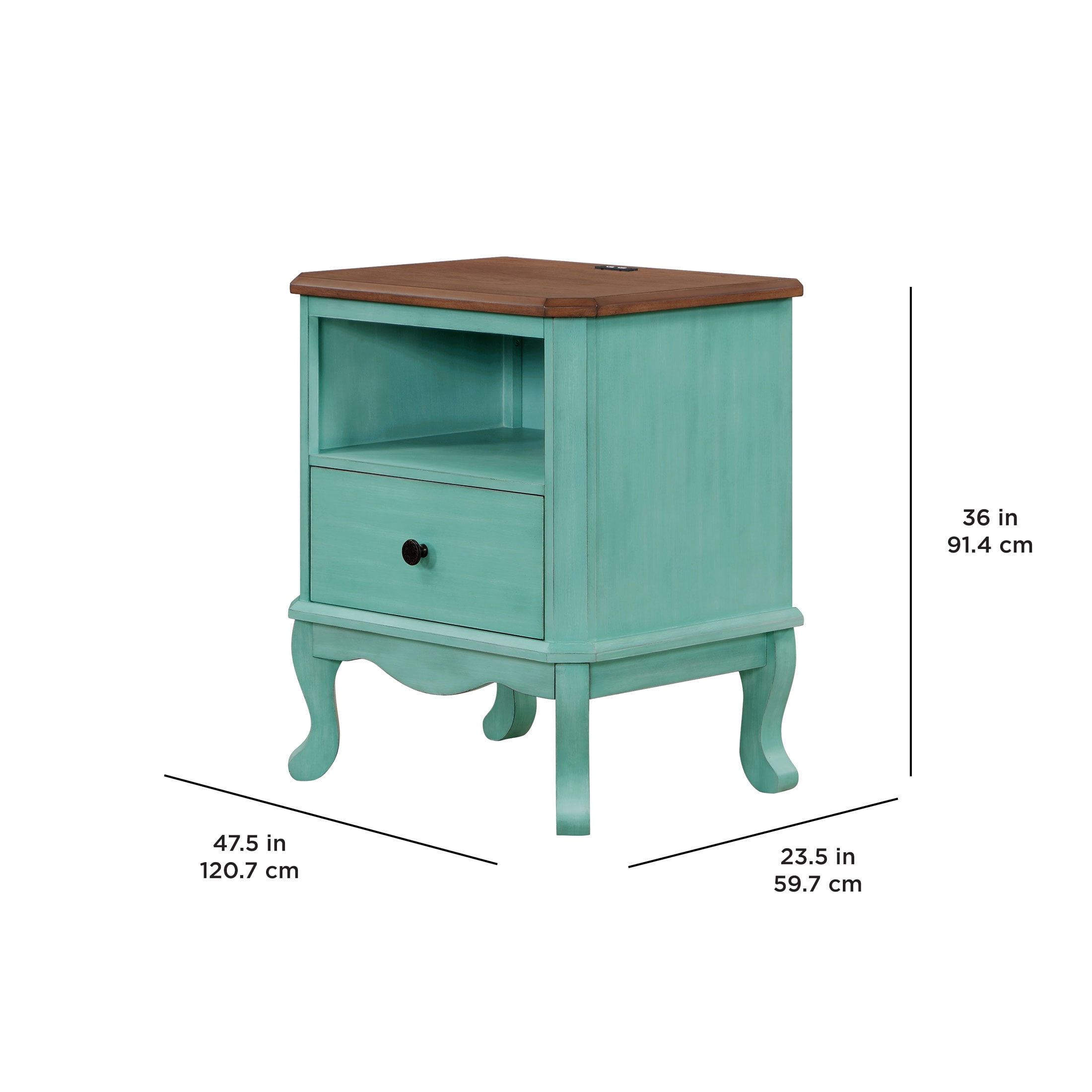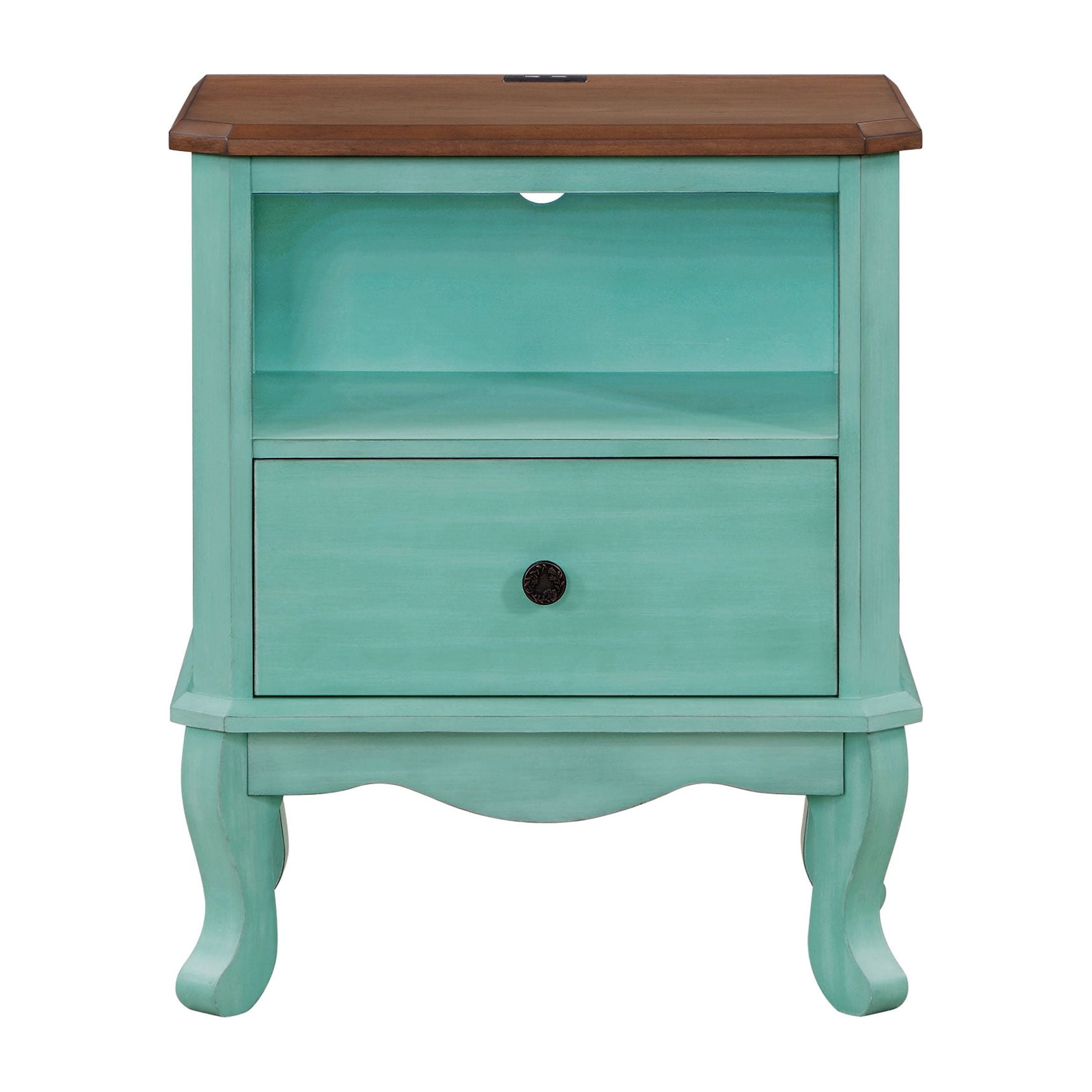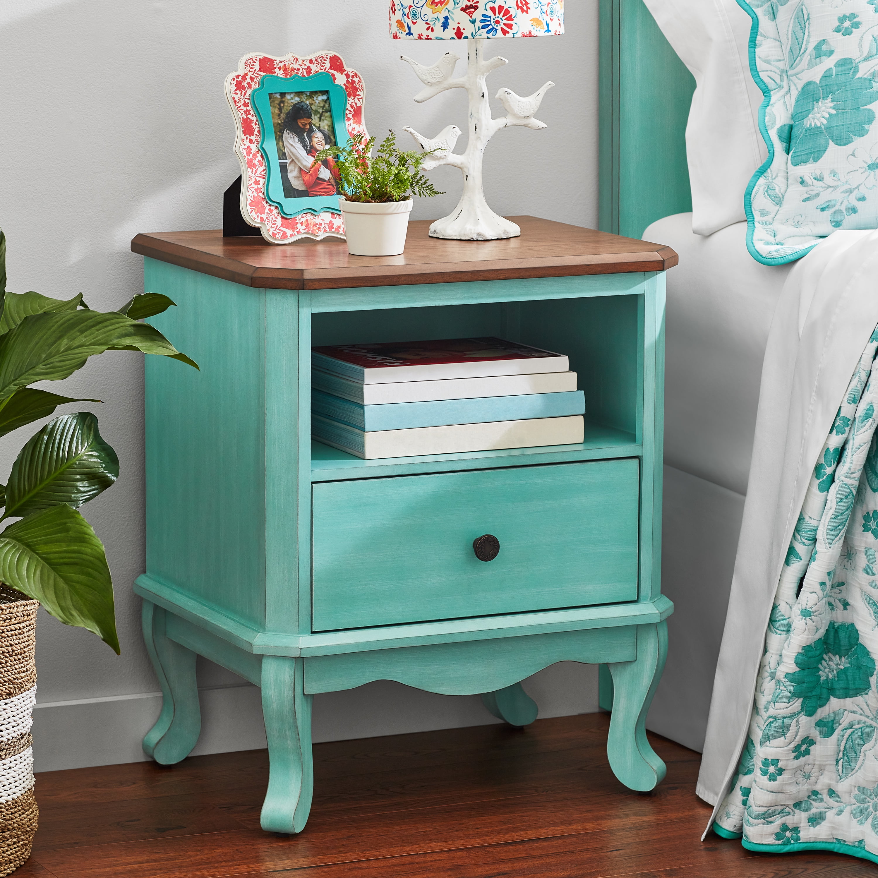 The Pioneer Woman Nightstand with Drawer, Teal Open compartment for display and storage 1 storage drawer with full-extension Perfect for storing glasses, books, phone chargers, and more Metal drawer pulls with red bronze finish and floral pattern Sturdy rubberwood and oak veneer construction Ball-bearing glides