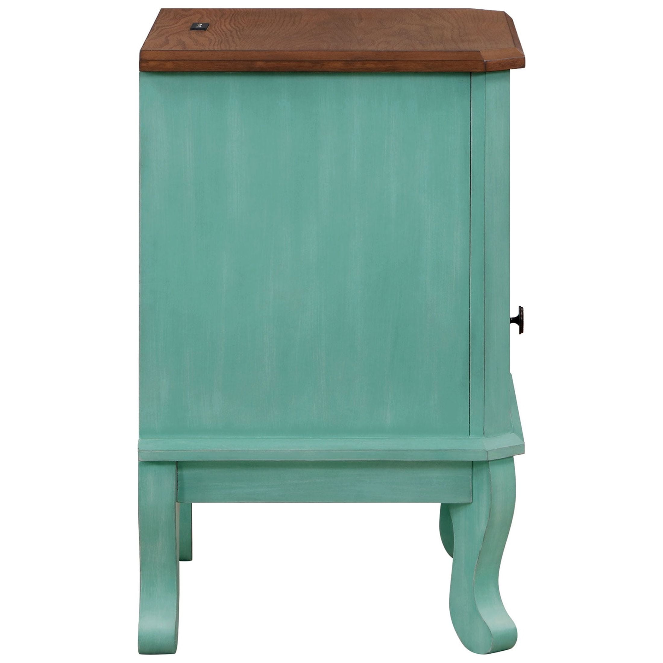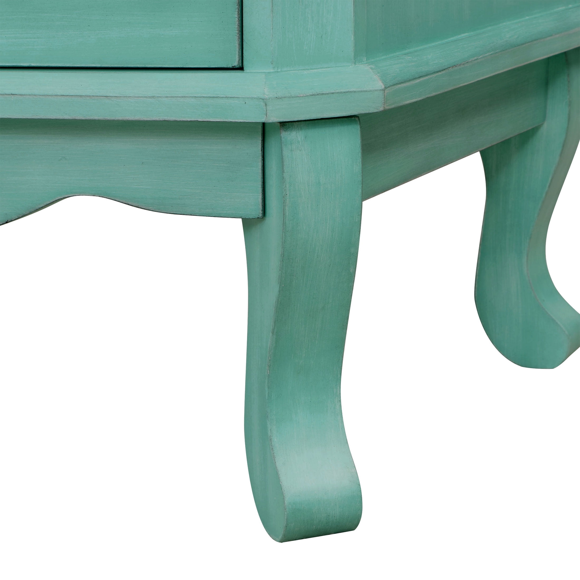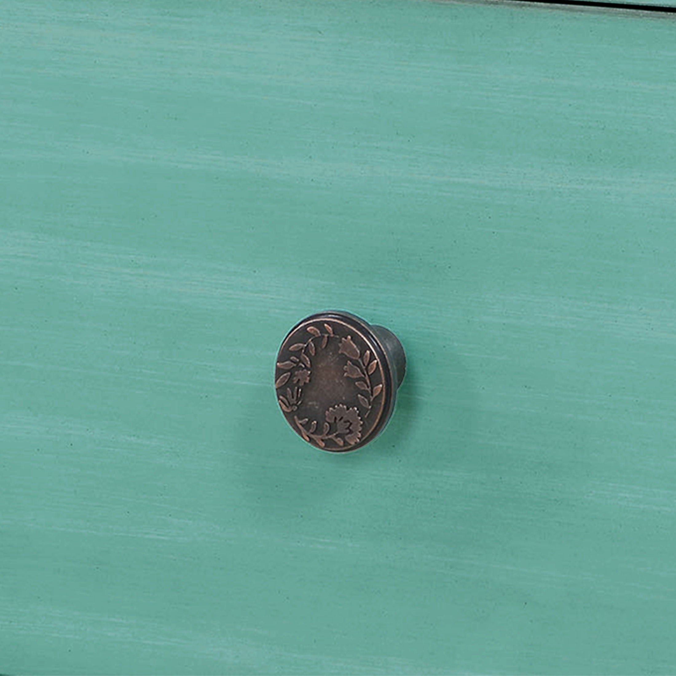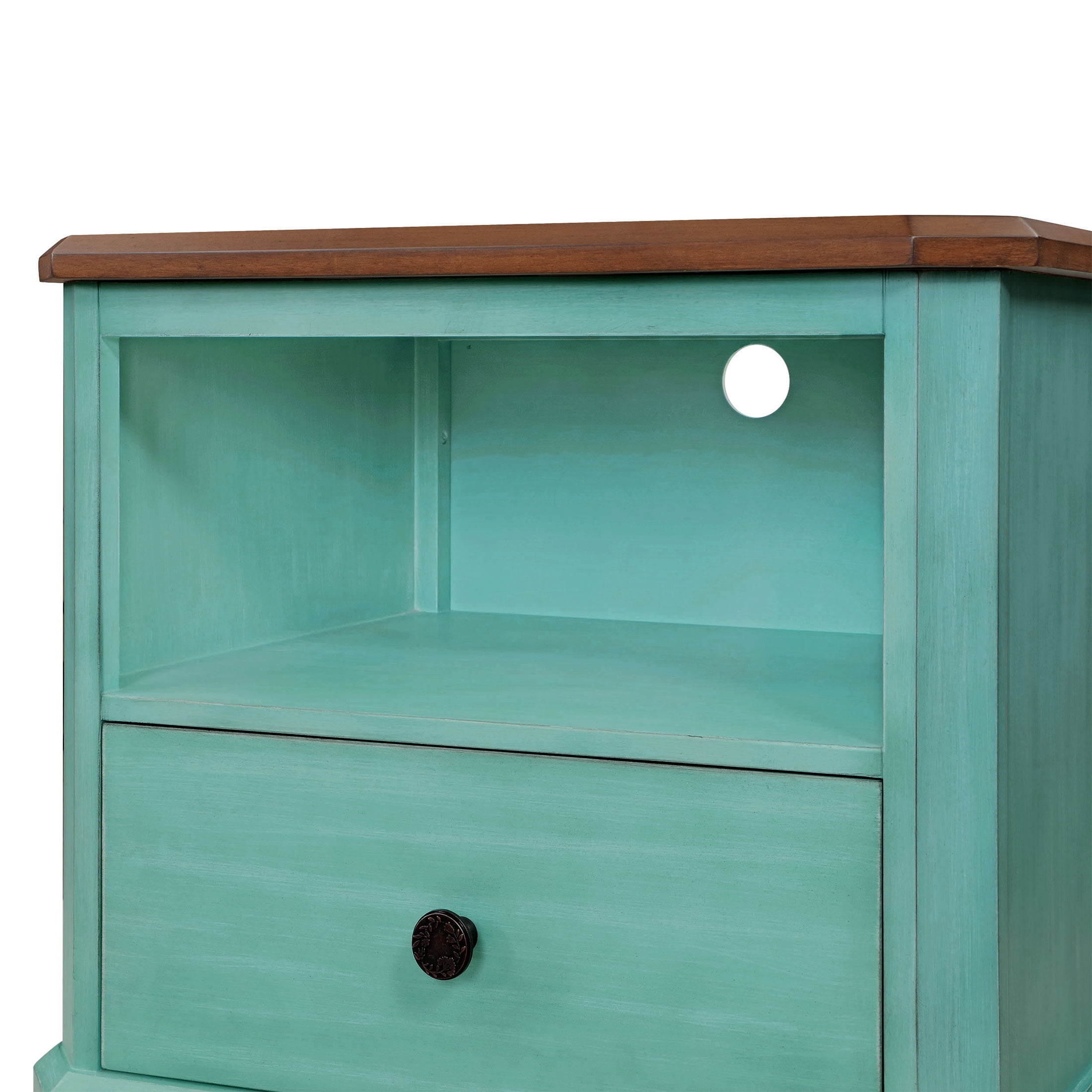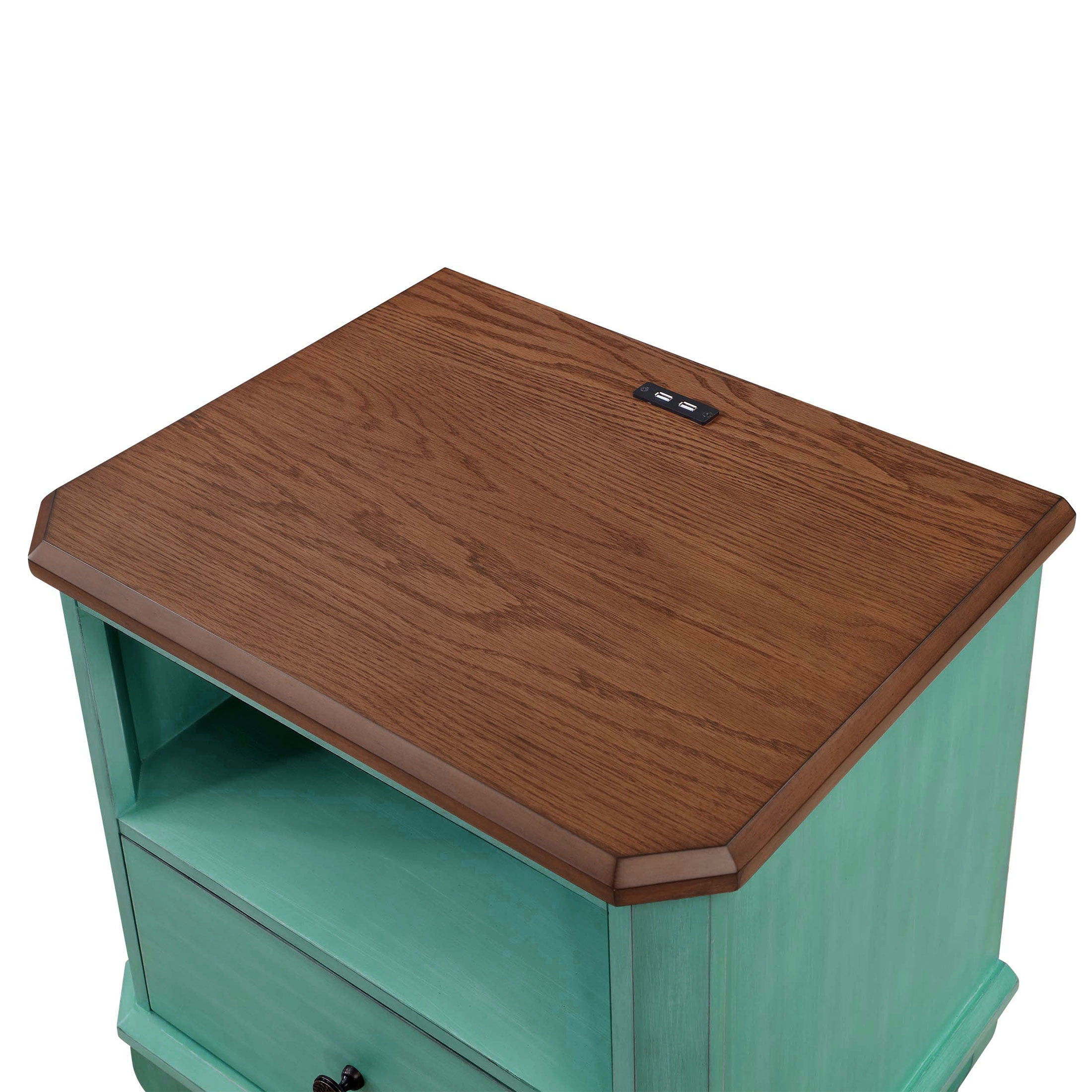 The Pioneer Woman Nightstand with Drawer, Teal Open compartment for display and storage 1 storage drawer with full-extension Perfect for storing glasses, books, phone chargers, and more Metal drawer pulls with red bronze finish and floral pattern Sturdy rubberwood and oak veneer construction Ball-bearing glides