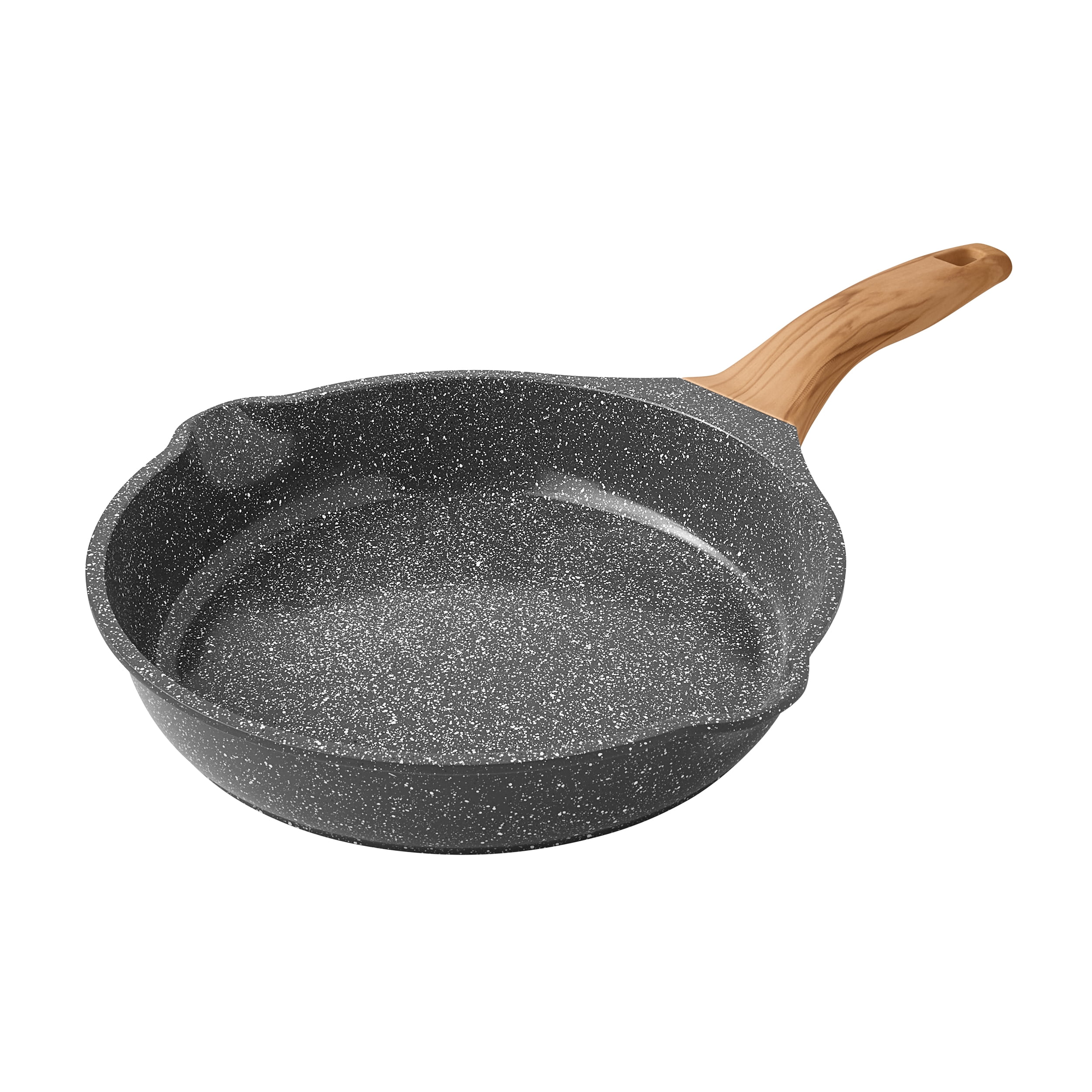 Lightweight cast aluminum skillet pan with non-stick coating Decorated with a vintage-inspired speckle Finished with gorgeous olivewood printed accents Designed for rugged use Rapid and even heat distribution for quick heating and cooling Durable cast aluminum construction with olivewood handles Oven safe to 350 degrees Fahrenheit Dishwasher safe