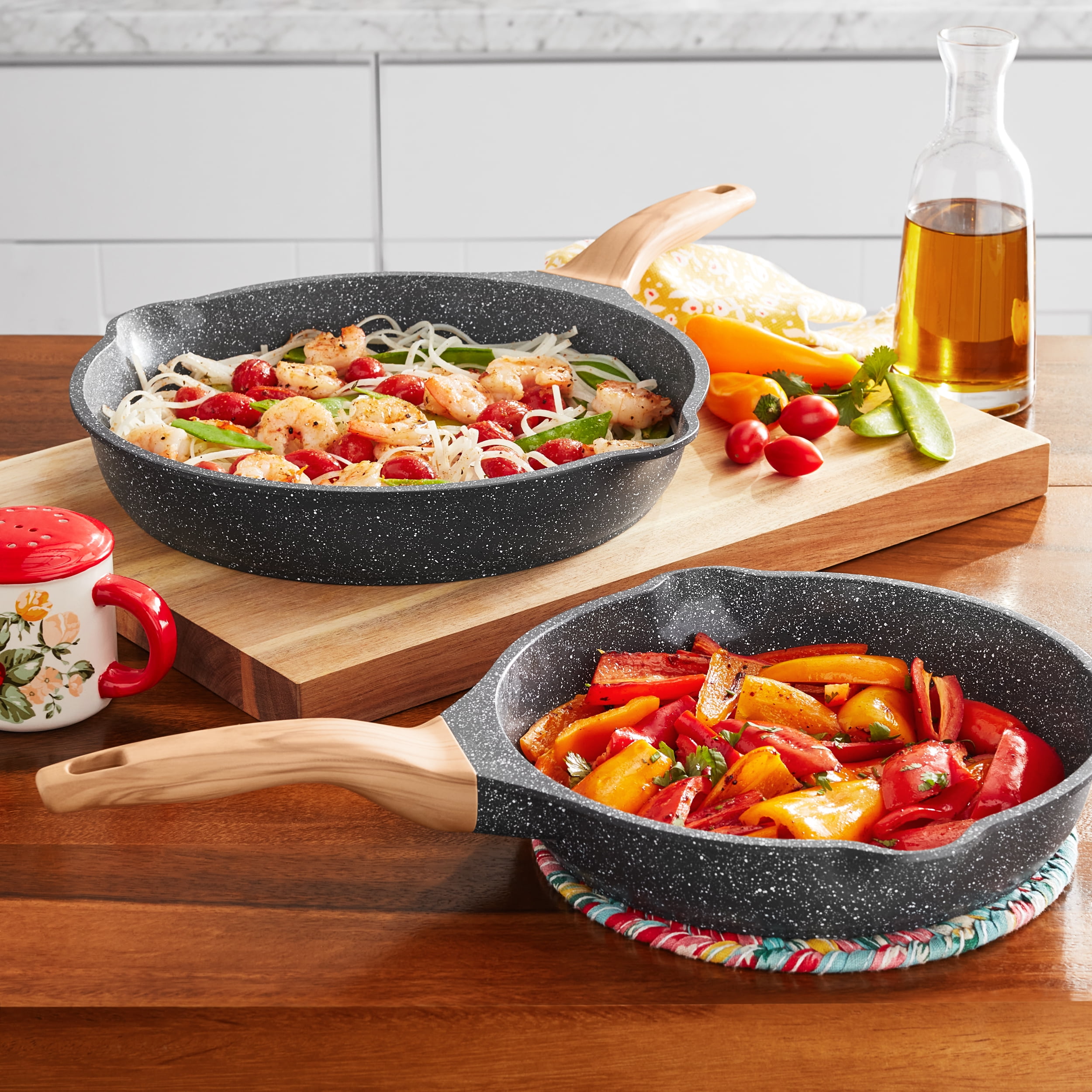 The Pioneer Woman Prairie Signature 2-Piece Cast Aluminum 10″ & 12″ Fry Pan Set, Charcoal Speckle