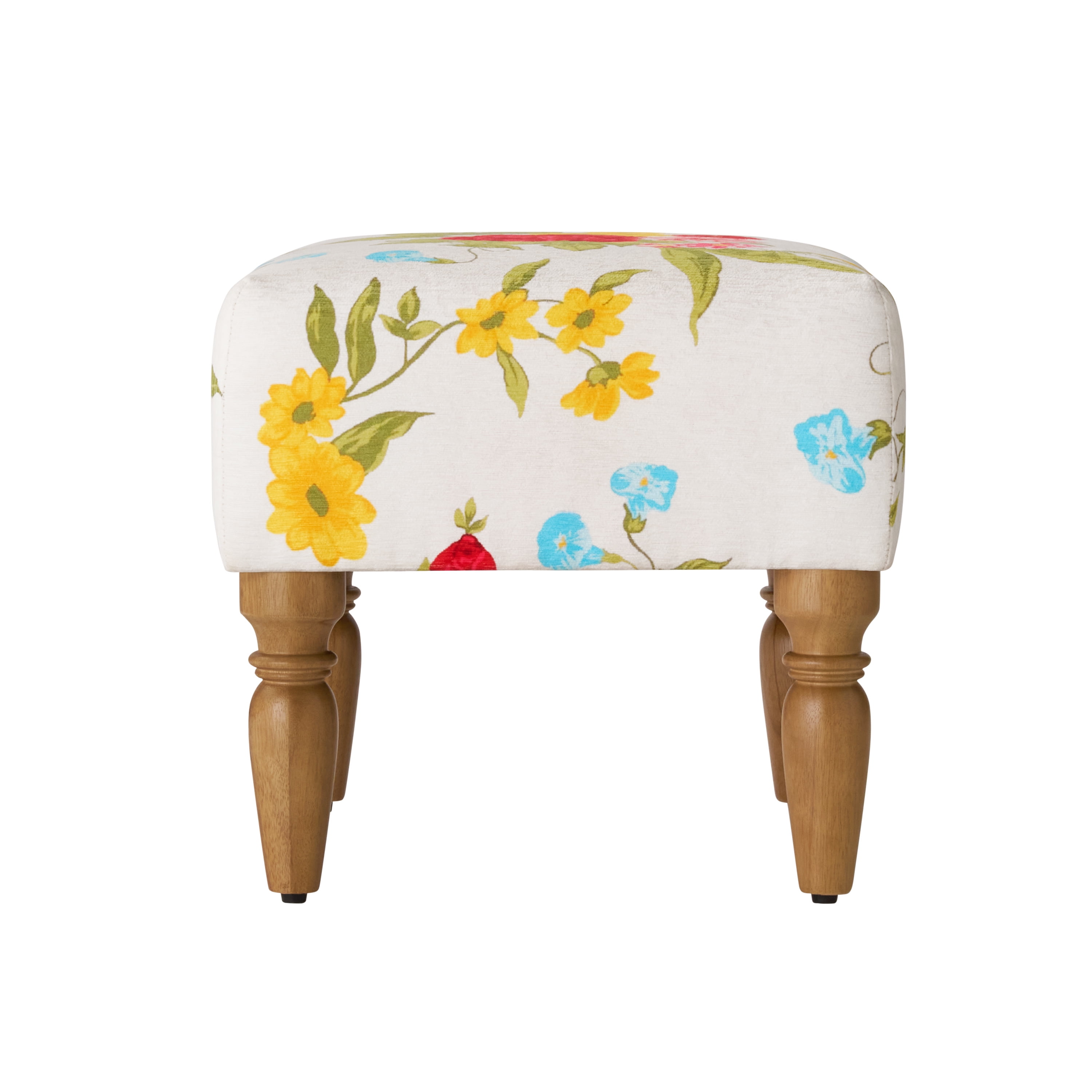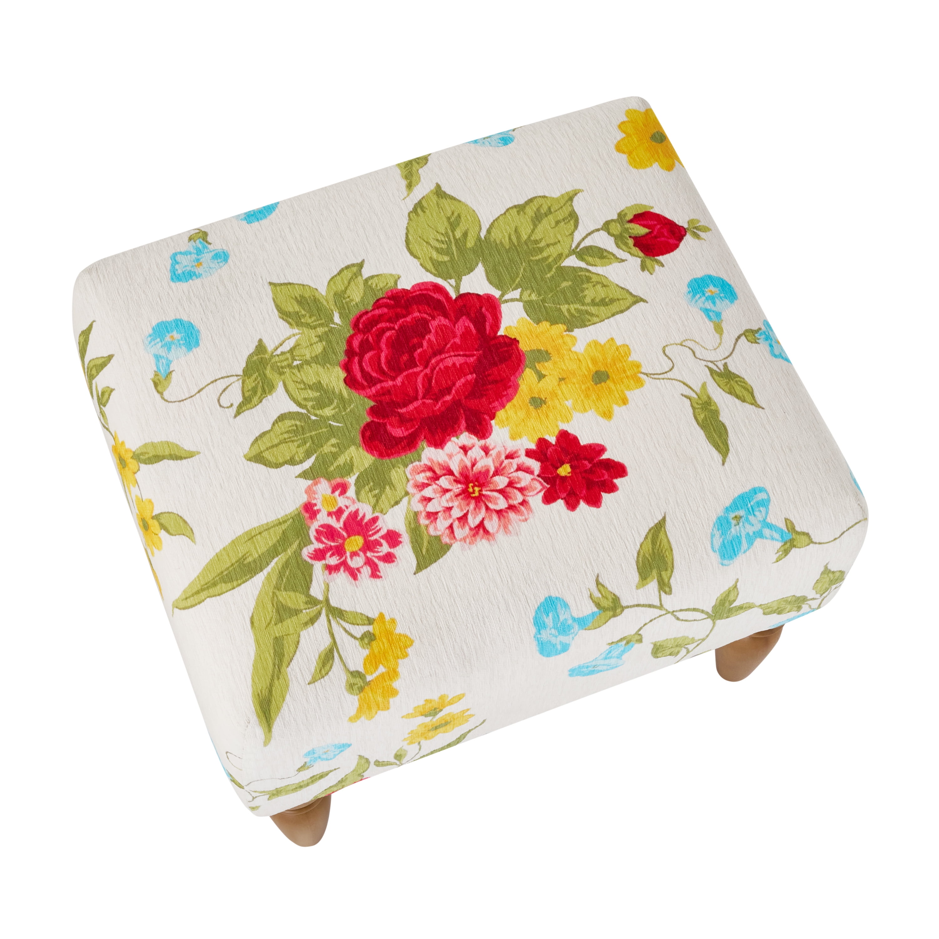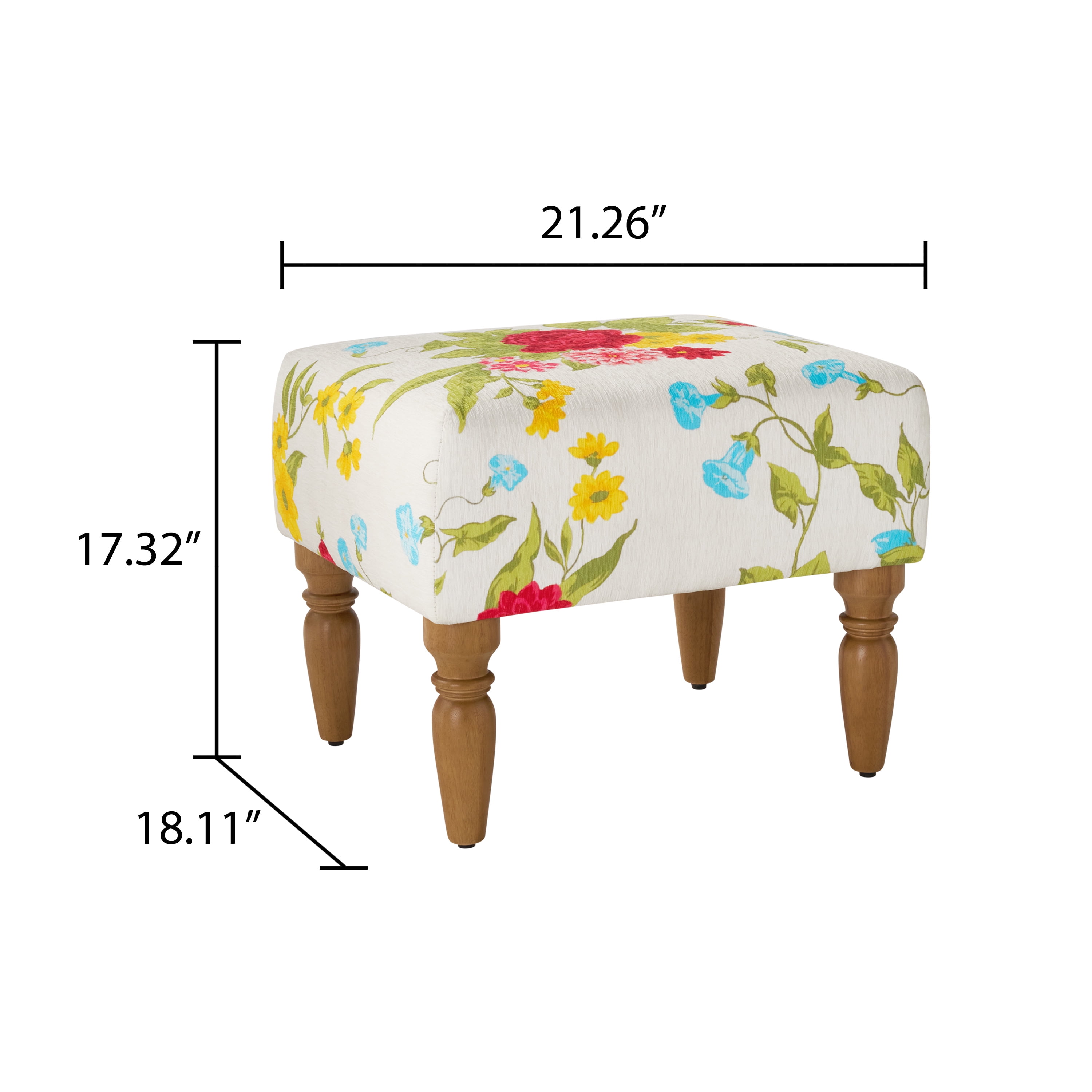 The Pioneer Woman Sweet Rose Ottoman, White, 17.25 in Beautiful white floral print upholstery with matching stitching Heirloom Brown legs High density foam cushion top