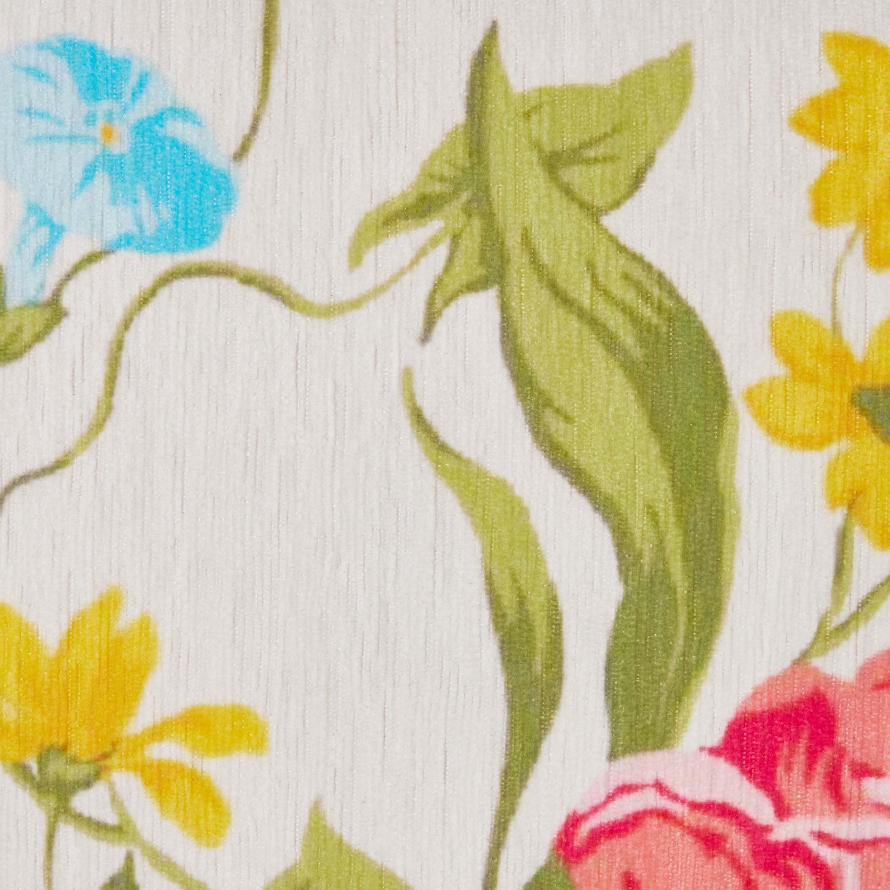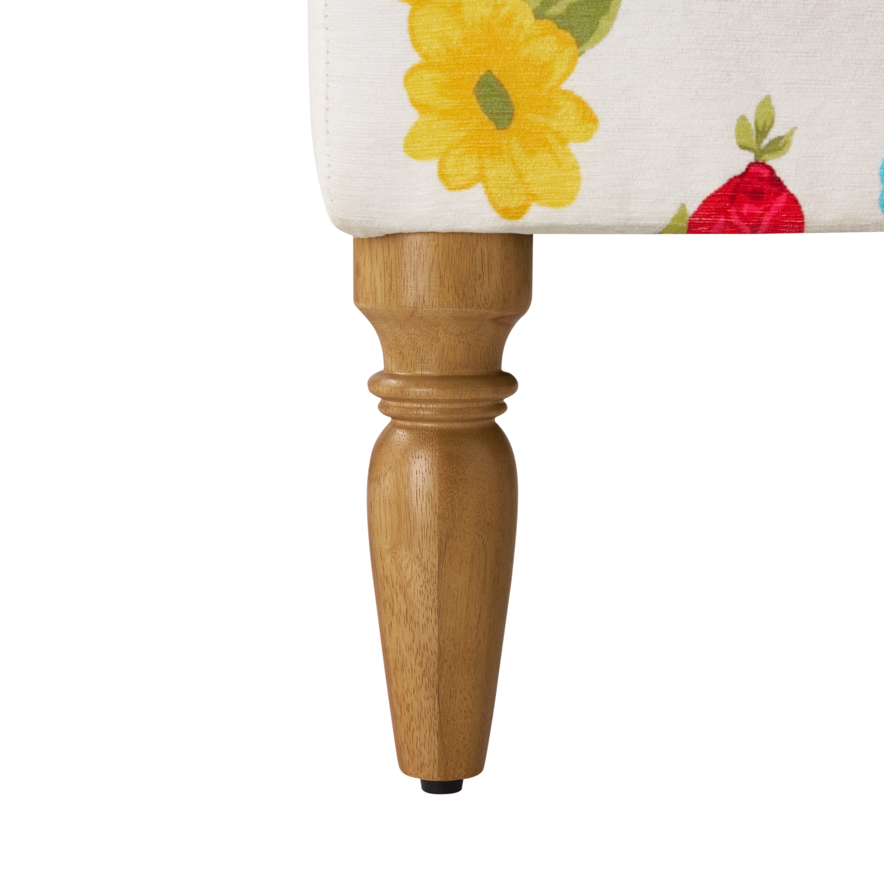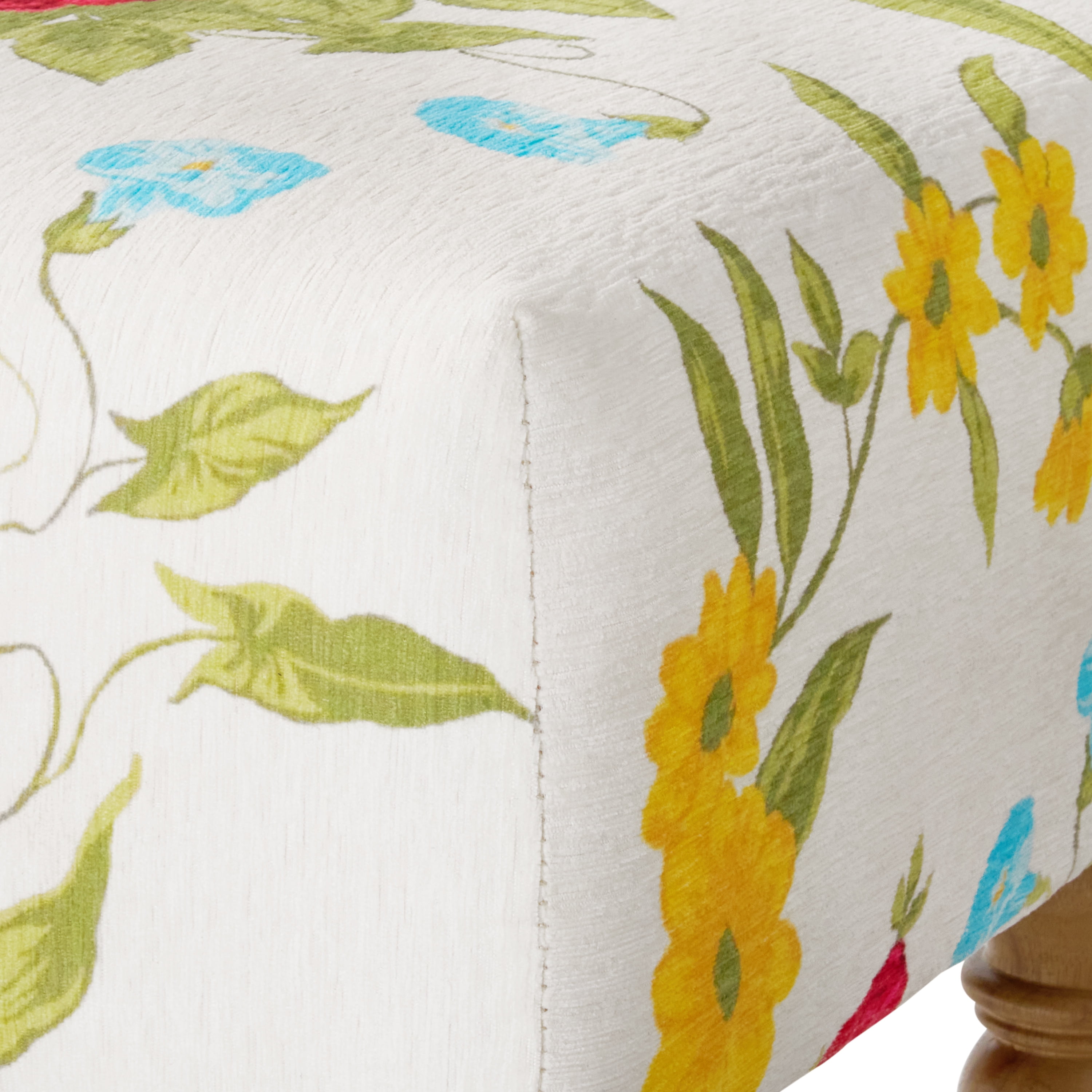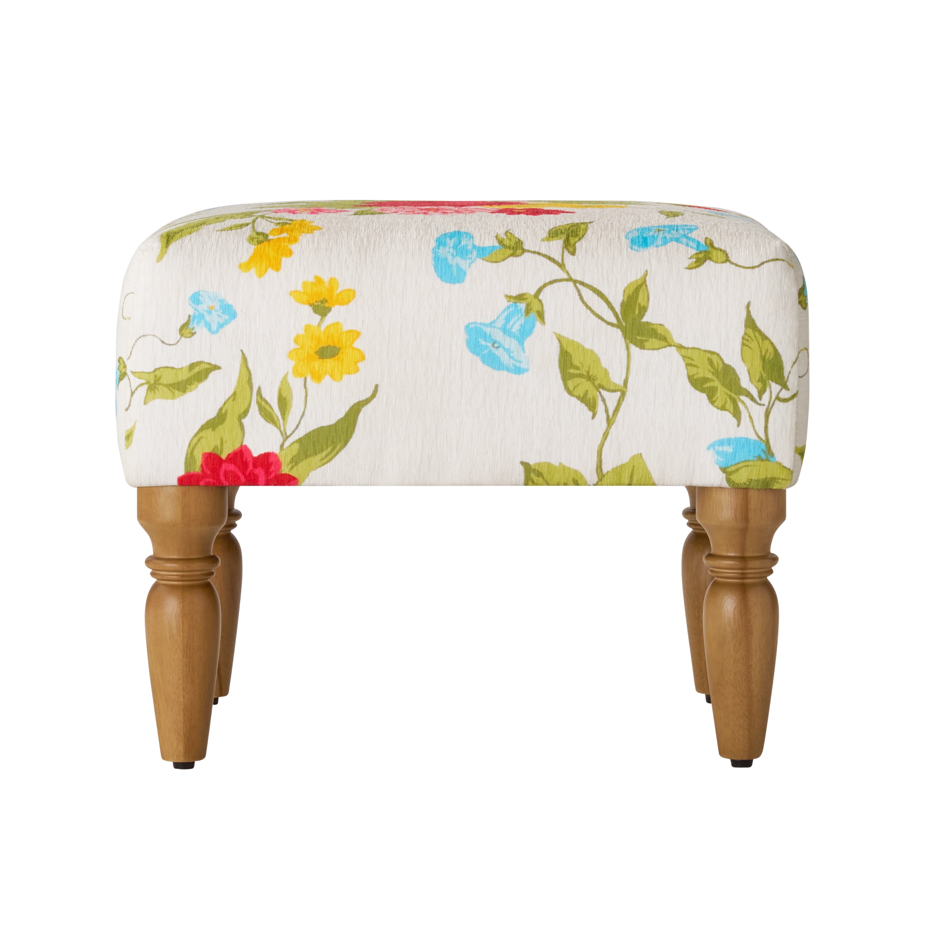 The Pioneer Woman Sweet Rose Ottoman, White, 17.25 in Beautiful white floral print upholstery with matching stitching Heirloom Brown legs High density foam cushion top
