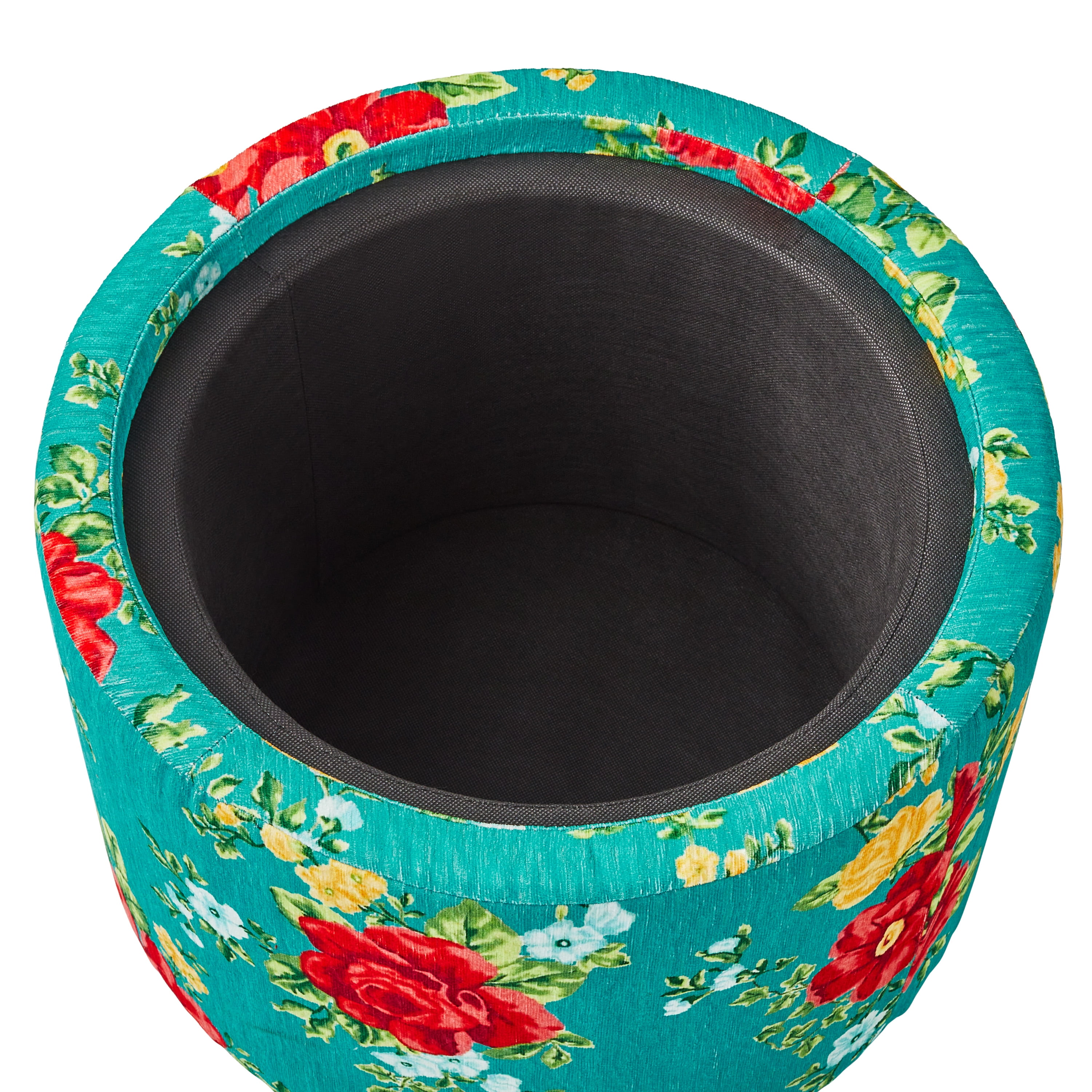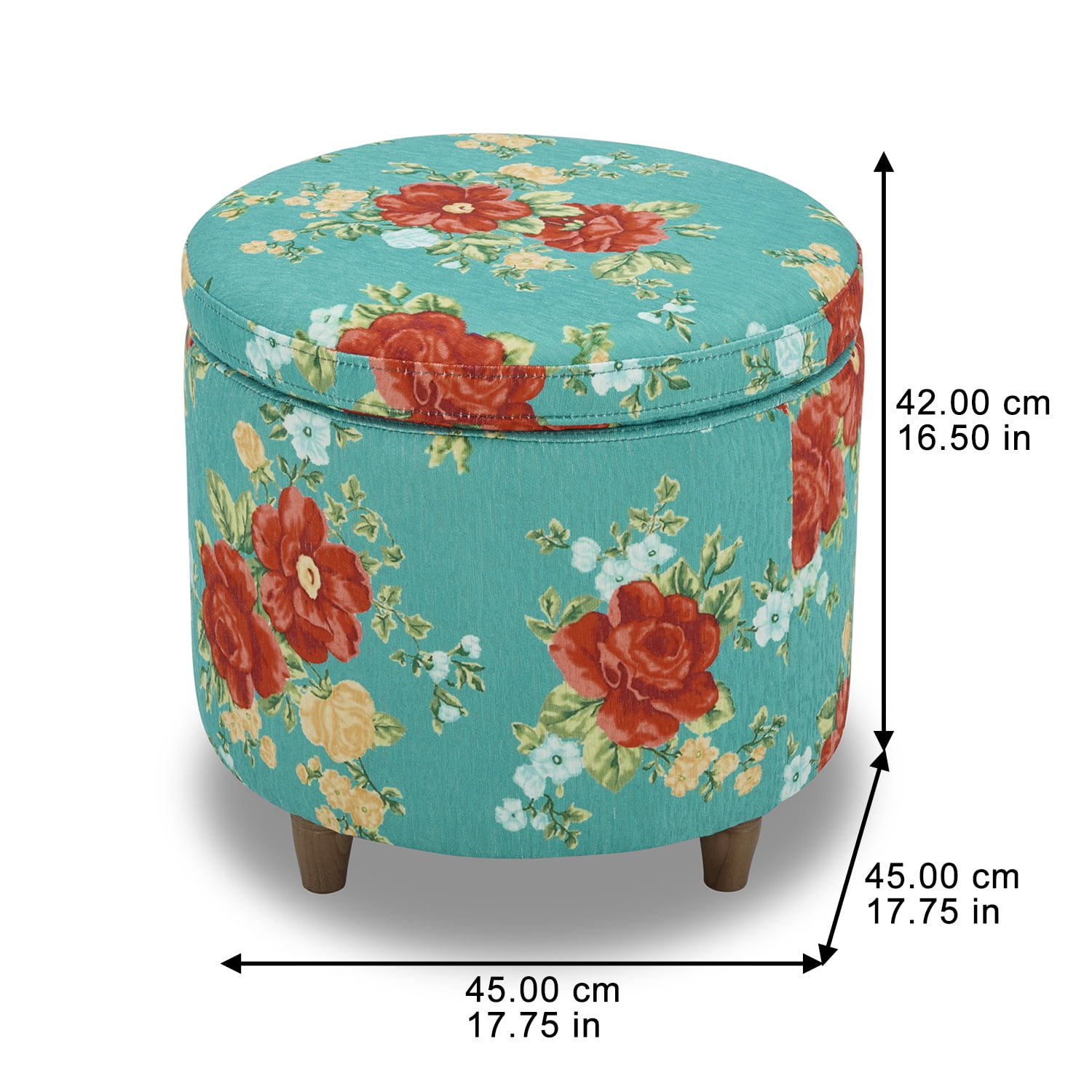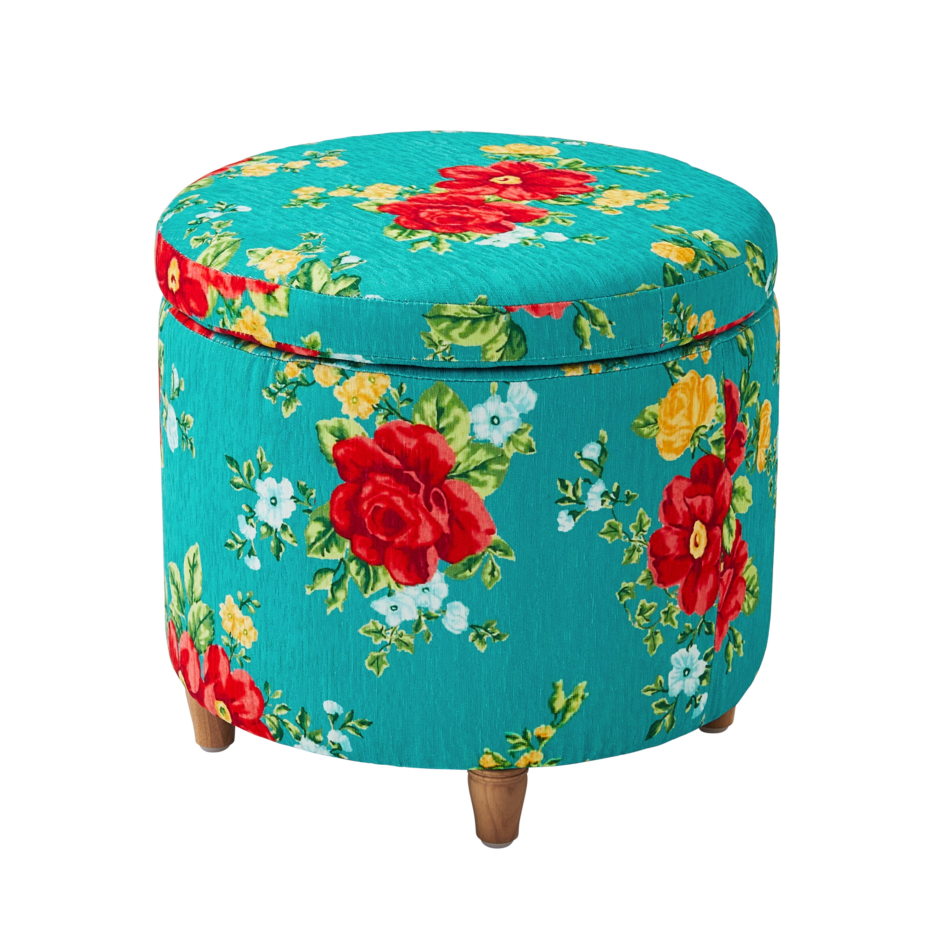 The Pioneer Woman Vintage Floral Fabric Round Storage Ottoman, Teal Features one of Ree’s signature floral patterns Classic round shape Solid hardwood construction with reinforced joints Premium high density foam cushions with no sag seat suspension for quality you can trust Easy assembly – simply attach legs to base