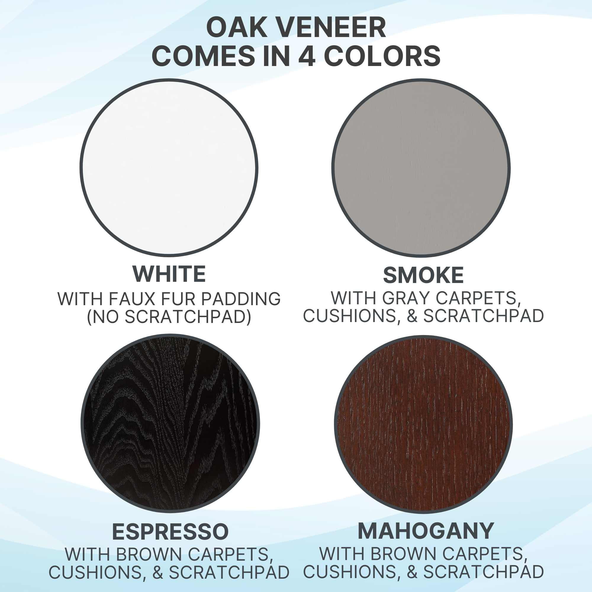 Manufactured in Ply with Oak veneer for strength. Stained to resist scratches. Berber carpet attached with Velcro-like material. Carpet is replaceable if worn. Sisal pad is perfect for scratching. Soft cushions with washable faux suede covers above and inside hide-a-way cubby.
