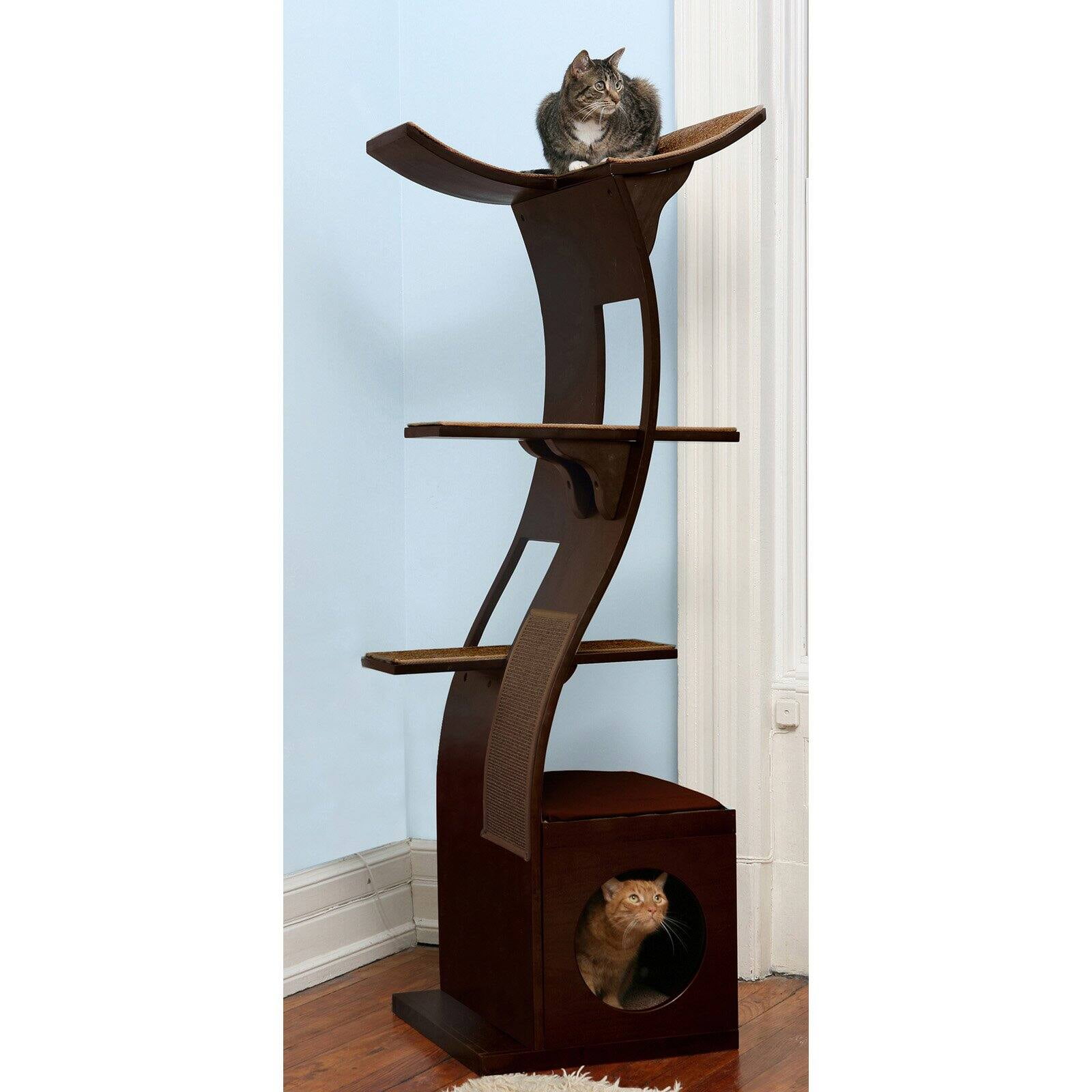 A sleek, organic design, the Lotus Cat Tower is a modern take on cat furniture. Its Zen-like design blends symmetry, functionality, and minimalism into a beautiful, “flowering” tower. This design accents decors with modern flair or those eclectic homes that have incorporated the minimalist movement. Cats can easily climb its stepped platforms, lined with berber carpet that can be replaced when worn. For those cats who like to nestle low to the ground, the cushioned hide-a-way cubby gives them the purrfect place to curl into. Plush cushions for cat naps are covered with machine washable micro suede. You’ll find the Lotus Cat Tower to be a work of art while your cats will enjoy it as their favorite place to play and perch.