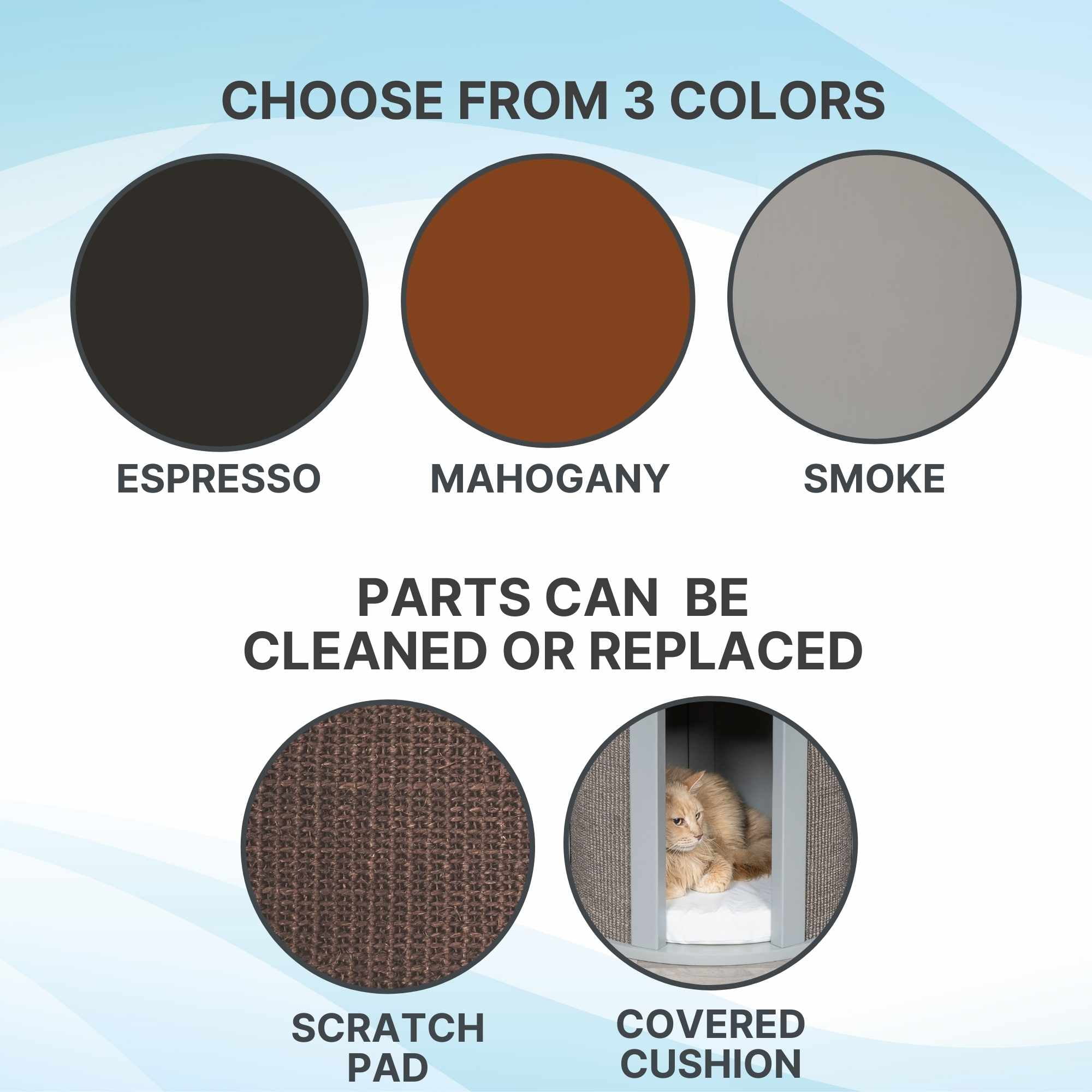 The Purrrrfect End Table from The Refined Feline is not only a cozy bed for your cat to nestle into, but also doubles as an elegant end table or night stand. Two curved 8” wide sisal panels provide your cat a purrrrfect place to scratch when they are not inside taking a catnap. The machine washable plush cushion gives kitties a soft spot to curl into while feeling safe. If the sisal panels wear or the cushion stains, no problem, replacement parts are available. An inner adjustable shelf is provided for added storage for your remote control, magazine, or you cat’s favorite toy. It’s feline furniture you and your cat can appreciate.